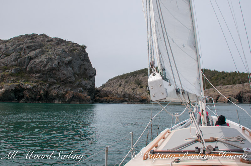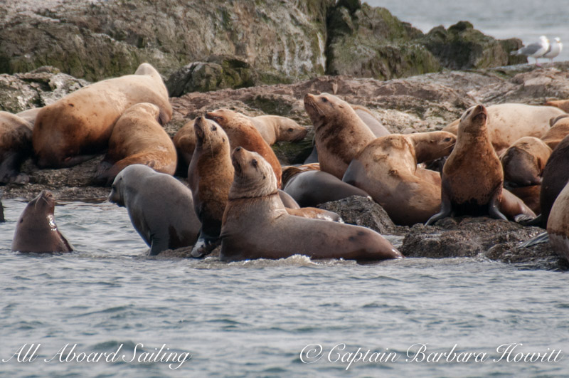 A sun shining day and we caught the end of the ebb South from Fishermans Harbor. Moderate to light wing on wing downwind sailing through Cattle Pass. The largest raft of Steller sea lions met us and took to following us. Picked up the flood to sail a beam reach to our favorite haunts of South Lopez – the coves, passes and islands home to so much wildlife.