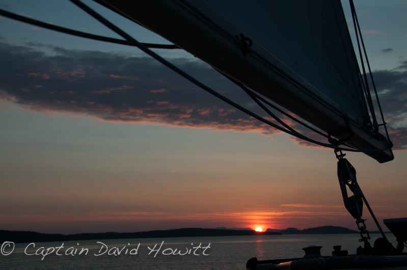 Newlywed couple sails North to Lovers Leap for their honeymoon; appropriate! Drift sailing passed the geological fascinating Flattop Island we were joined by the usually shy Harbor Porpoise. These shy animals boast the largest penis to body size of any mammal; inappropriate? Sailing with the sunset through Wasp Pass made for a spectacular memorable day.