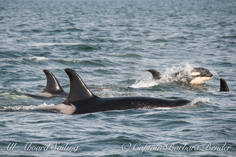 Hard Core. We used the moderate to strong winds and the big ebb and flood to cover serious ground and watch serious whales. Sidney Channel – J34, Doublestuf, continual breaches and cartwheels expressed the power of the day. His mom, J22, similarly cartwheeled and even the kids were having fun. Vocalizing while fishing and exuberant with the exciting whitecaps. A thrill and an honor to sail in their presence. We broke away to meet the breakaway group, the J16’s, in the white caps off Blunden Island, Canada. They surprised us by turning with us towards San Juan Island as we plowed a beam reach homeward across Boundary Pass through sunset. We left them as darkness drew in nearing Ripple island. Moonrise sail down San Juan Channel – What a day