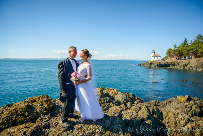 Today is the big day! Captains David and Barbara are getting married! The ceremony took place at Spring Street Landing in Friday Harbor aboard our sailboat “Peniel”. Family and friends gathered on the dock to watch us exchange our vows and tie the knot. Following our wedding ceremony we headed to Lime Kiln Point State Park for a relaxing picnic, and the whales showed up right on time. Perfection. Our good friend Erin Corra with F.O.L.K.S. invited us to the top of the lighthouse to celebrate. Before our dinner reception we sailed away aboard Peniel to get some amazing photographs as the sun set. Our photographer Alan Niles was fantastic. Alas, it was time for dinner and the best part of the day… time to enjoy our special wedding cake with blown glass orca toppers made locally by Crisanti Glass. It was the best wedding ever! 🙂