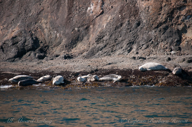 July 1, 2017 – We caught up with transient orcas known as the T49As in Spieden Channel as they were eating their meal. Sailed downwind with the whales along the shore of Spieden and found a brand new harbor seal pup. Circumnavigated Stuart Island returning via Johns Pass to see a beautiful sunset.