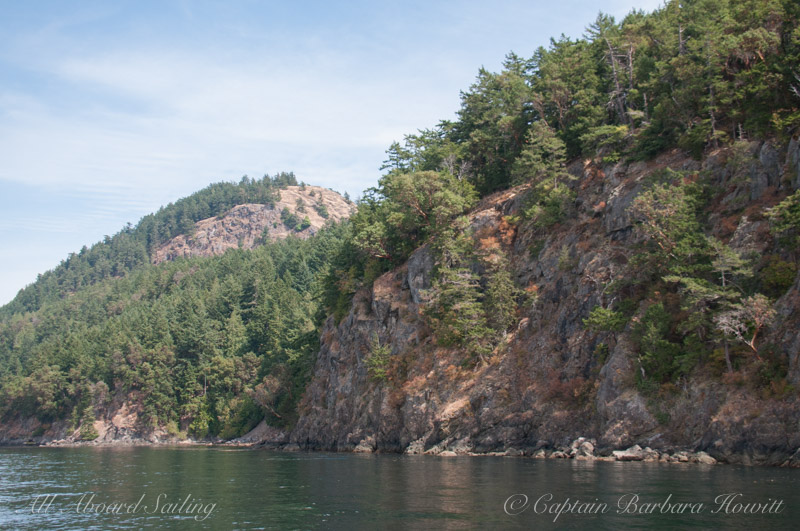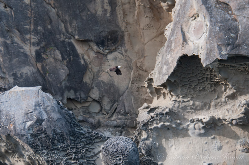 August 14, 2017 – Beautiful sail north up Presidents Channel hugging the Orcas Island forested shoreline. We ventured a long way up into Canada to meet the transient orca family known as the T46’s. The whales were spread out in travel mode heading up Georgia Strait with the Coal Docks in the background behind them. Spectacular scenery on Saturna Island including many harbor seals with a honeycomb sandstone backdrop and bald eagle chicks calling to their parents. All of this was followed by a gorgeous sunset. As we say, “every trip is different”.