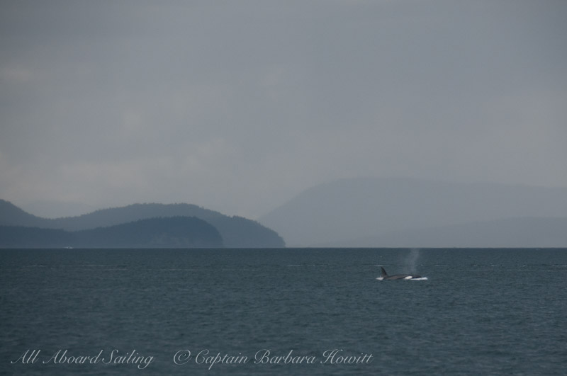 June 9, 2018 – There were transient orcas everywhere today – including outside of Friday Harbor. Barbara and Erin took the skiff out to get a look at the orcas at a different perspective before meeting up with David on Peniel. The T75B’s and T75C’s were with the T49A’s minus T49A1 traveling up San Juan Channel. He split off with the others (T65A’s & T37A’s) who decided to take Upright Channel instead. Interesting lighting conditions as a distant rain cloud headed our direction. The T49A’s hugged the Orcas coastline while the T75B’s and C’s were on the opposite side of Presidents Channel near Waldron. Rains came and went and we headed for home under blue skies.