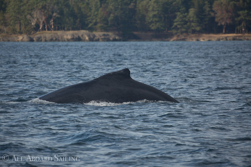 The heavy rain shower had passed and the seascape and shorelines were gorgeous. We drifted with wing on wing sailing slowly through New Channel admiring the forest and found bald eagles and a Peregrine falcon. As we entered Haro Strait we found the humpback whale MMX0007 “Bond” at Danger Shoal. We stayed with the whale a while while he/she circled the area.