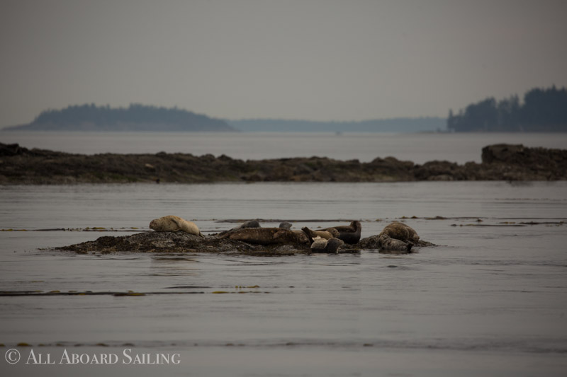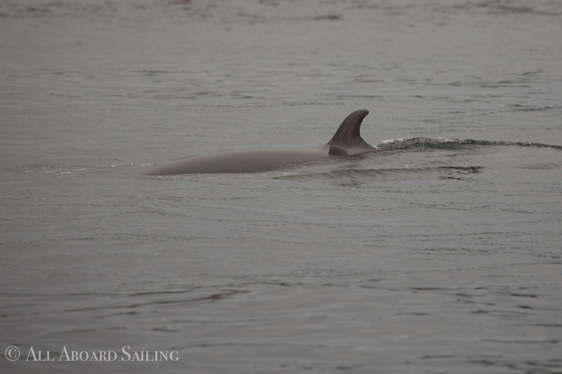 September 4, 2021 – After leaving the harbor we had thoughts to go south after hearing of a minke whale to the south in San Juan Channel. However, after we passed Turn Rock, another whale watch boat spotted a minke outside Friday Harbor going north. Bugger! We must have missed it. So, we came about and went north finding the minke just south of Yellow Island. The whale was a bit slippery and we lost sight of him after about 30 minutes. But, we got some nice looks at the whale. We continued north to New Channel where the water was glassy. Cut through the Cactus Islands and the pass by Ripple Island. Rain was coming so we offered rain gear and umbrellas to guests. After a sail by Flattop Island we made tracks back to the barn.
