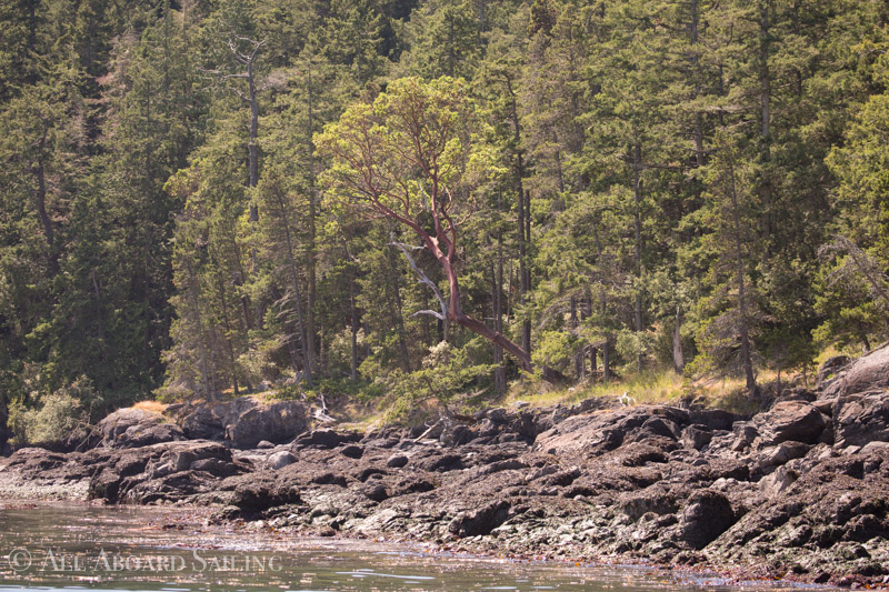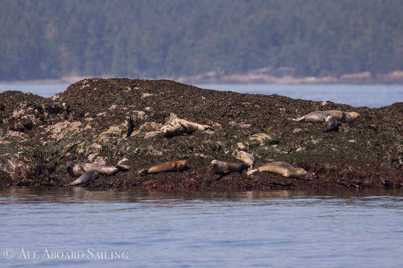 July 13, 2022 – This morning we had a short sail with local friends and their visiting family. We had plans to go to Yellow Island on a shore excursion, but the tide was very low leaving a long slippery trek to get to shore. For everyone’s safety we decided to skip the shore excursion and take the passengers and little ones on a fun skiff ride instead. Many bald eagles and turkey vultures were busy on Low Island engaged in eating something. Perhaps a placenta from a brand new harbor seal pup just born.