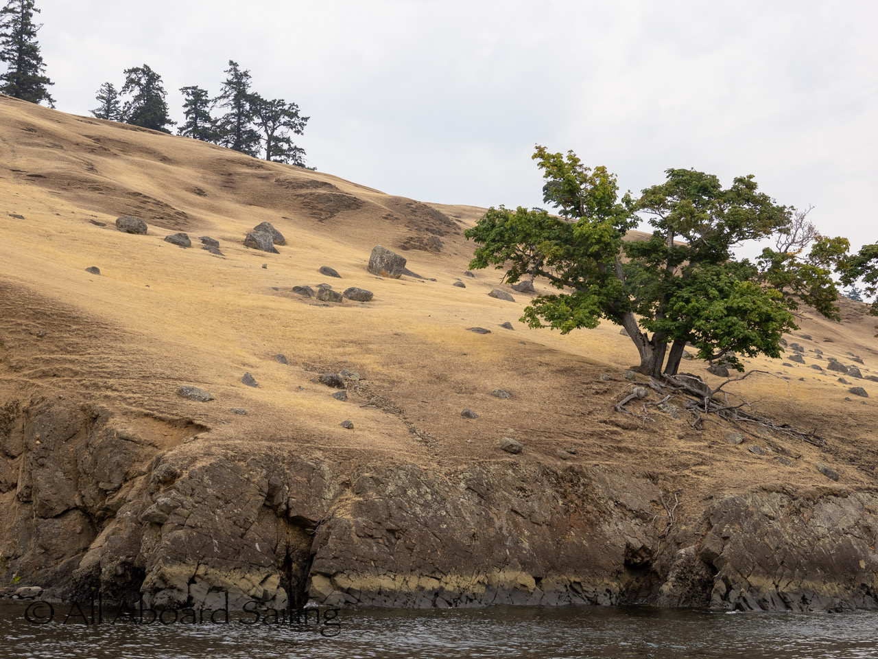 August 25, 2023 – We had a brisk close hauled sail into wind with the flood current in our favor. Tacking in the group of islets we call the Wasp Islands where seals were hauled out on Shirt Tail Reef and then North passing Jones Island State Park. At Flattop National Wildlife Refuge we had lovely views of harbor seals resting on honeycombed sandstone on the South side with bald eagles roosting on the North. From here we headed West to Ripple Island, the Cactus Islands and the North shoreline of Spieden Island. Harbor seals rested in beds of kelp, many eagles in Madrone and Douglas Fir trees, and black oystercatchers and belted kingfishers were vocalizing. We rounded Spieden Island and headed home through light misty rain which cleared a little of todays haze from the Canada wildfires.