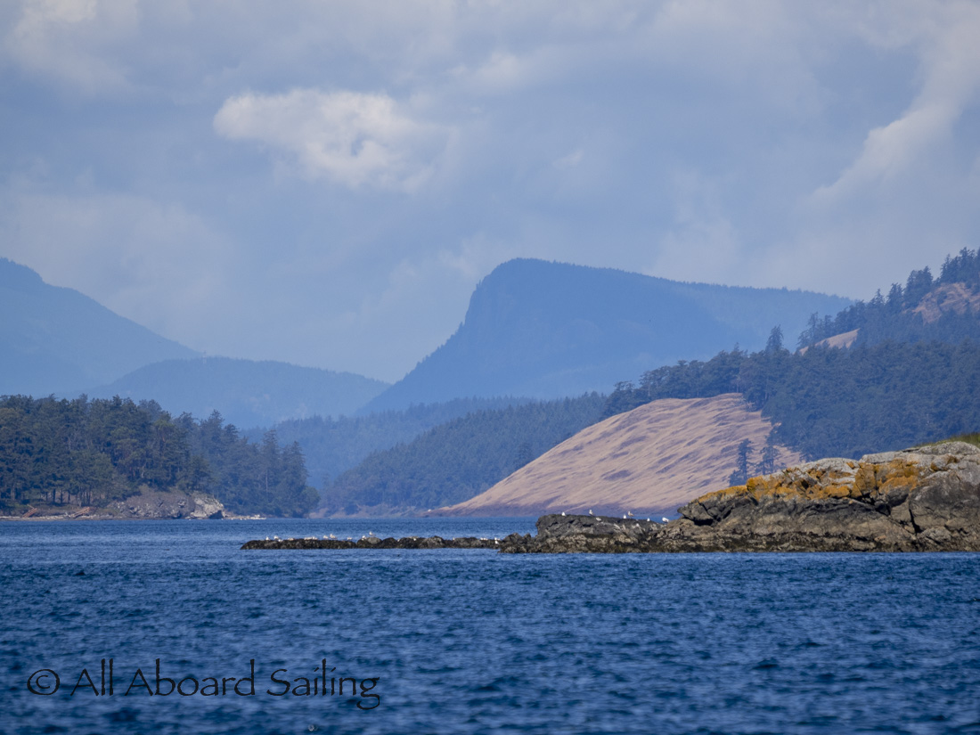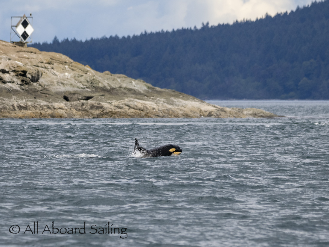May 29, 2024 – After casting off we had a nice sail across the channel as we headed North. At Flattop Island we had a good look at a bald eagles nest, harbor seals, black oystercatchers and pigeon guillemots. At White Rock a pair of bald eagles stood atop the rock above a bunch of harbor seals resting on the island. A report of orcas near East Point came in so we headed that direction. These orca were soon identified as Southern Resident orcas. Another report came in of orcas eastbound from Battleship Island which were Biggs Orcas T124A’s and another report possibly of the T123’s by Mail Bay, Waldron Island. The orcas by Waldron crossed President Channel and turned Northeast away from us. We changed course and headed to Green Pt, Spieden Island, and got there in time to see the T124A’s. They passed very close to shore passing some Steller sea lions in the water before continuing north. We had some nice views before changing course back to Friday Harbor for our next sail.