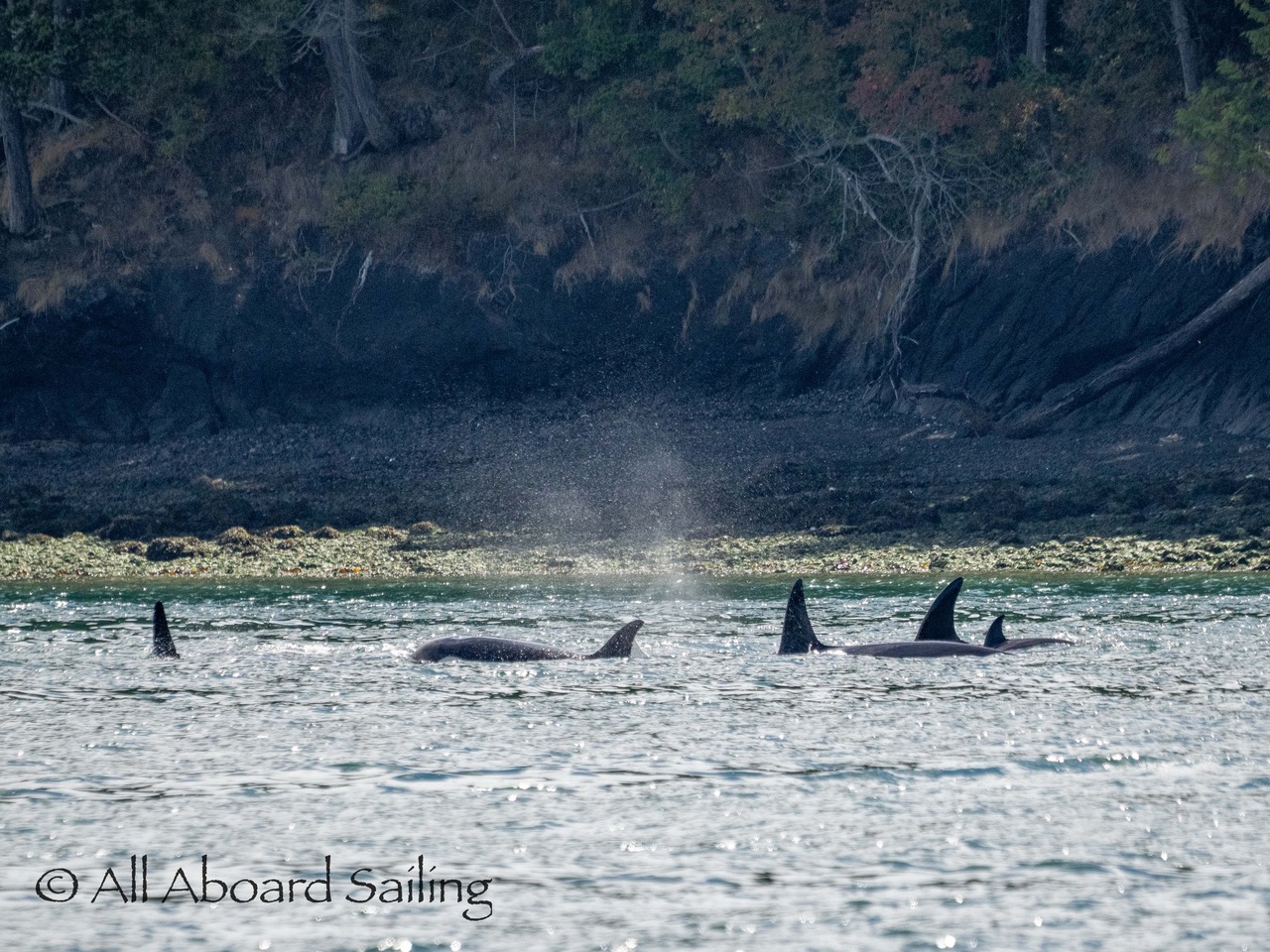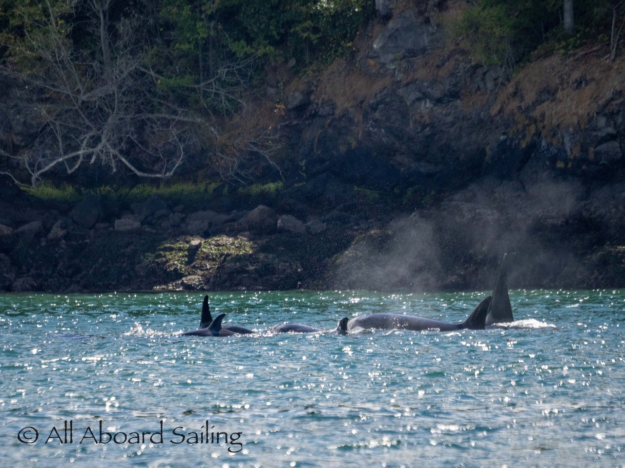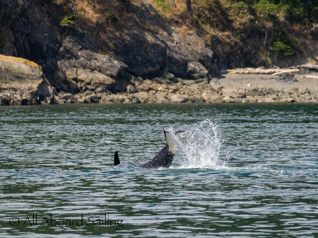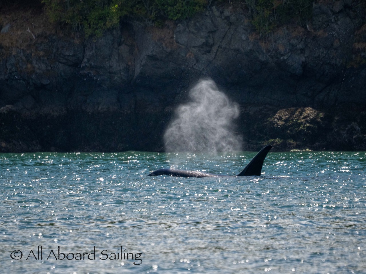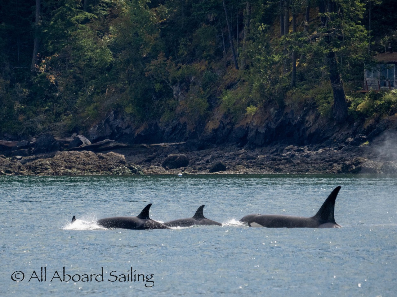 August 8, 2025 – There was a report of Biggs/Transient orcas T109A’s in Lopez Sound. We sailed across to Shaw Island and up Upright Channel to meet the orcas near Thatcher Pass. Slow travel and socializing their way through the pass with a maze of boats and ferries. They turned and went back into the pass and we left them to continue drifting the strong current along the forested shoreline of Blakely Island. Coming back through Peavine Pass we met the orcas again in Upright Channel as they were finishing a hunt. Tacked our way inside Canoe Island seeing the orcas one more time as they traveled up the Shaw Island coastline in San Juan Channel.
