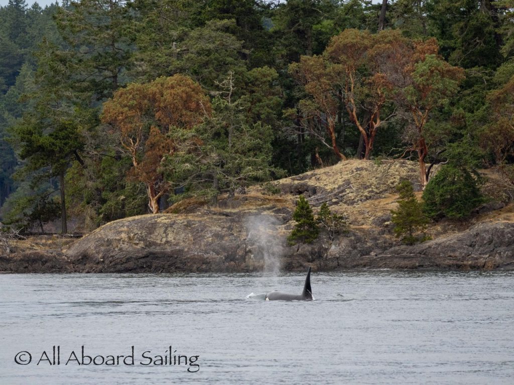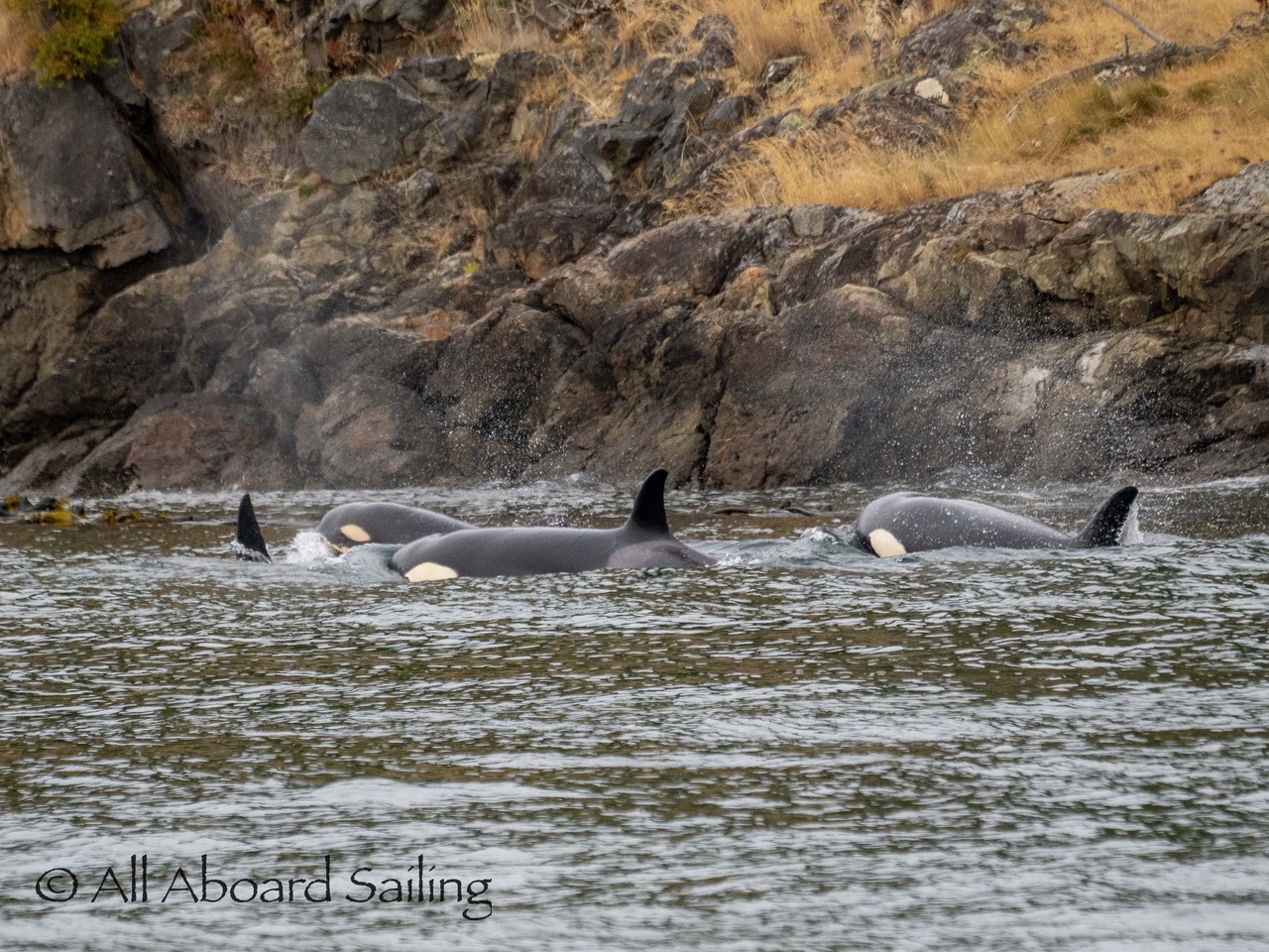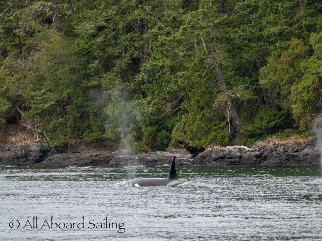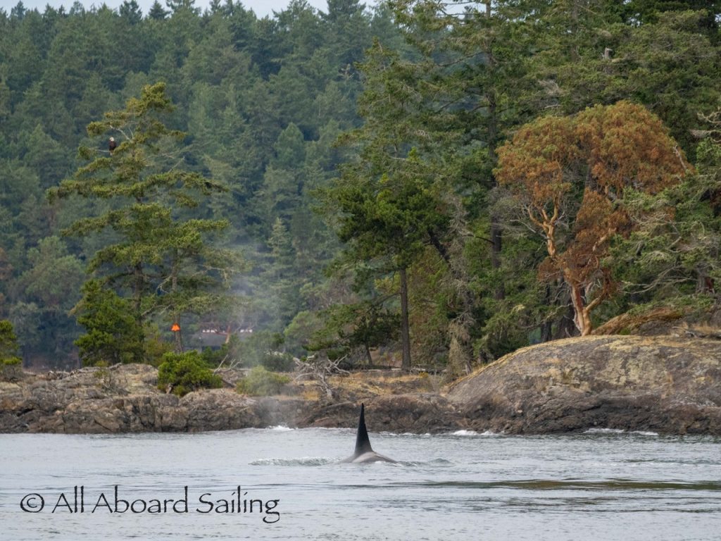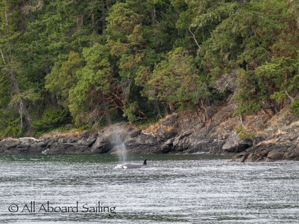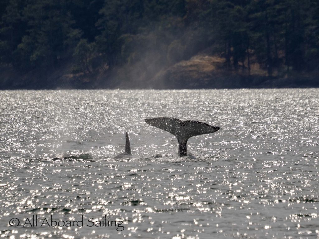 August 8, 2025 – There was a report of Biggs/Transient orcas T109A’s in Lopez Sound. We sailed across to Shaw Island and up Upright Channel to meet the orcas near Thatcher Pass. Slow travel and socializing their way through the pass with a maze of boats and ferries. They turned and went back into the pass and we left them to continue drifting the strong current along the forested shoreline of Blakely Island. Coming back through Peavine Pass we met the orcas again in Upright Channel as they were finishing a hunt. Tacked our way inside Canoe Island seeing the orcas one more time as they traveled up the Shaw Island coastline in San Juan Channel.