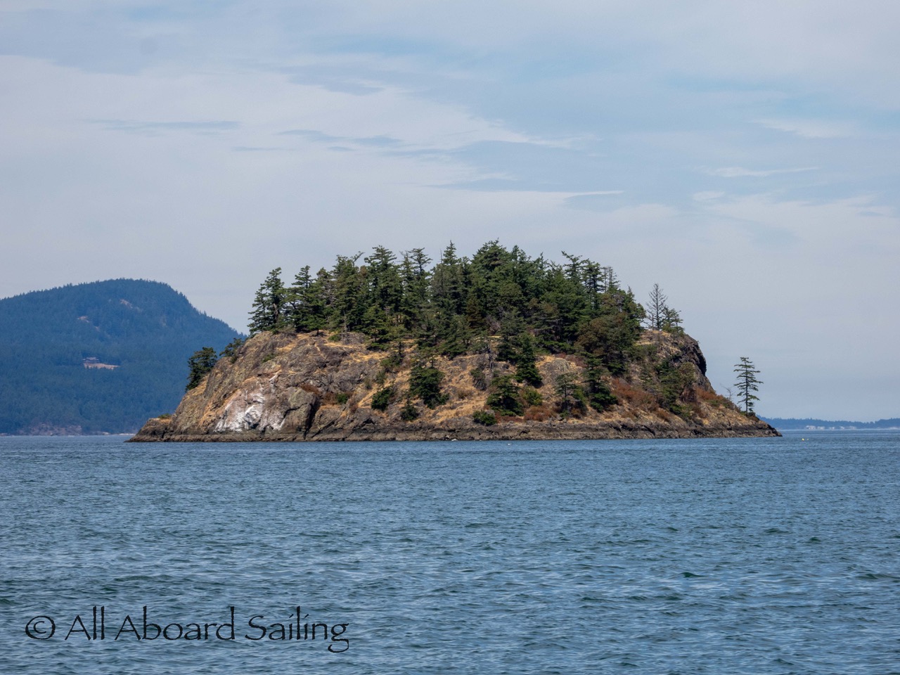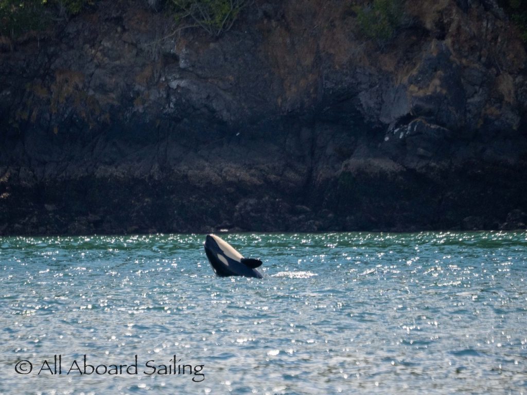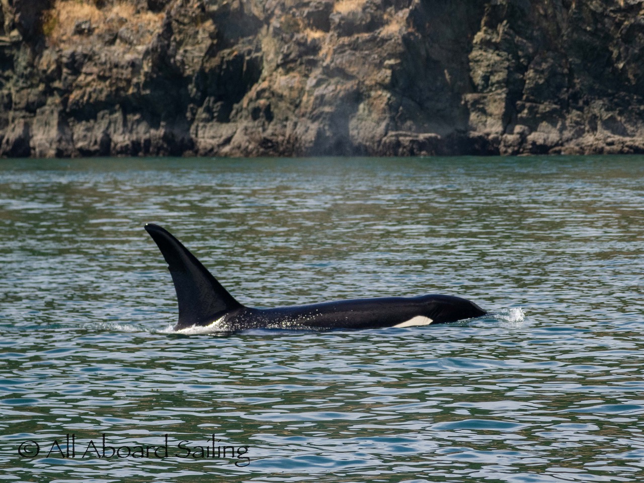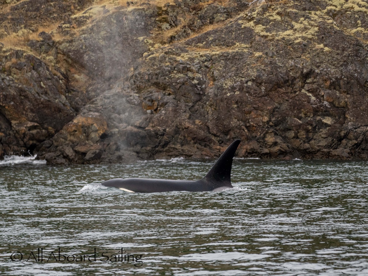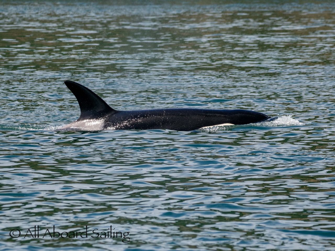 August 8, 2025 – There was a report of Biggs/Transient orcas T109A’s in Lopez Sound. We sailed across to Shaw Island and up Upright Channel to meet the orcas near Thatcher Pass. Slow travel and socializing their way through the pass with a maze of boats and ferries. They turned and went back into the pass and we left them to continue drifting the strong current along the forested shoreline of Blakely Island. Coming back through Peavine Pass we met the orcas again in Upright Channel as they were finishing a hunt. Tacked our way inside Canoe Island seeing the orcas one more time as they traveled up the Shaw Island coastline in San Juan Channel.