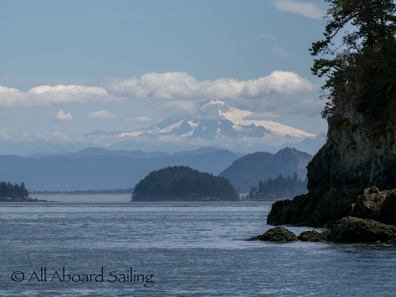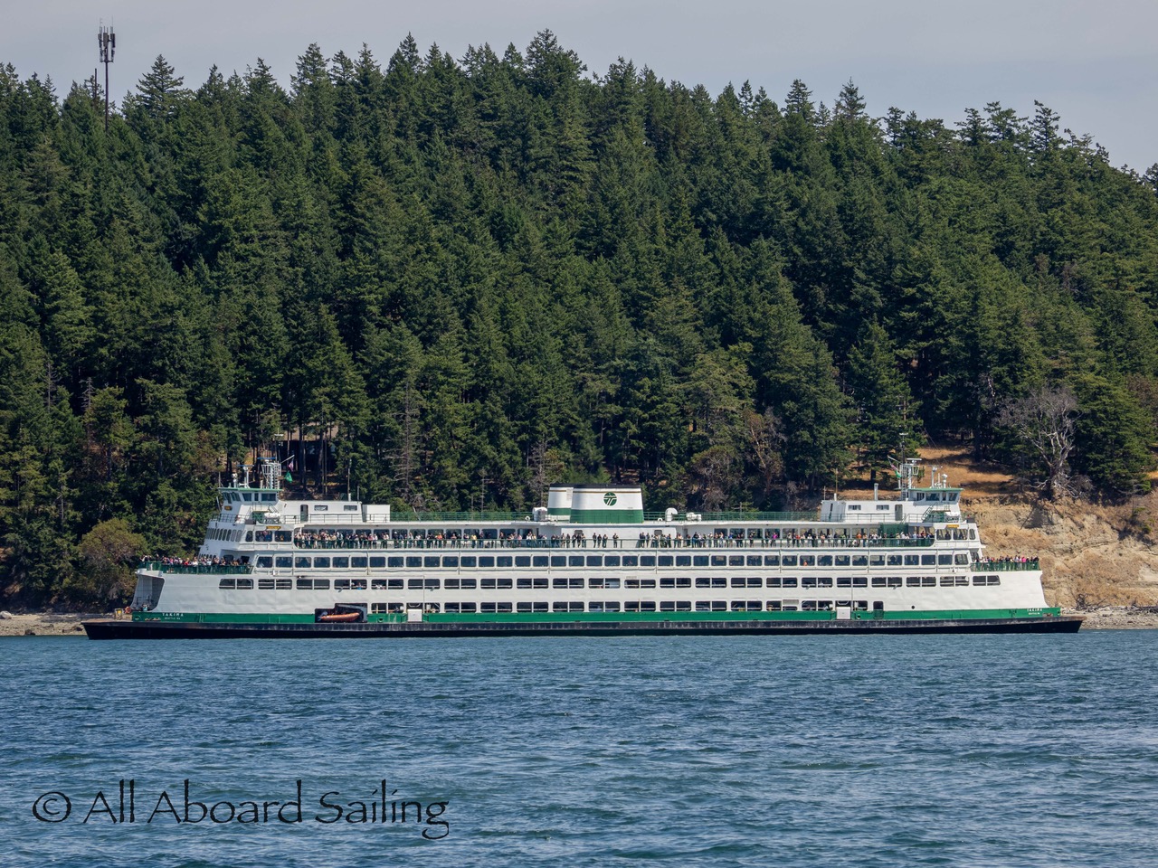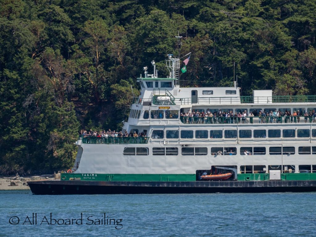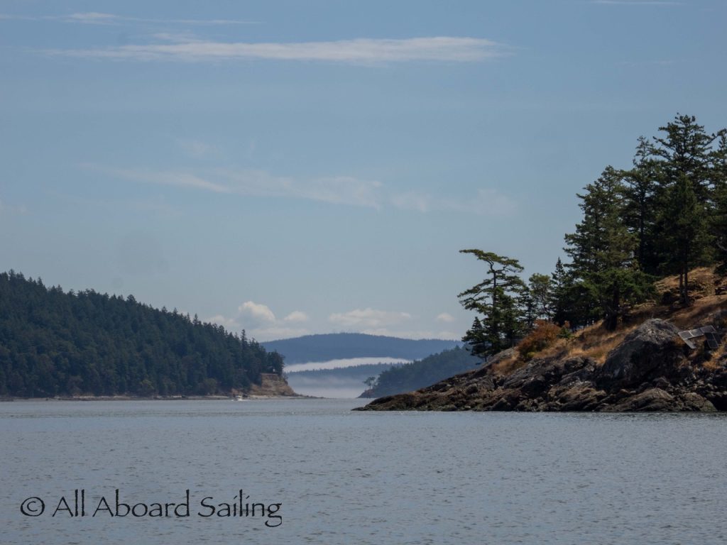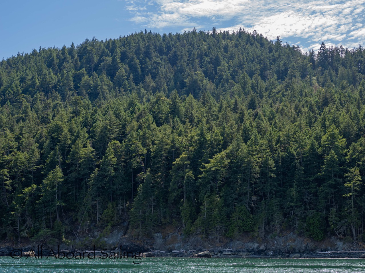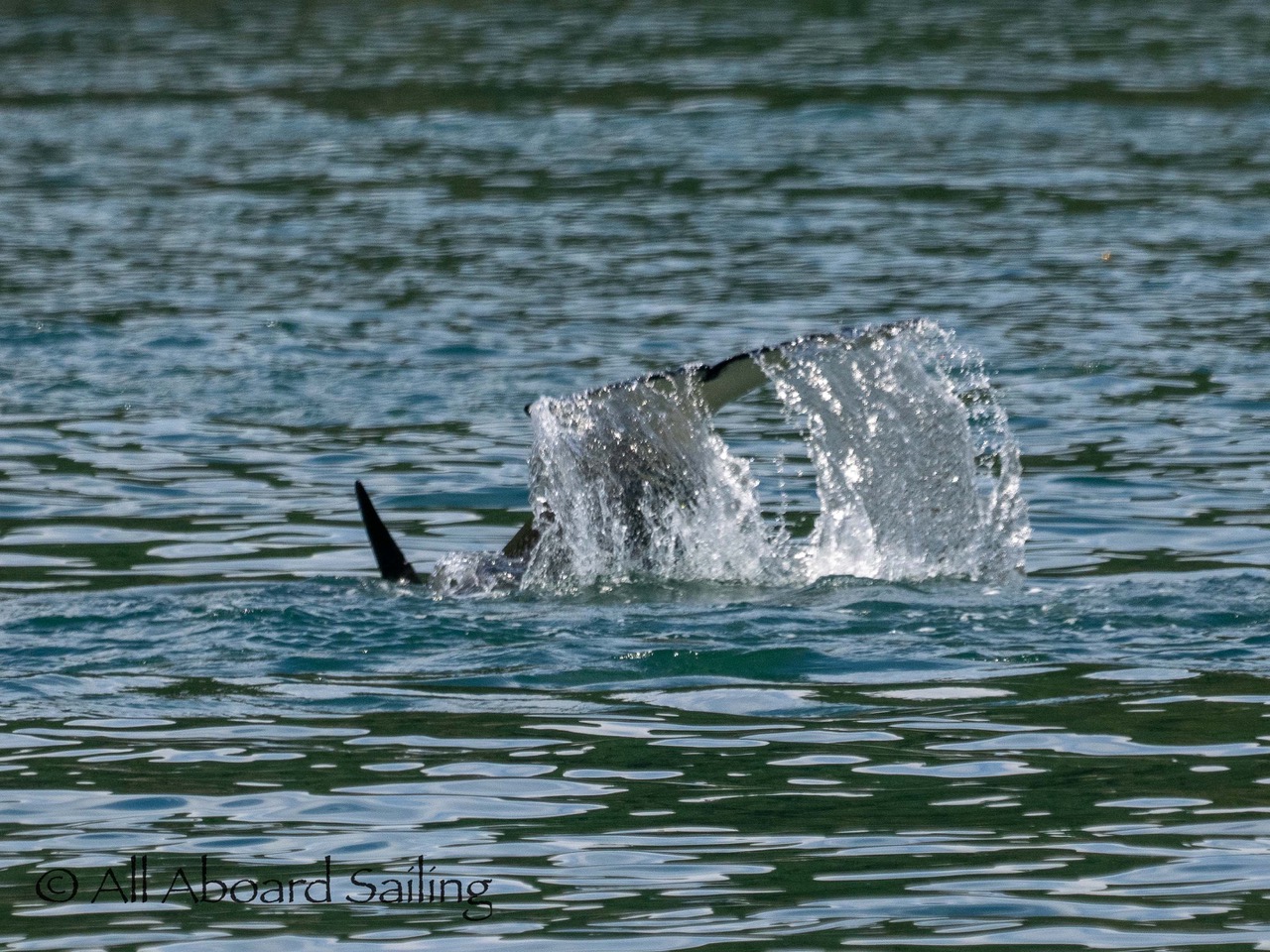August 8, 2025 – There was a report of Biggs/Transient orcas T109A’s in Lopez Sound. We sailed across to Shaw Island and up Upright Channel to meet the orcas near Thatcher Pass. Slow travel and socializing their way through the pass with a maze of boats and ferries. They turned and went back into the pass and we left them to continue drifting the strong current along the forested shoreline of Blakely Island. Coming back through Peavine Pass we met the orcas again in Upright Channel as they were finishing a hunt. Tacked our way inside Canoe Island seeing the orcas one more time as they traveled up the Shaw Island coastline in San Juan Channel.