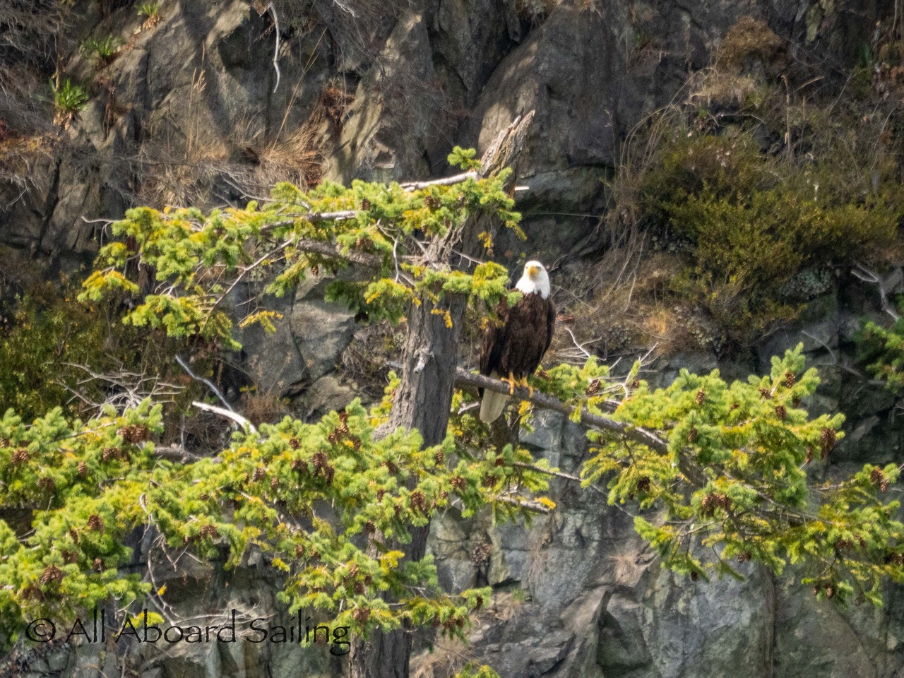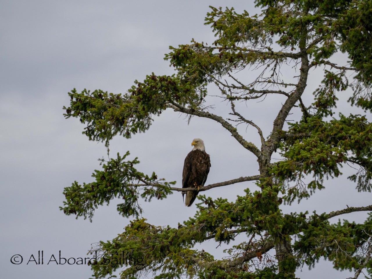 Biggs/Transient orcas T109A’s along Shaw Island coastline with bald eagle watching