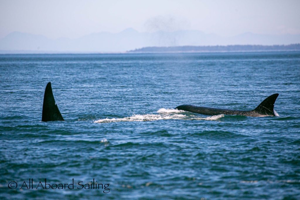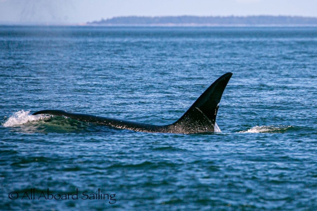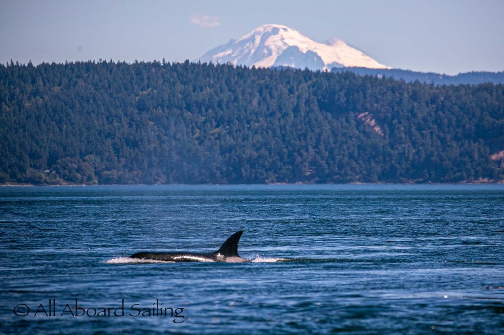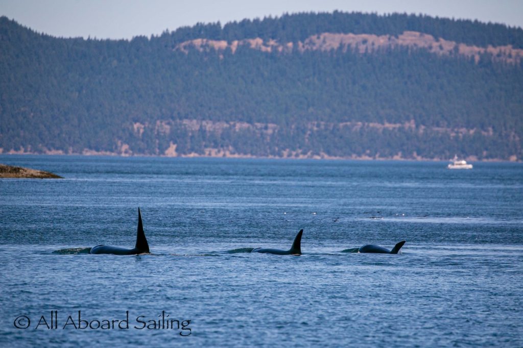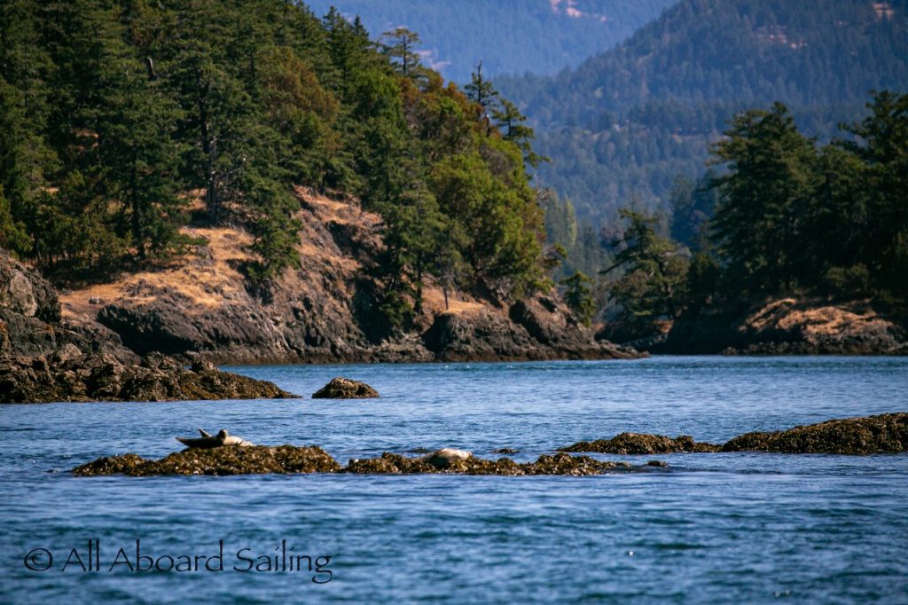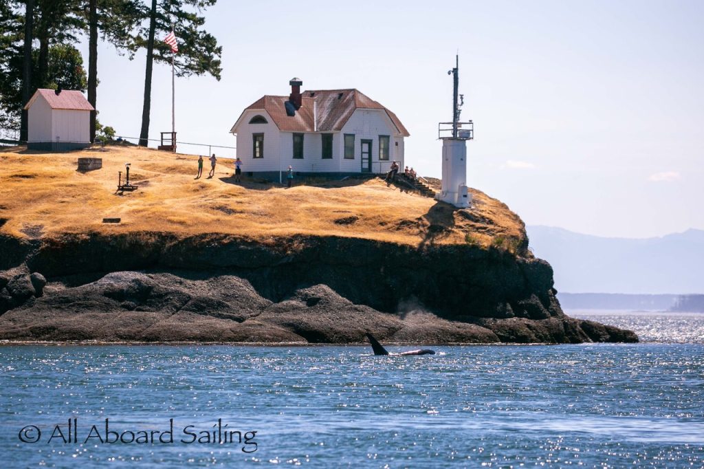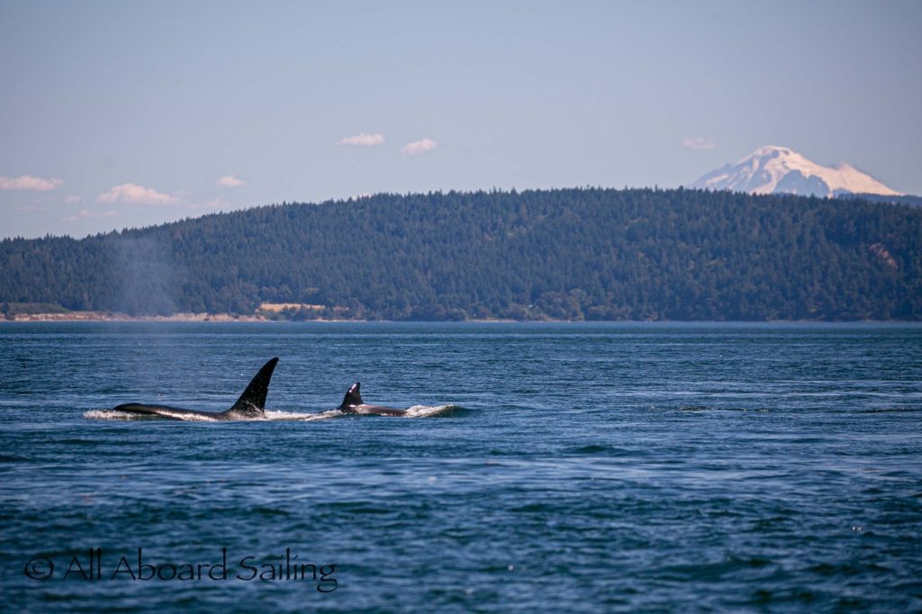 August 12, 2025 – With news of Biggs/Transient orcas T37A’s northbound in Haro Strait we headed north. We sailed through the Wasp Islands seeing harbor seals then up to Jones Island and over to the Spieden Island shoreline. We met the orcas as they crossed to Sentinel Island and rounded into New Channel. All the kids of Johns Island Camp Norwester came down to the shoreline to watch. The orcas took Johns Pass and we continued with them until we reached Turn Pt Lighthouse. Rounding Turn Pt and close into Lovers Leap taking the Stuart Island shoreline back to New Channel where we enjoyed drifting the calm fast moving waters. Over to Flattop Island where more harbor seals were hauled out warming in the sunshine before making our way back to Friday Harbor.