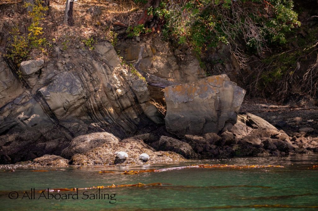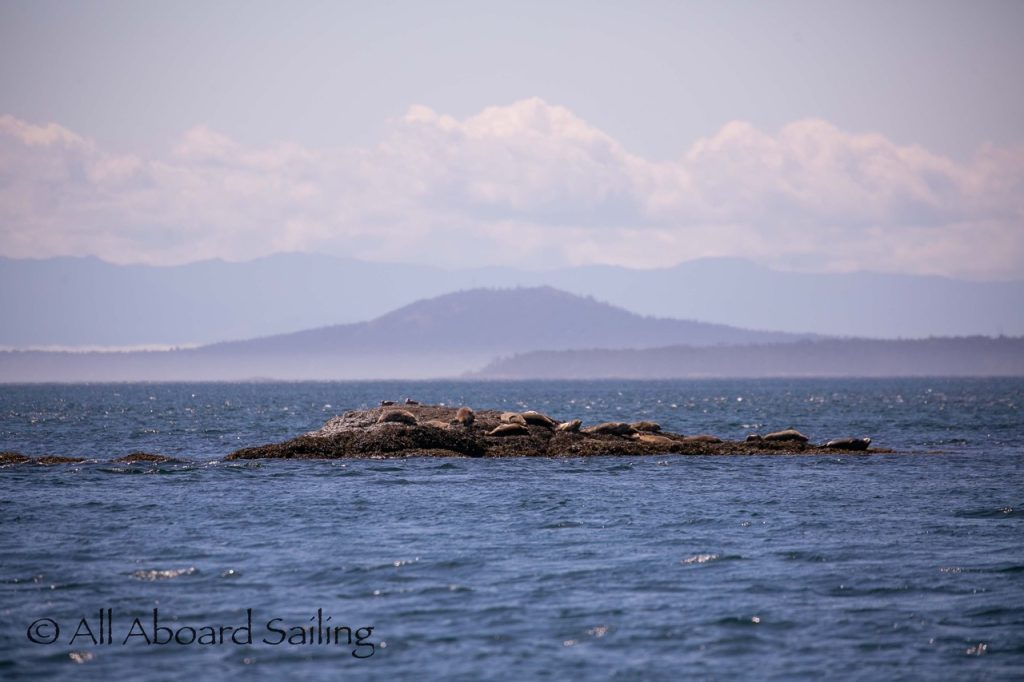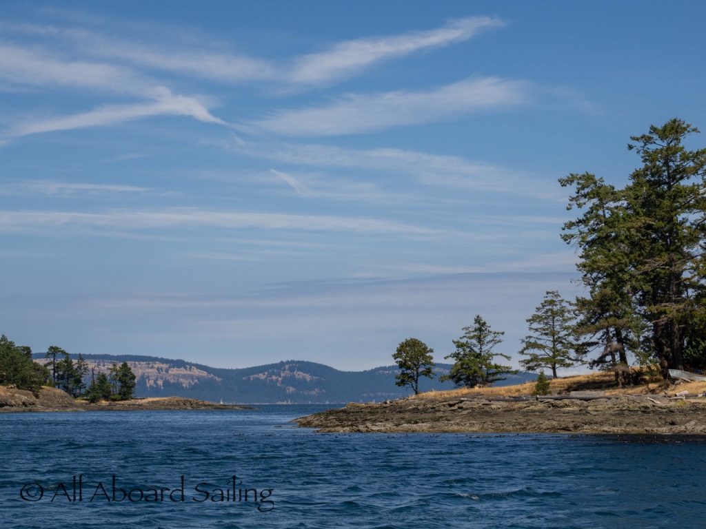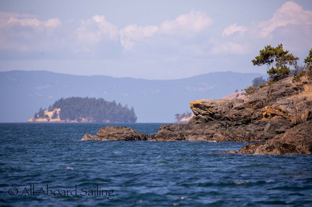 August 13, 2025 – Great winds for sailing. After picking up our passengers from Orcas Island we sailed through the Wasp Islands and towards New Channel. We drifted the north coast of Spieden Island, tacked and sailed through Johns Pass, and came east along the north side of Johns Island. Cut through the narrow pass by Ripple Island with the aspen grove, passed the kelp forest at the Cactus Islands and sailed across to the honeycombed sandstone geology at Flattop Island. Sailed down to Jones Island and used the iron genny for the last leg to make our way back through the Wasp islands to Orcas Island to drop off our passengers. A great full day of sailing almost the entire day.