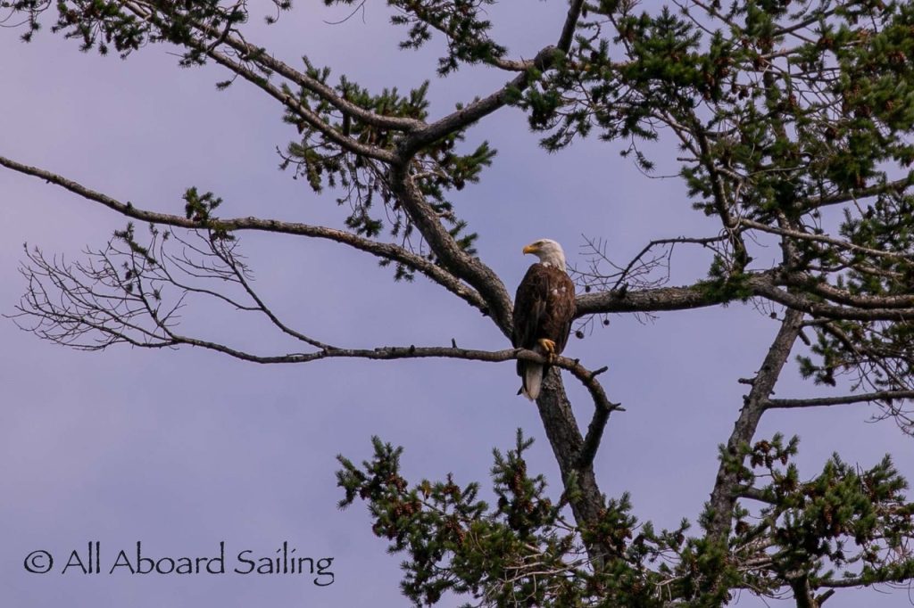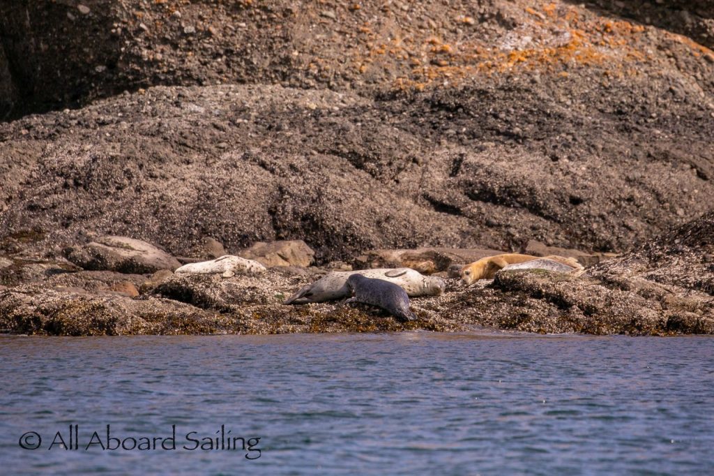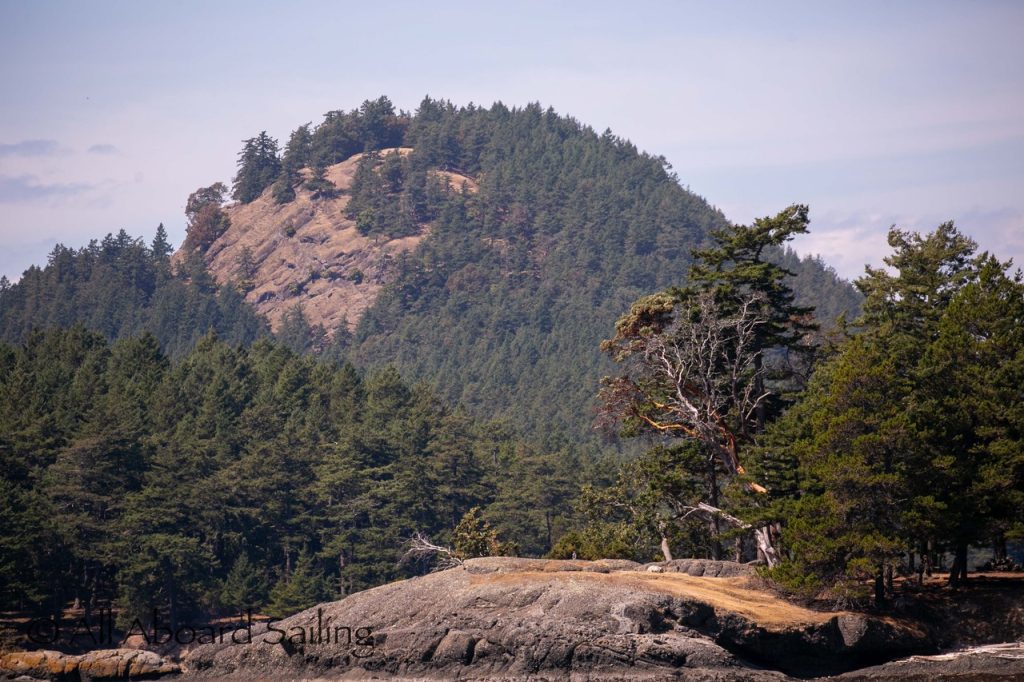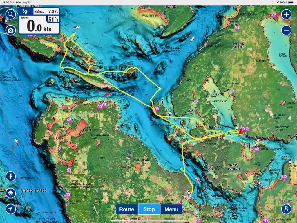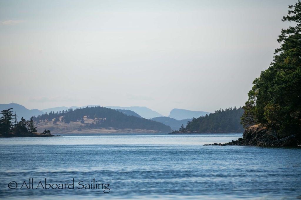 August 13, 2025 – Great winds for sailing. After picking up our passengers from Orcas Island we sailed through the Wasp Islands and towards New Channel. We drifted the north coast of Spieden Island, tacked and sailed through Johns Pass, and came east along the north side of Johns Island. Cut through the narrow pass by Ripple Island with the aspen grove, passed the kelp forest at the Cactus Islands and sailed across to the honeycombed sandstone geology at Flattop Island. Sailed down to Jones Island and used the iron genny for the last leg to make our way back through the Wasp islands to Orcas Island to drop off our passengers. A great full day of sailing almost the entire day.