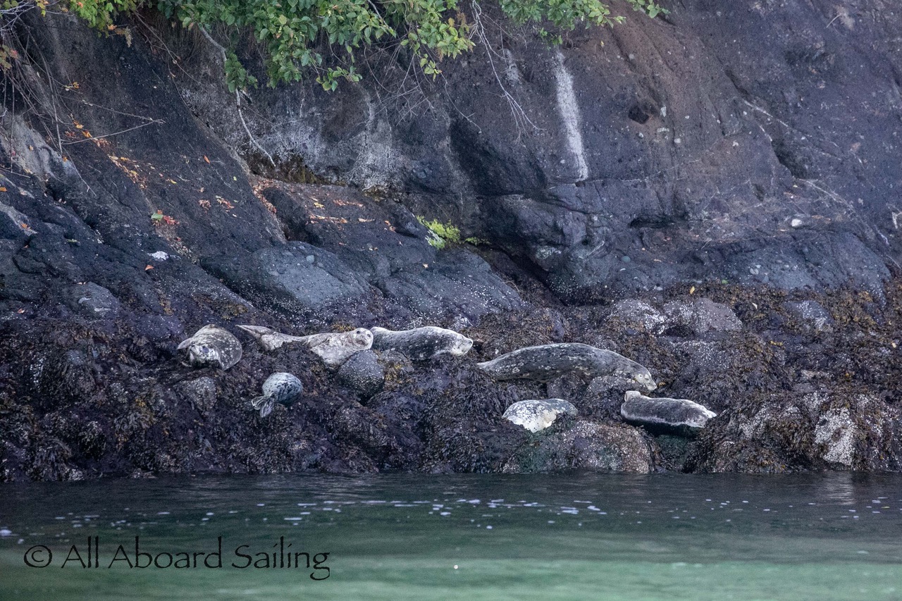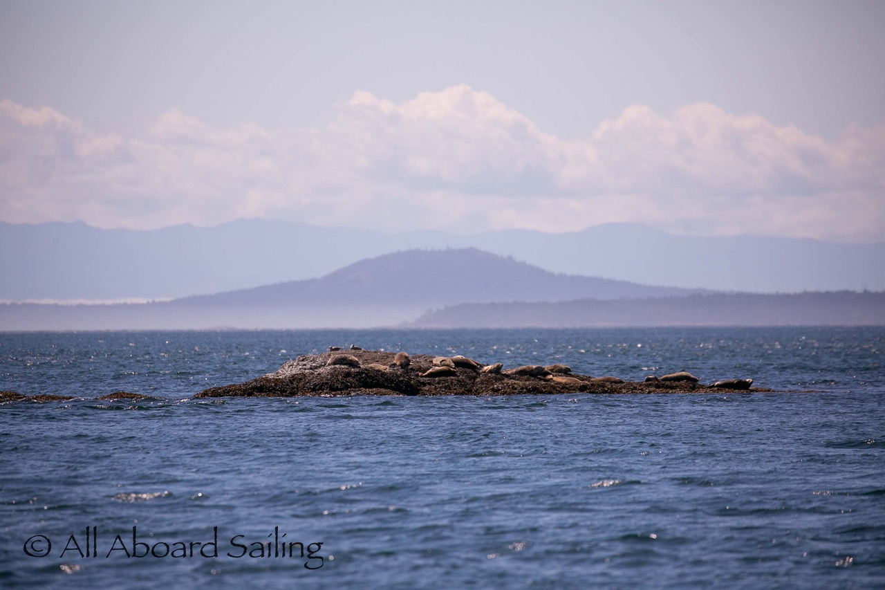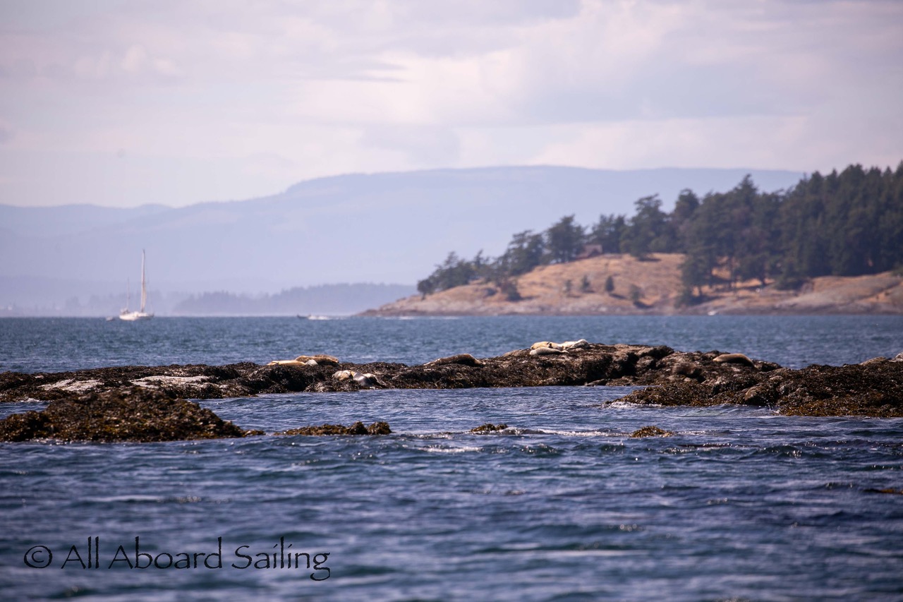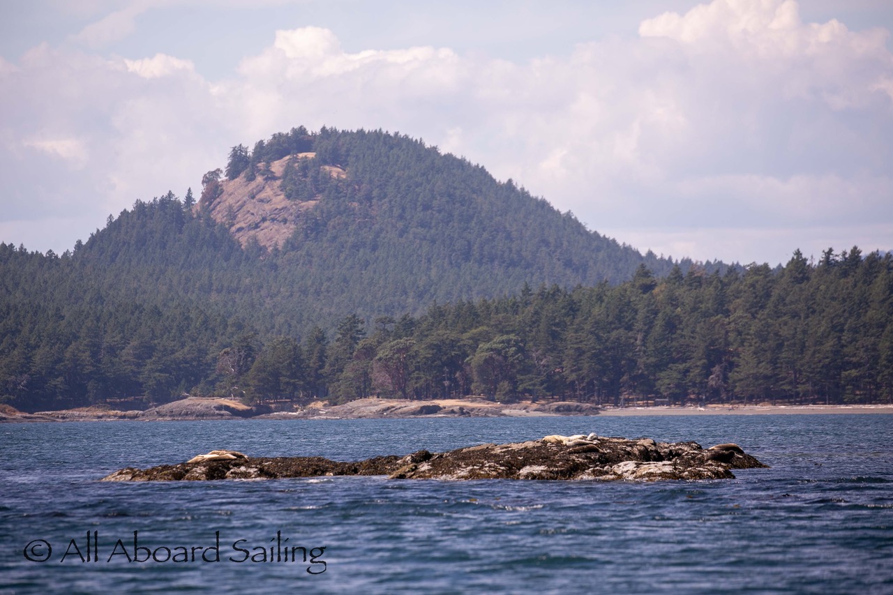 August 13, 2025 – Great winds for sailing. After picking up our passengers from Orcas Island we sailed through the Wasp Islands and towards New Channel. We drifted the north coast of Spieden Island, tacked and sailed through Johns Pass, and came east along the north side of Johns Island. Cut through the narrow pass by Ripple Island with the aspen grove, passed the kelp forest at the Cactus Islands and sailed across to the honeycombed sandstone geology at Flattop Island. Sailed down to Jones Island and used the iron genny for the last leg to make our way back through the Wasp islands to Orcas Island to drop off our passengers. A great full day of sailing almost the entire day.