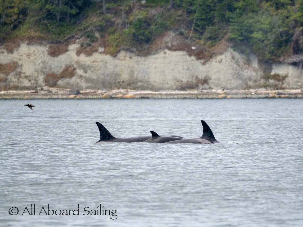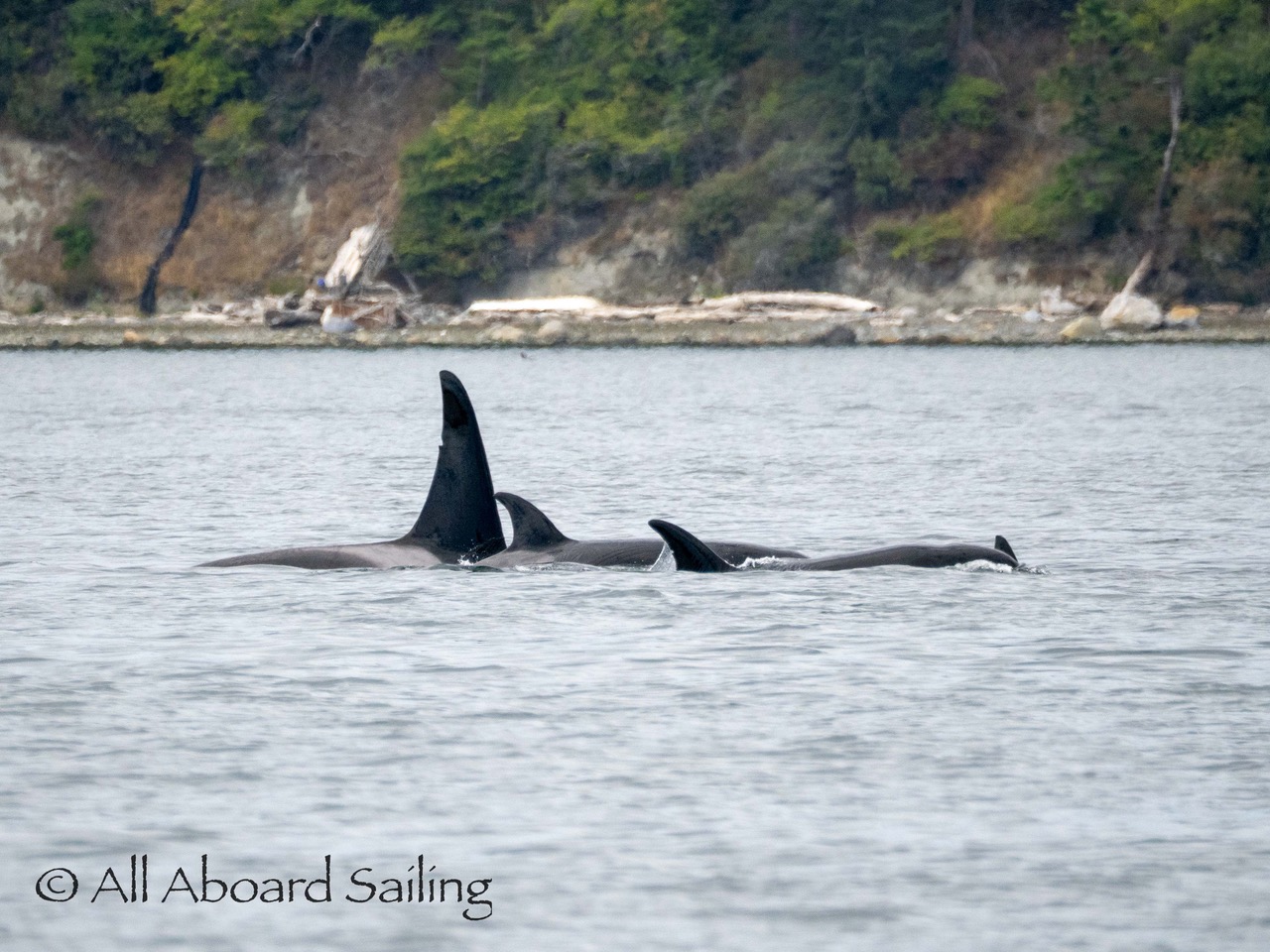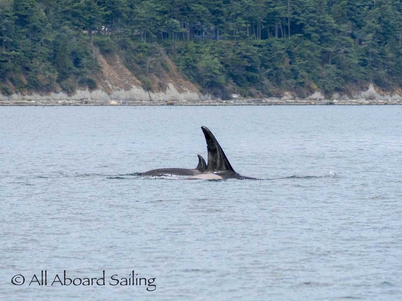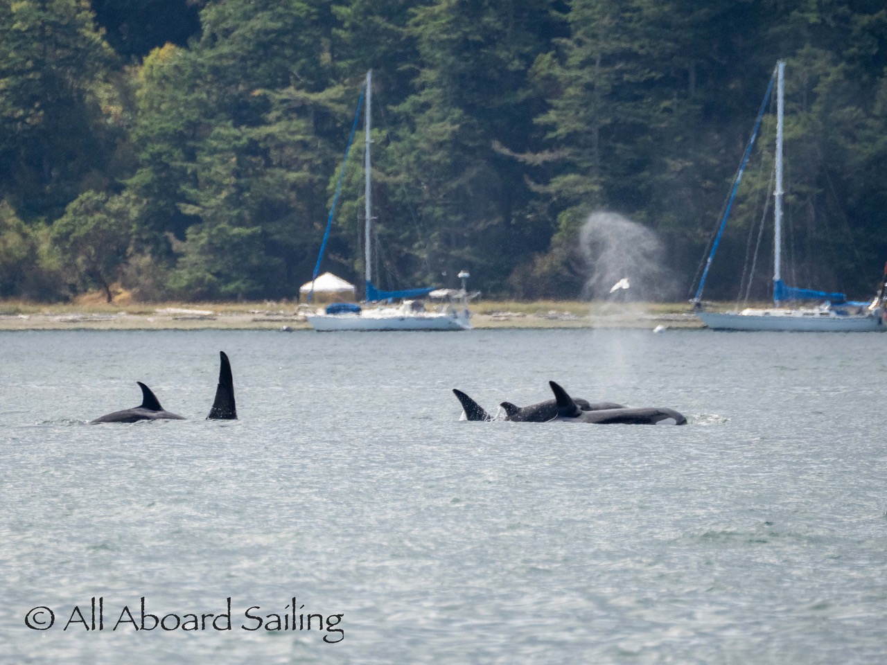 August 16, 2025 – This mornings report was of orcas coming in thru Thatcher Pass and heading down into Lopez Sound. With a strong flood tide we caught the back eddy to Turn Island before riding the flood north into Upright Channel. We came inside Canoe Island seeing the coastline of Shaw Island and crossing to Upright Head and the dramatic forested cliffs. Wrapping around Lopez we cut through Flower Island and the pass between Frost Island and Spencer Spit State Park. The Biggs/Transient orcas, the T109A’s, had wrapped around the bottom of Lopez Sound and were northbound where we met them at Trump Island. Sailing alongside we had some great views as they led the way home to Friday Harbor. We left them at Upright Head and stayed close to the Shaw Island coast popping into Hicks Bay to view the harbor seals.