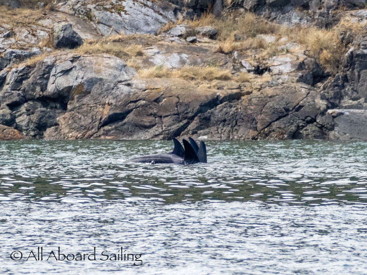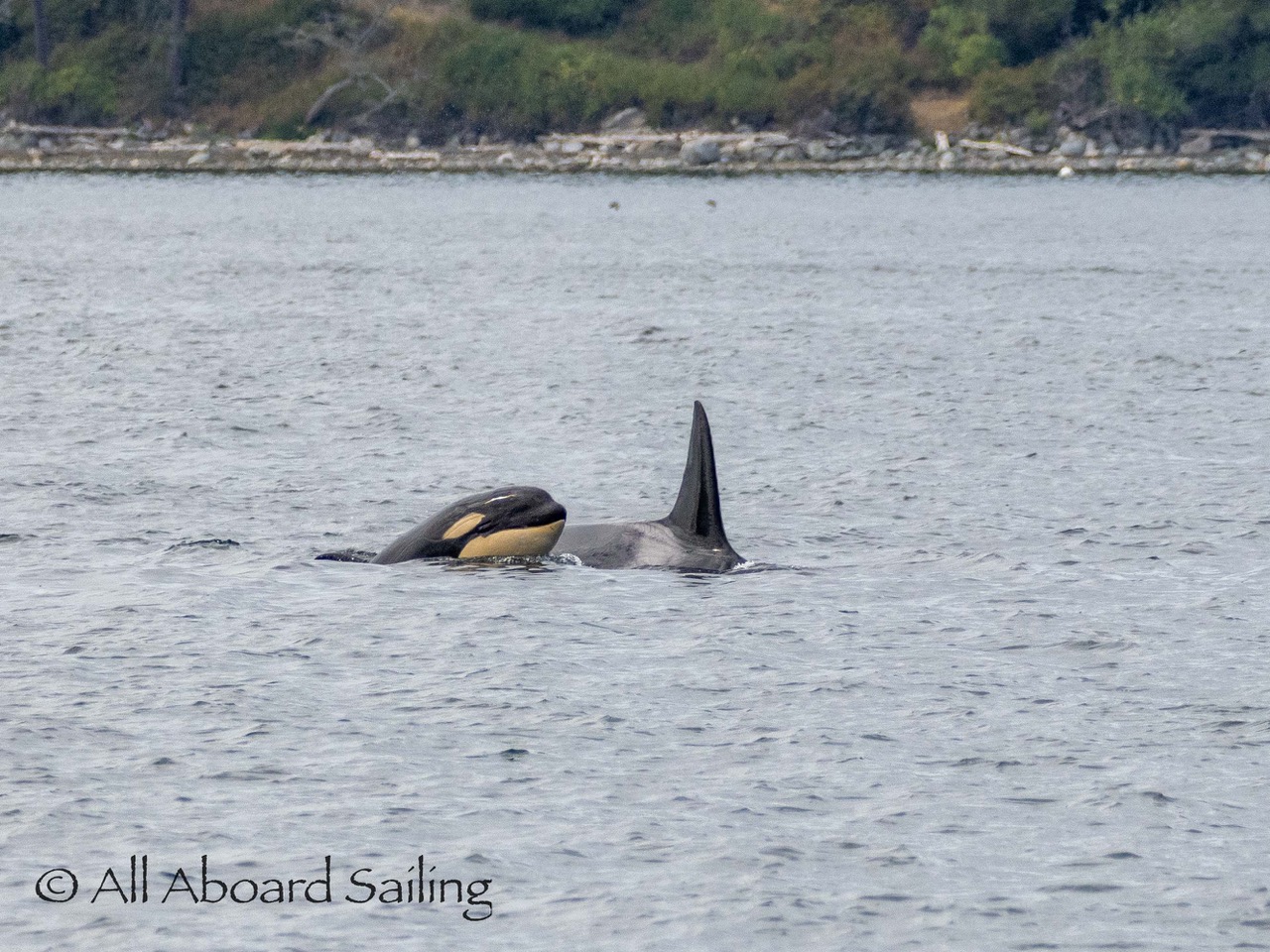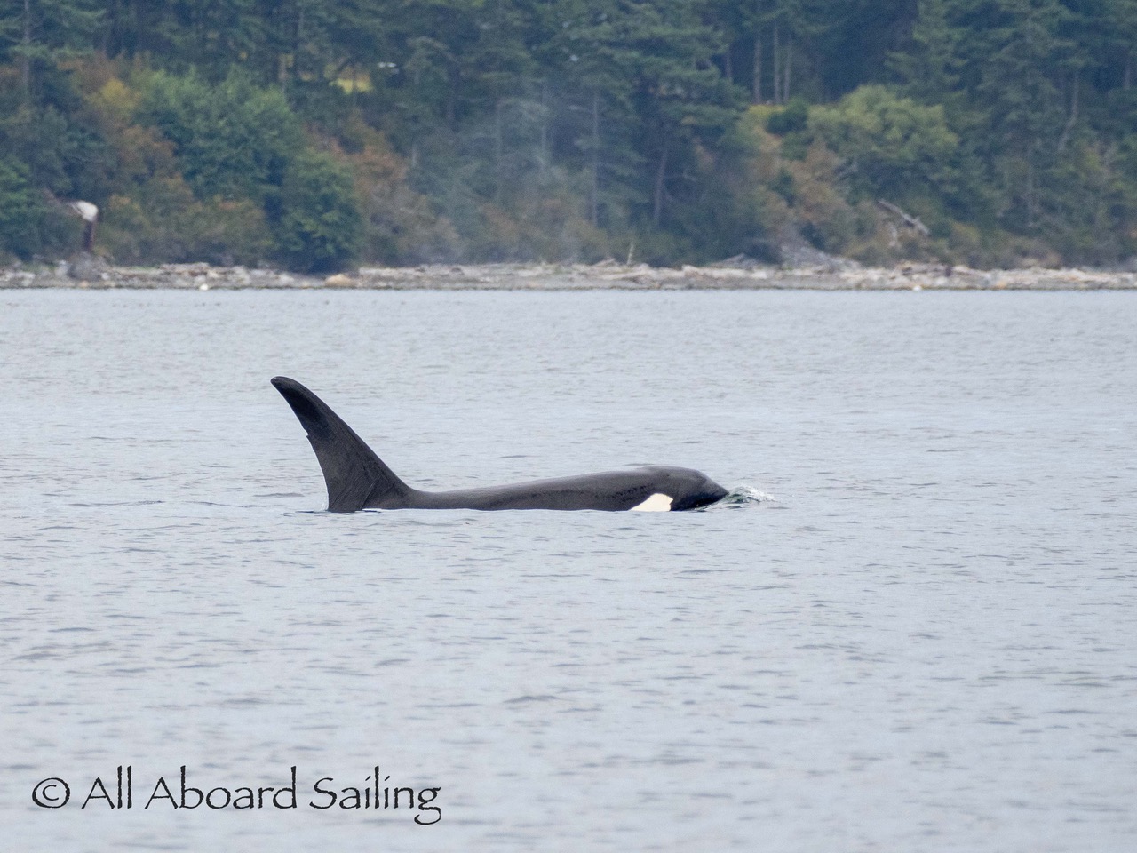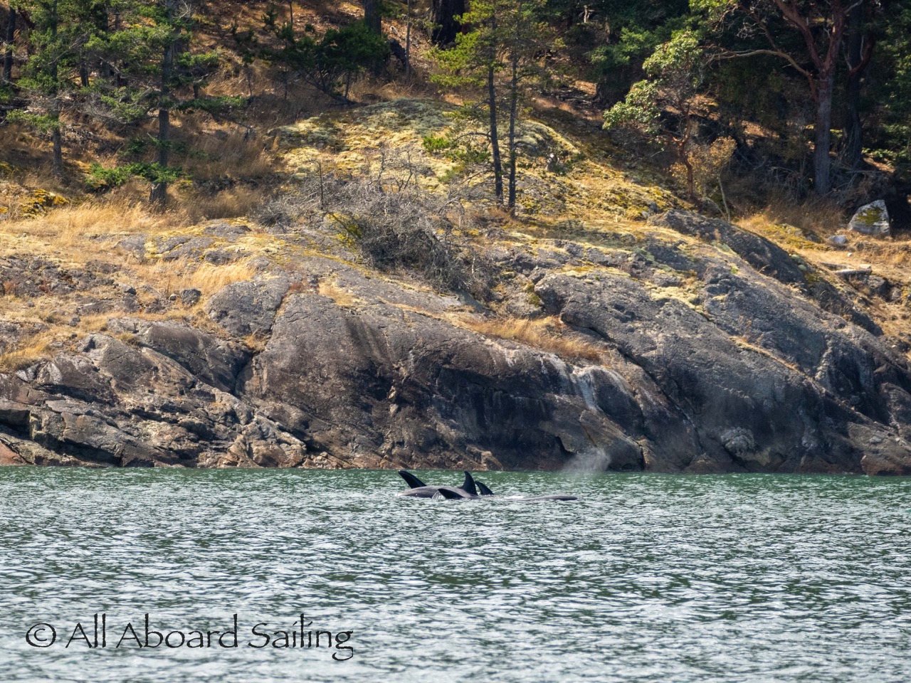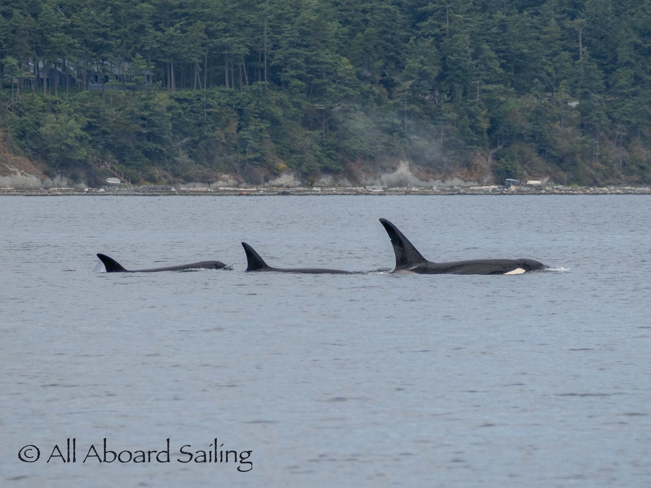 August 16, 2025 – This mornings report was of orcas coming in thru Thatcher Pass and heading down into Lopez Sound. With a strong flood tide we caught the back eddy to Turn Island before riding the flood north into Upright Channel. We came inside Canoe Island seeing the coastline of Shaw Island and crossing to Upright Head and the dramatic forested cliffs. Wrapping around Lopez we cut through Flower Island and the pass between Frost Island and Spencer Spit State Park. The Biggs/Transient orcas, the T109A’s, had wrapped around the bottom of Lopez Sound and were northbound where we met them at Trump Island. Sailing alongside we had some great views as they led the way home to Friday Harbor. We left them at Upright Head and stayed close to the Shaw Island coast popping into Hicks Bay to view the harbor seals.
