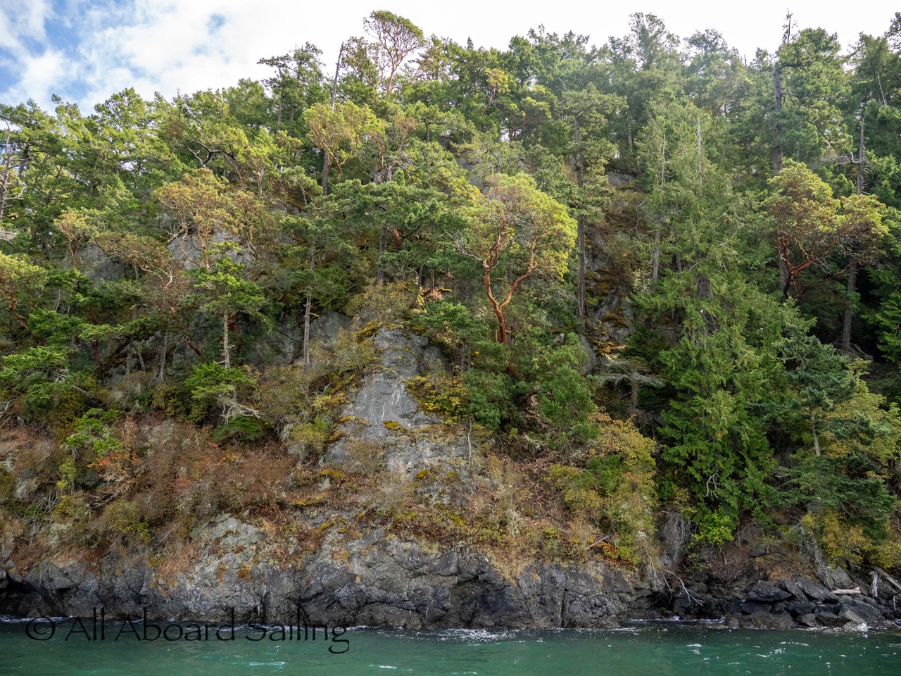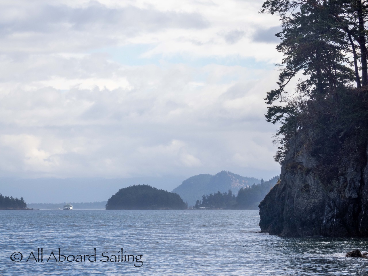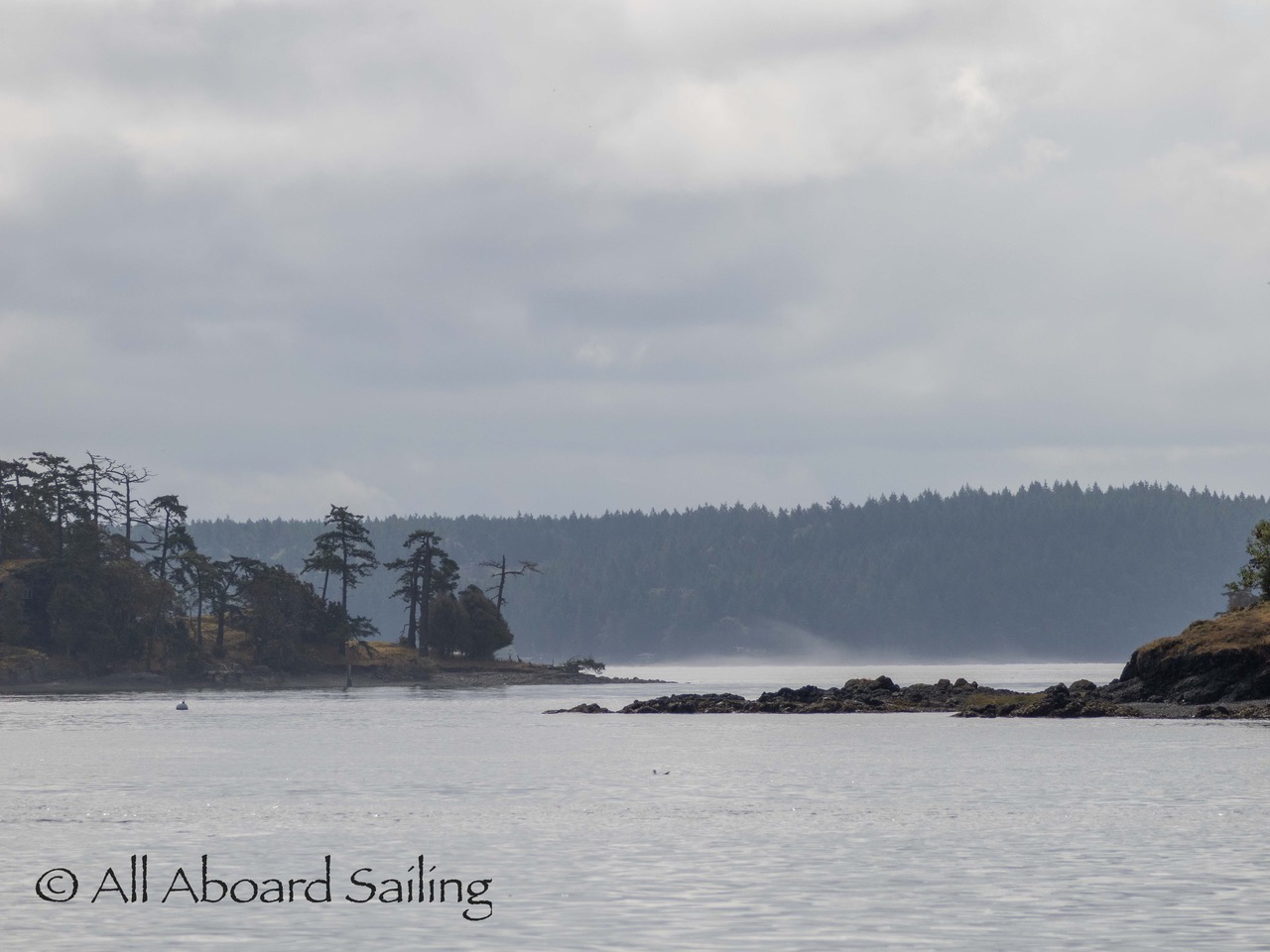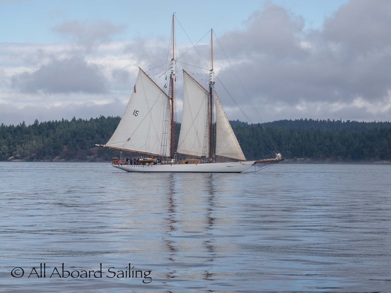 August 16, 2025 – This mornings report was of orcas coming in thru Thatcher Pass and heading down into Lopez Sound. With a strong flood tide we caught the back eddy to Turn Island before riding the flood north into Upright Channel. We came inside Canoe Island seeing the coastline of Shaw Island and crossing to Upright Head and the dramatic forested cliffs. Wrapping around Lopez we cut through Flower Island and the pass between Frost Island and Spencer Spit State Park. The Biggs/Transient orcas, the T109A’s, had wrapped around the bottom of Lopez Sound and were northbound where we met them at Trump Island. Sailing alongside we had some great views as they led the way home to Friday Harbor. We left them at Upright Head and stayed close to the Shaw Island coast popping into Hicks Bay to view the harbor seals.