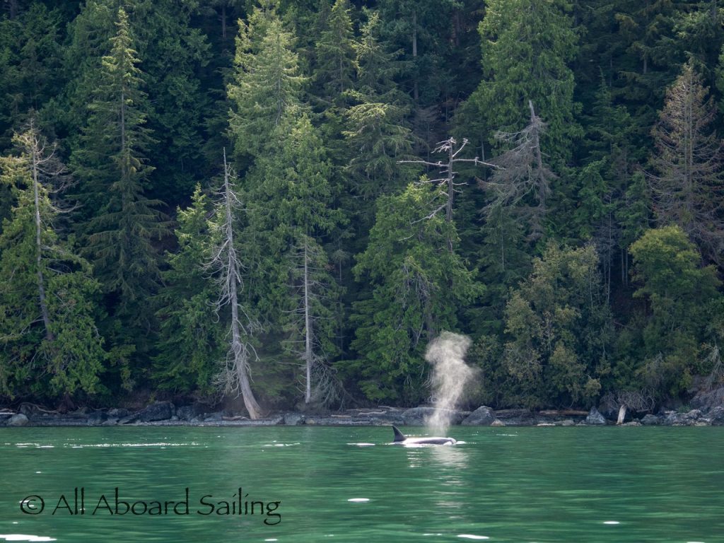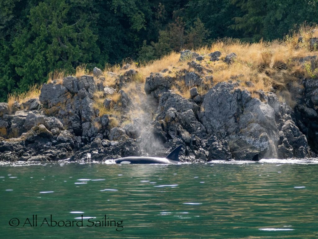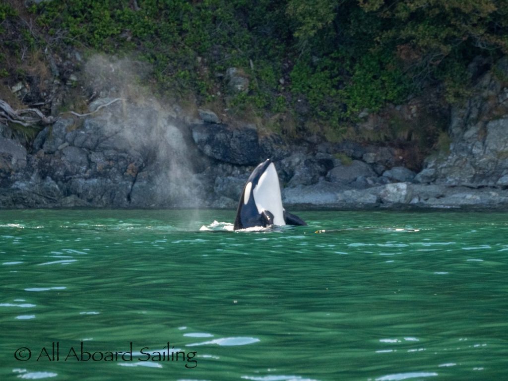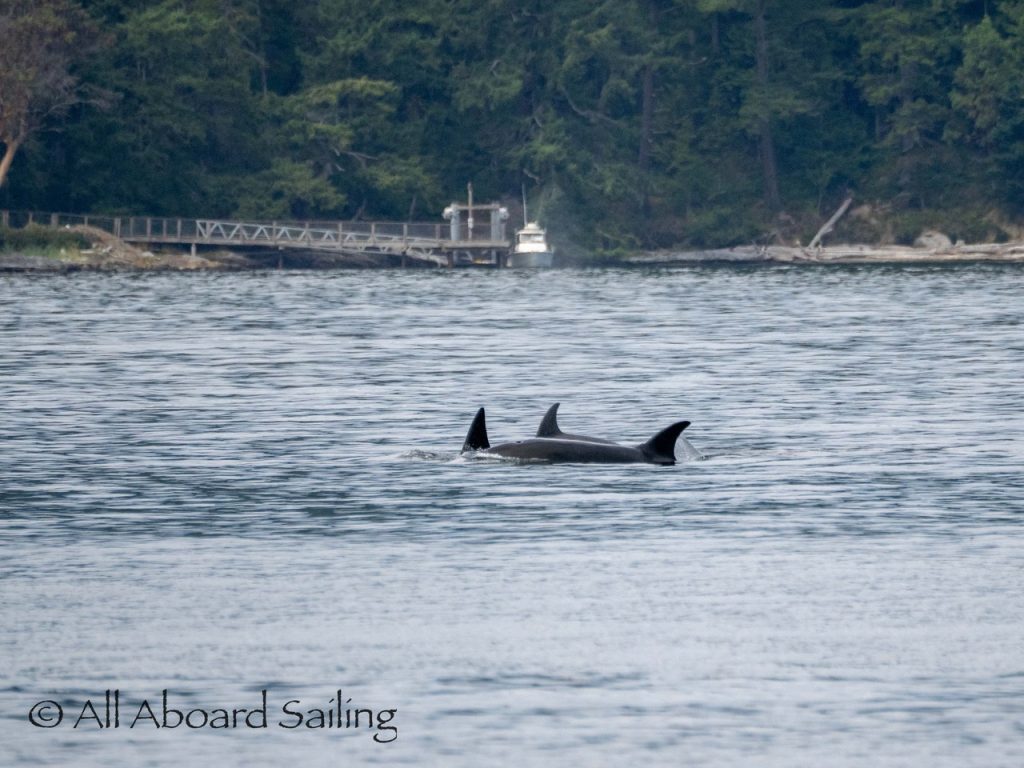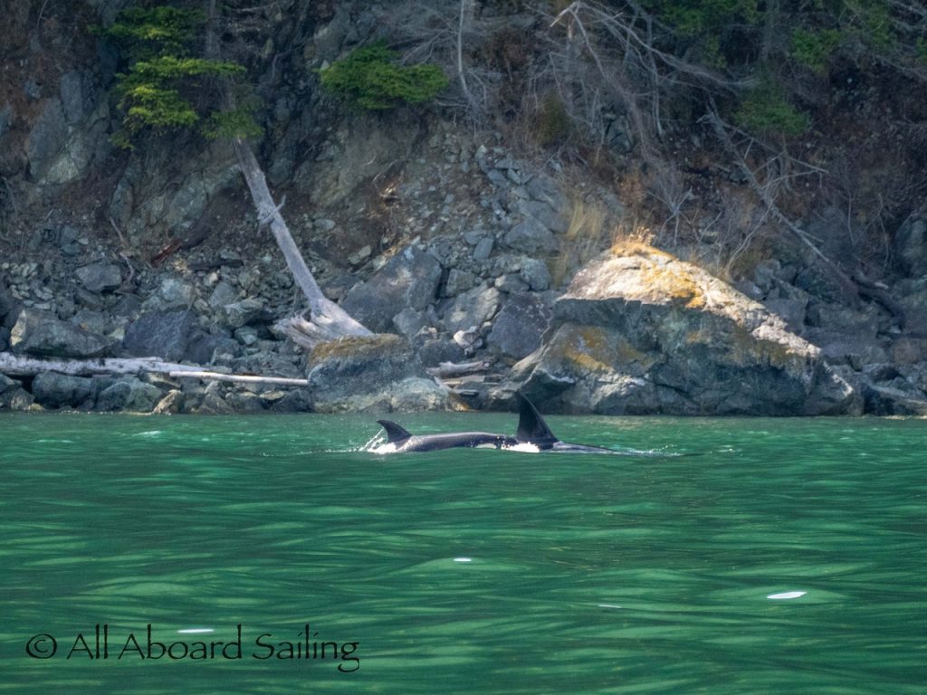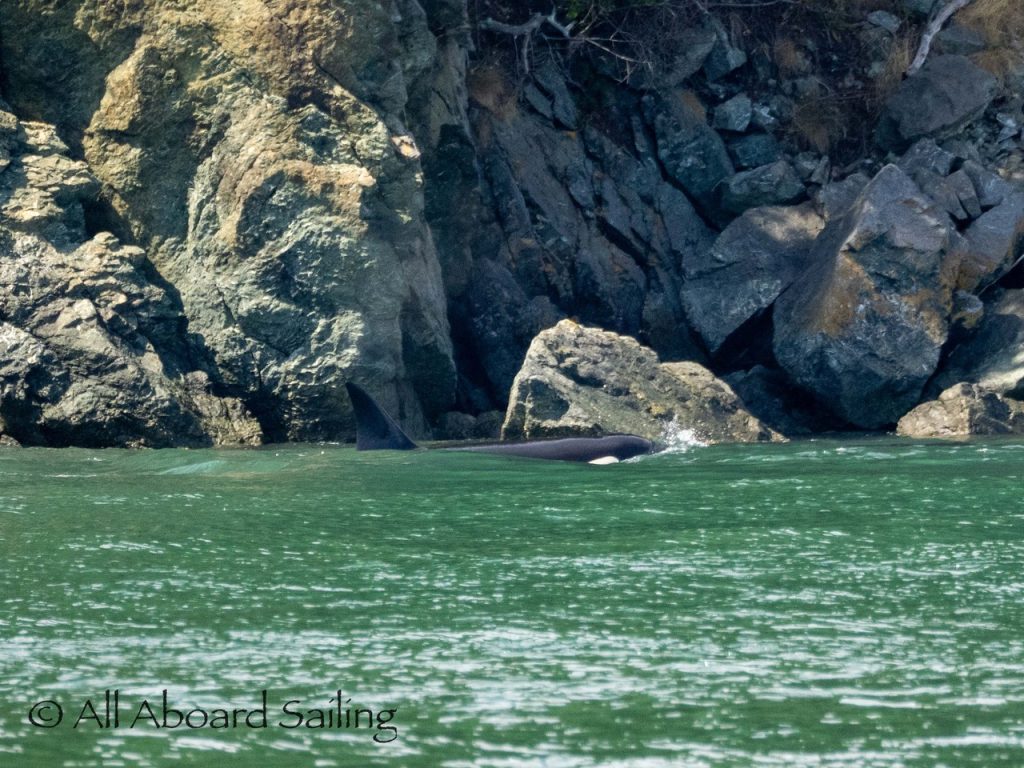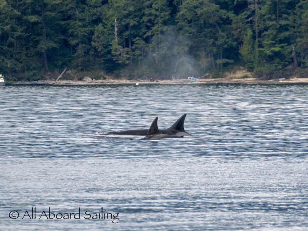 August 17, 2025 – We left Friday Harbor and cut inside Turn Island viewing harbor seals hauled out on the low tide. Reports of Biggs/Transient orcas (the T124D’s) at Smith Island heading towards Deception Pass and a humpback nicknamed “Victory” off Iceberg Pt. As we sailed around Pear Pt it became evident that the T124D’s were not heading for Deception Pass but heading for Rosario Strait. We changed course and sailed inside Canoe Island to Upright Head to Peavine Pass while the orcas made fast progress up Rosario. As we approached Peavine Pass we noticed an osprey nest with an osprey above Blakely Island Marina. We hugged the forested coastline of Blakely Island meeting the orcas near Black Rock. Paralleling they followed the Blakely Island shoreline to the north tip where they stopped to hunt inside of Spindle Rock. We saw backwards swimming evident of a likely harbor seal predation. They came inside Peavine Pass, but changed their mind and came back out through Obstruction Pass. After witnessing another hunt off Obstruction Island they continued north and we resumed sailing back to Friday Harbor.
