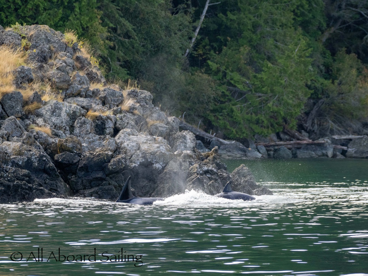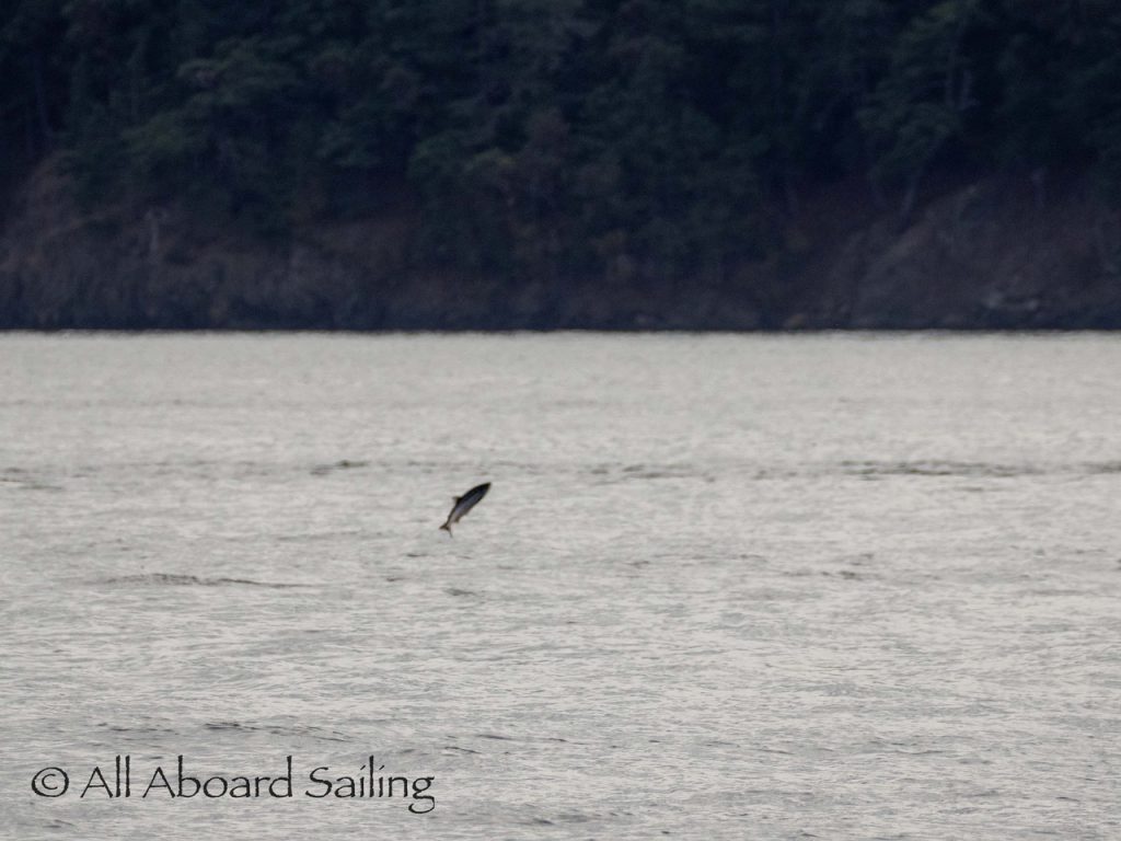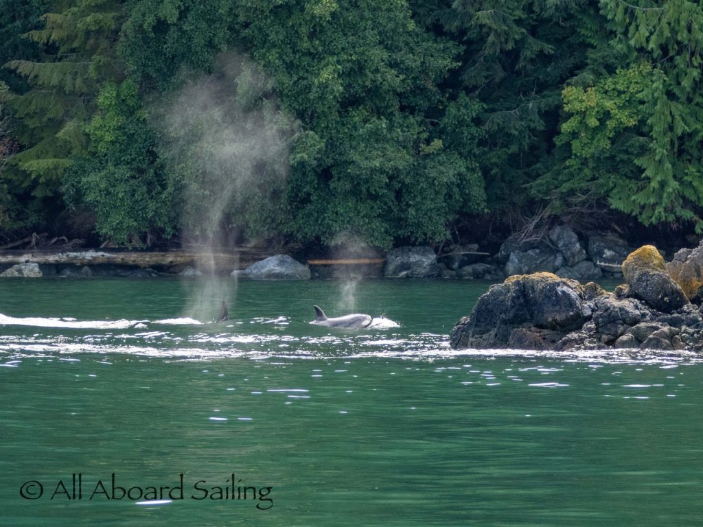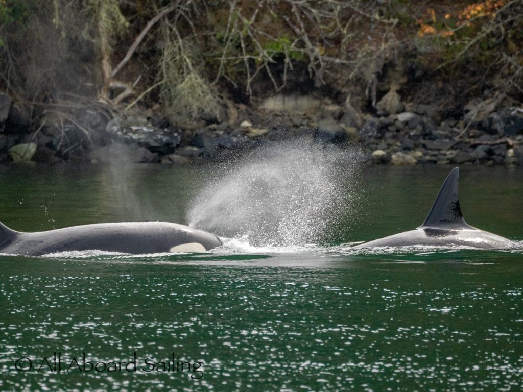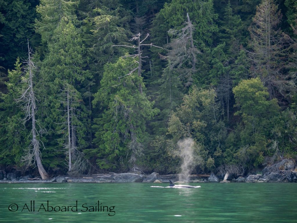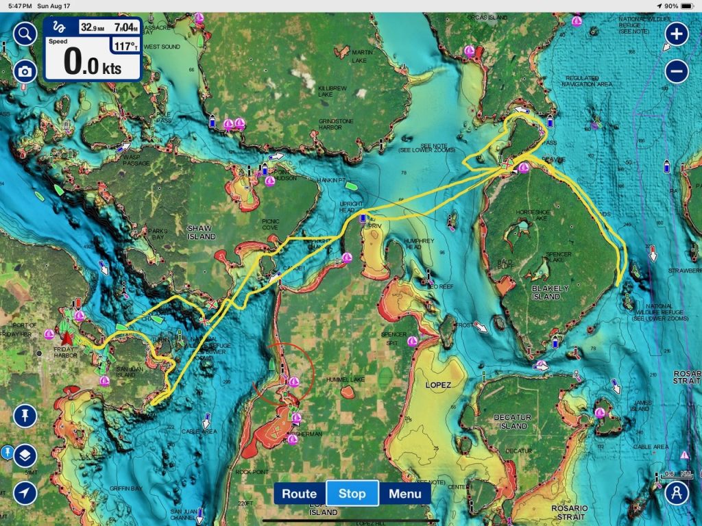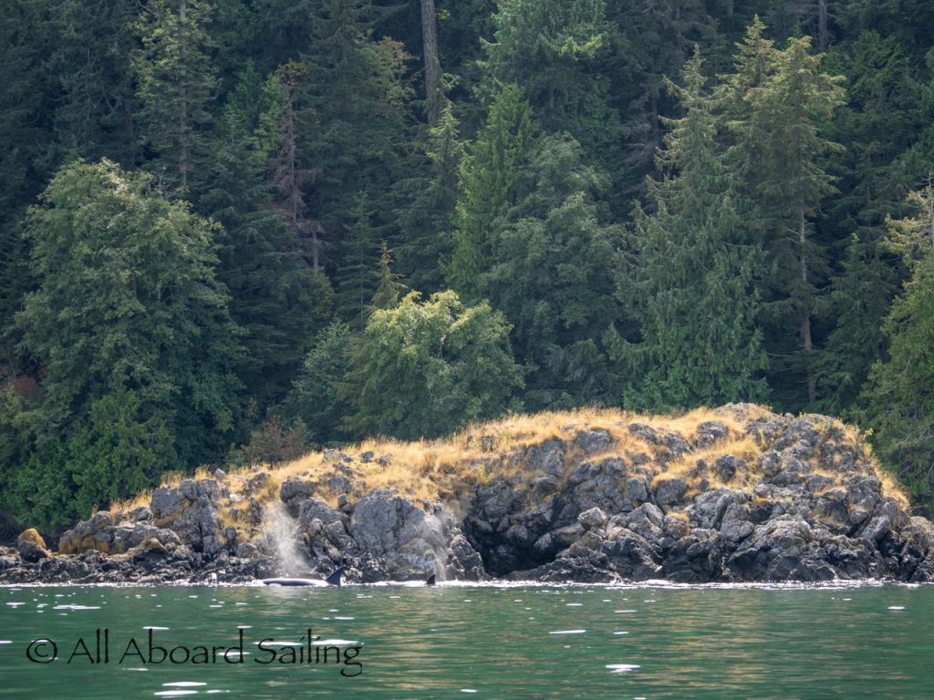 August 17, 2025 – We left Friday Harbor and cut inside Turn Island viewing harbor seals hauled out on the low tide. Reports of Biggs/Transient orcas (the T124D’s) at Smith Island heading towards Deception Pass and a humpback nicknamed “Victory” off Iceberg Pt. As we sailed around Pear Pt it became evident that the T124D’s were not heading for Deception Pass but heading for Rosario Strait. We changed course and sailed inside Canoe Island to Upright Head to Peavine Pass while the orcas made fast progress up Rosario. As we approached Peavine Pass we noticed an osprey nest with an osprey above Blakely Island Marina. We hugged the forested coastline of Blakely Island meeting the orcas near Black Rock. Paralleling they followed the Blakely Island shoreline to the north tip where they stopped to hunt inside of Spindle Rock. We saw backwards swimming evident of a likely harbor seal predation. They came inside Peavine Pass, but changed their mind and came back out through Obstruction Pass. After witnessing another hunt off Obstruction Island they continued north and we resumed sailing back to Friday Harbor.