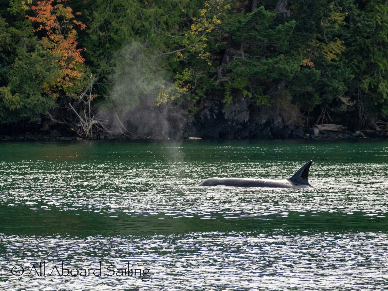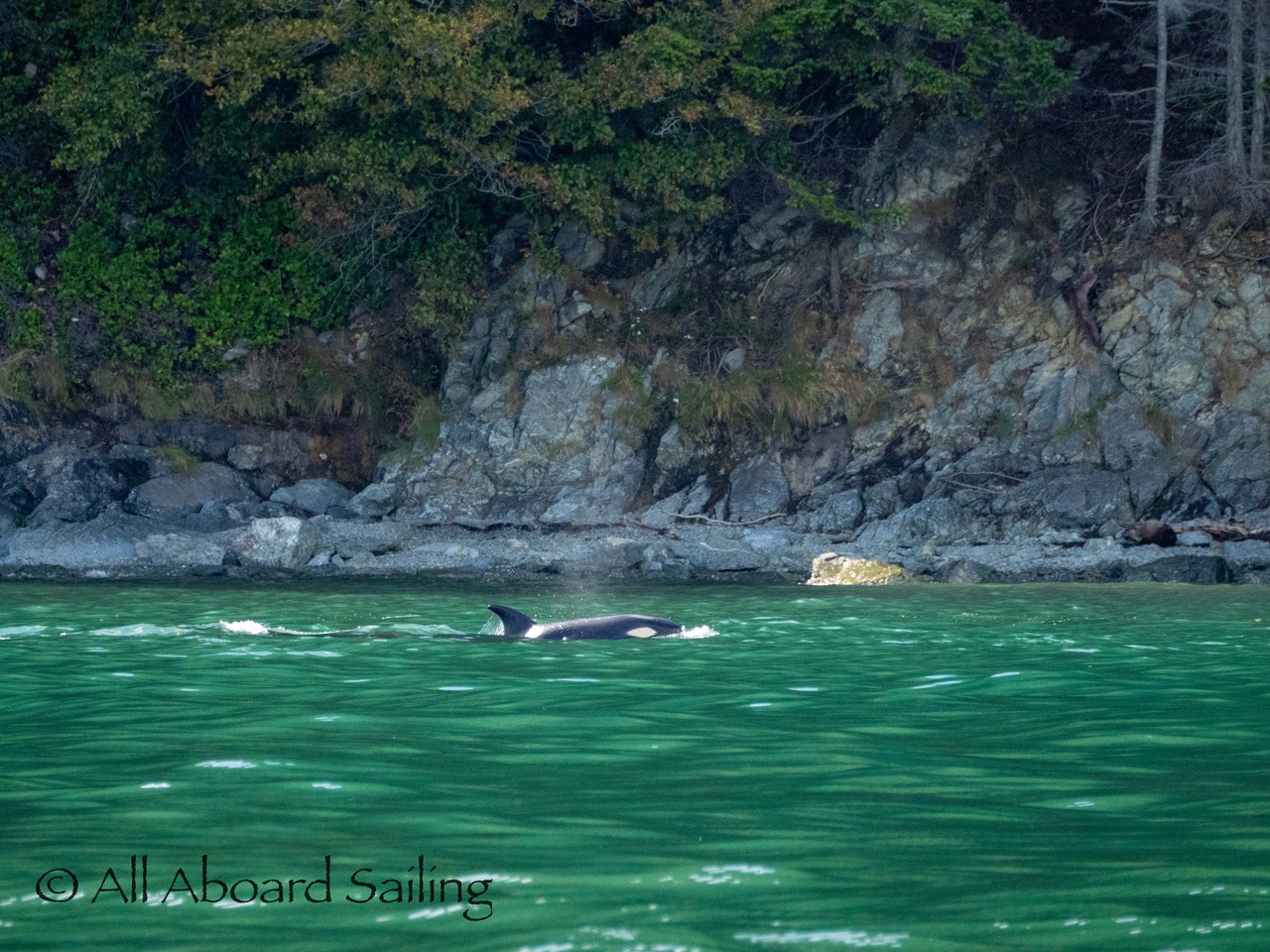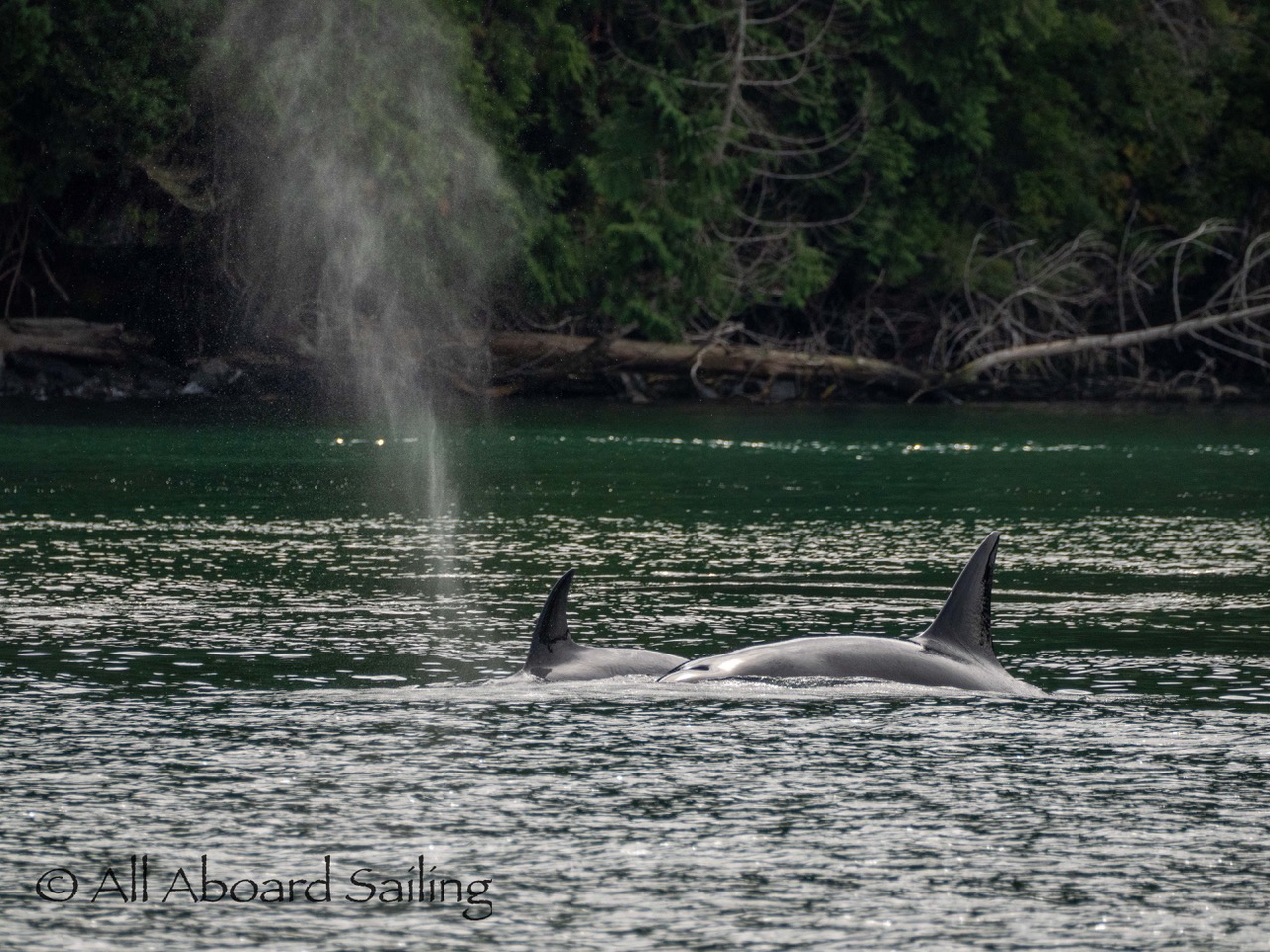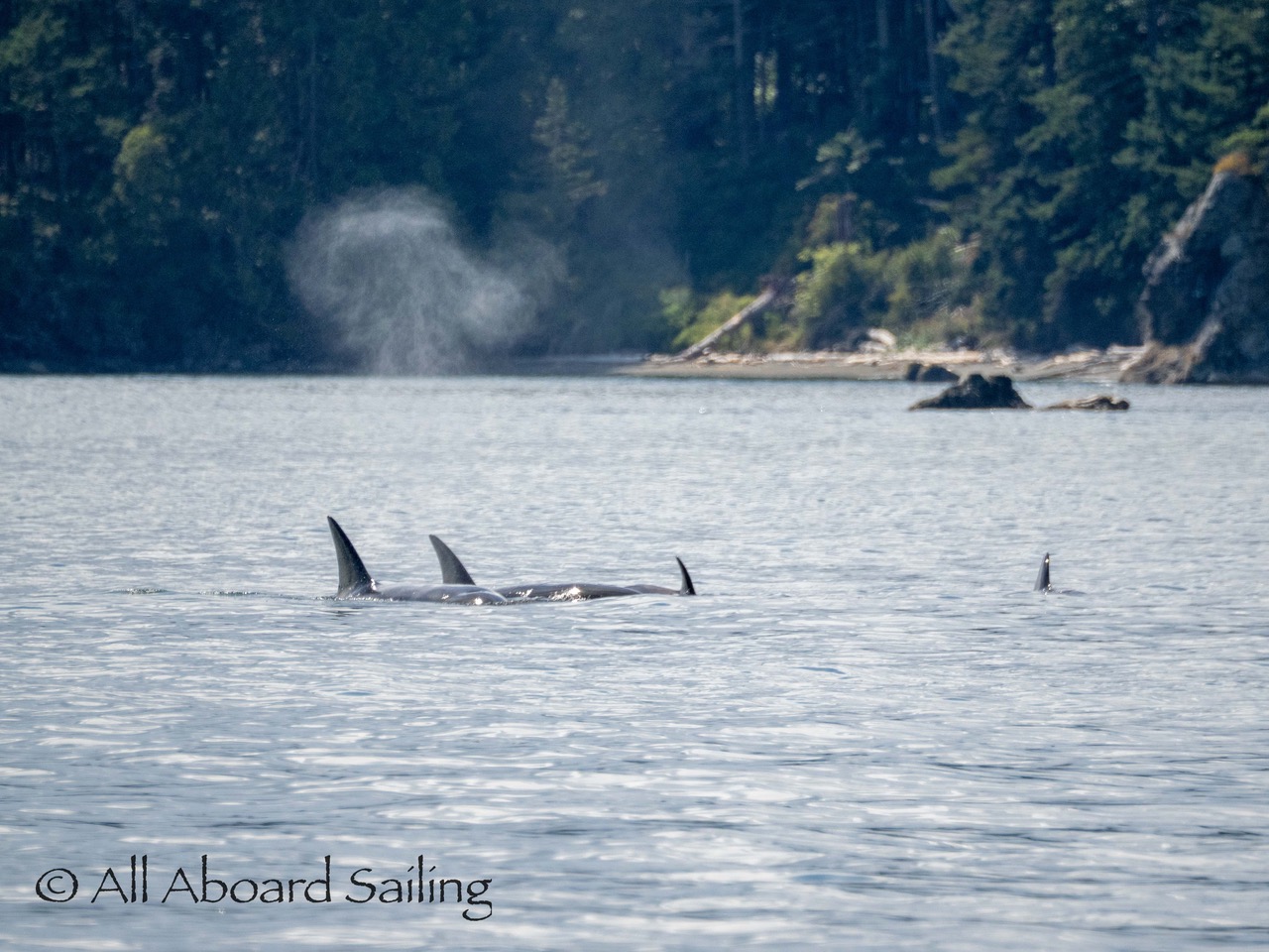 August 17, 2025 – We left Friday Harbor and cut inside Turn Island viewing harbor seals hauled out on the low tide. Reports of Biggs/Transient orcas (the T124D’s) at Smith Island heading towards Deception Pass and a humpback nicknamed “Victory” off Iceberg Pt. As we sailed around Pear Pt it became evident that the T124D’s were not heading for Deception Pass but heading for Rosario Strait. We changed course and sailed inside Canoe Island to Upright Head to Peavine Pass while the orcas made fast progress up Rosario. As we approached Peavine Pass we noticed an osprey nest with an osprey above Blakely Island Marina. We hugged the forested coastline of Blakely Island meeting the orcas near Black Rock. Paralleling they followed the Blakely Island shoreline to the north tip where they stopped to hunt inside of Spindle Rock. We saw backwards swimming evident of a likely harbor seal predation. They came inside Peavine Pass, but changed their mind and came back out through Obstruction Pass. After witnessing another hunt off Obstruction Island they continued north and we resumed sailing back to Friday Harbor.