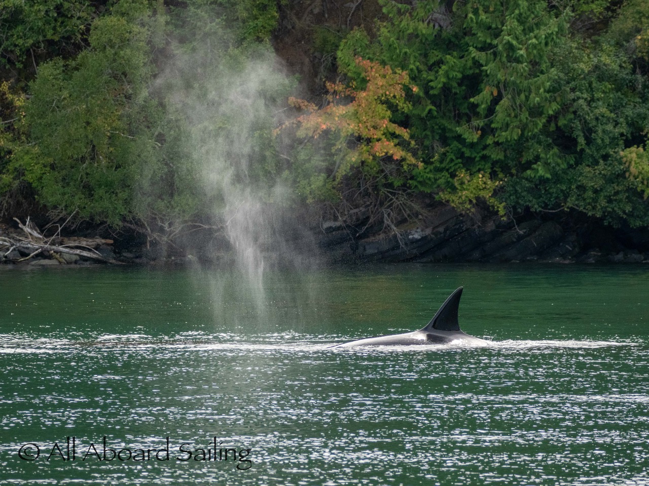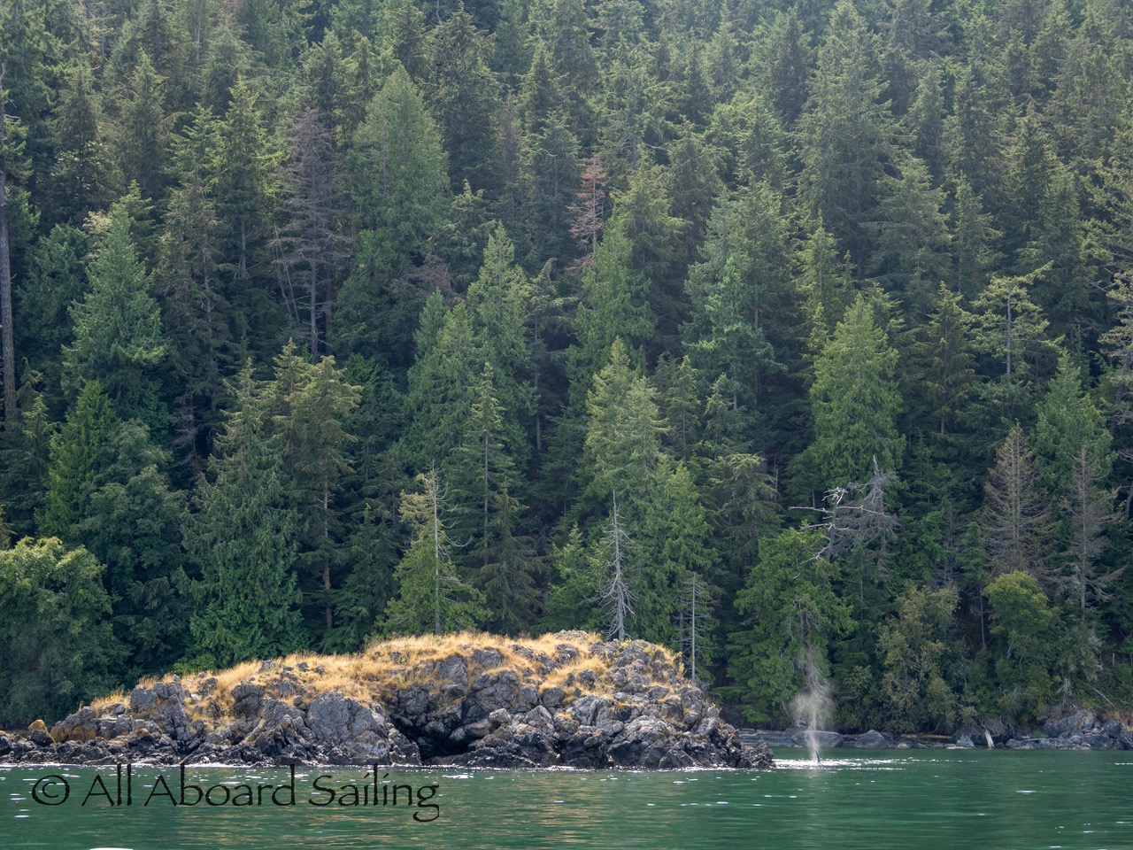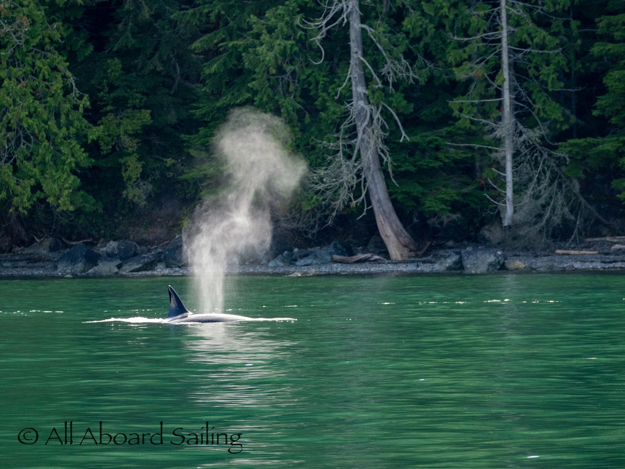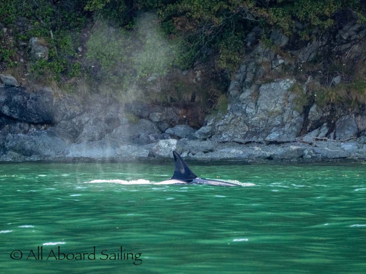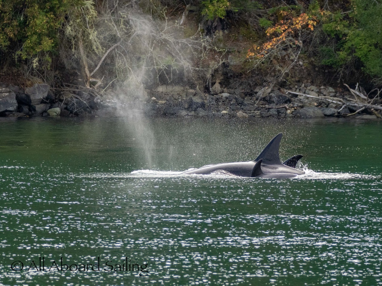 August 17, 2025 – We left Friday Harbor and cut inside Turn Island viewing harbor seals hauled out on the low tide. Reports of Biggs/Transient orcas (the T124D’s) at Smith Island heading towards Deception Pass and a humpback nicknamed “Victory” off Iceberg Pt. As we sailed around Pear Pt it became evident that the T124D’s were not heading for Deception Pass but heading for Rosario Strait. We changed course and sailed inside Canoe Island to Upright Head to Peavine Pass while the orcas made fast progress up Rosario. As we approached Peavine Pass we noticed an osprey nest with an osprey above Blakely Island Marina. We hugged the forested coastline of Blakely Island meeting the orcas near Black Rock. Paralleling they followed the Blakely Island shoreline to the north tip where they stopped to hunt inside of Spindle Rock. We saw backwards swimming evident of a likely harbor seal predation. They came inside Peavine Pass, but changed their mind and came back out through Obstruction Pass. After witnessing another hunt off Obstruction Island they continued north and we resumed sailing back to Friday Harbor.