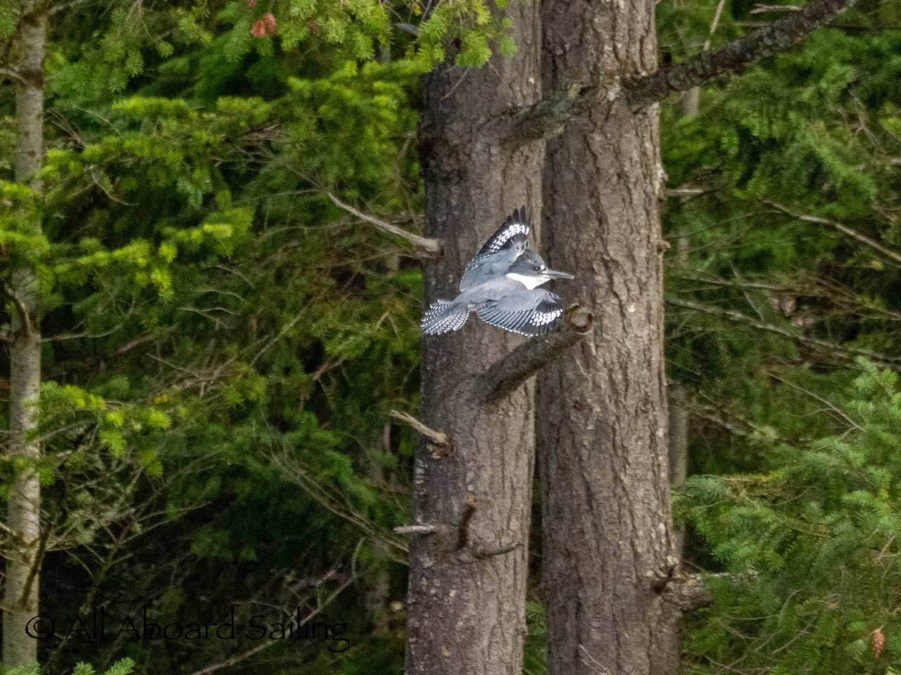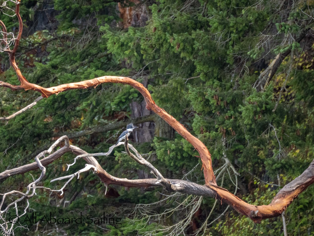 Belted kingfisher on Madrone tree