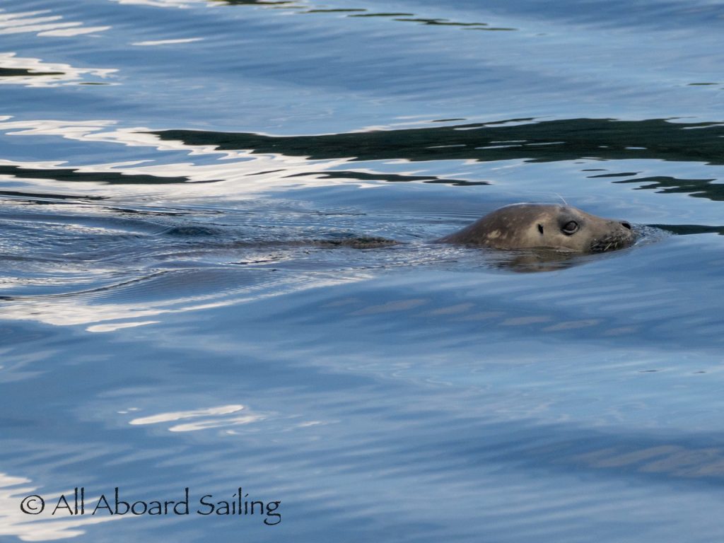 Harbor seal swimming by in glassy waters