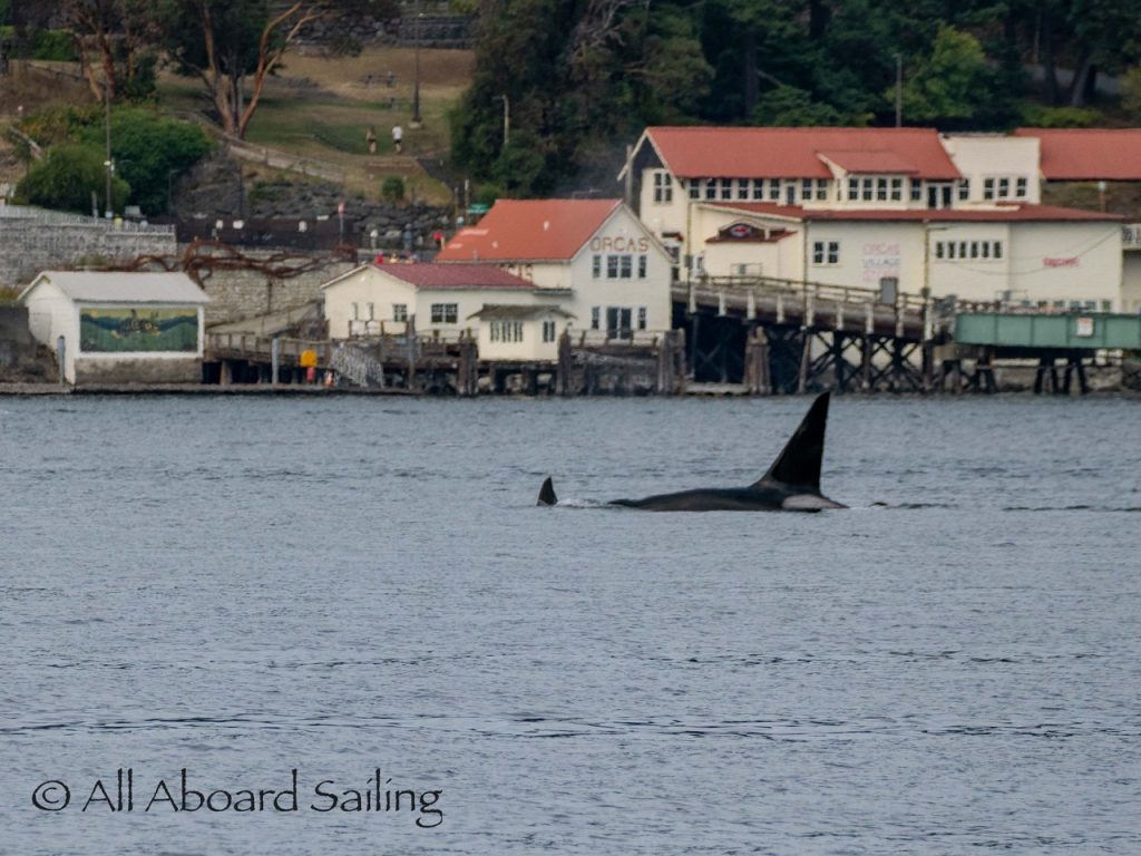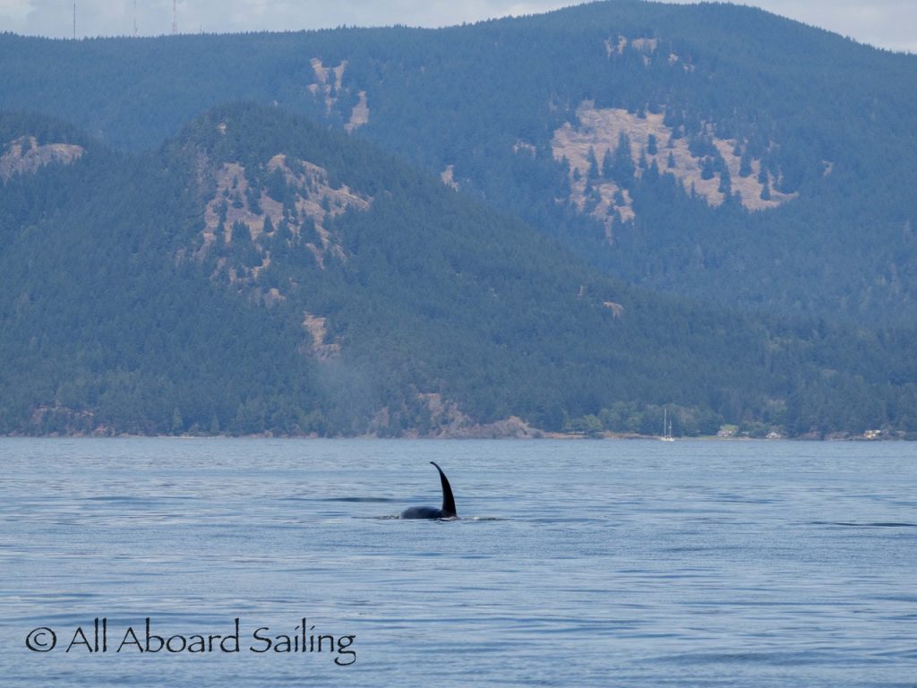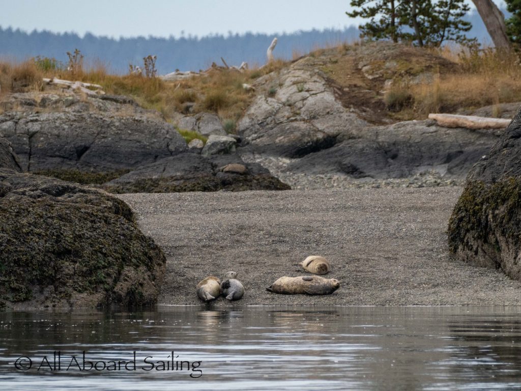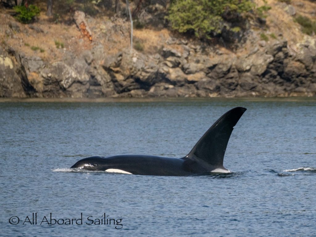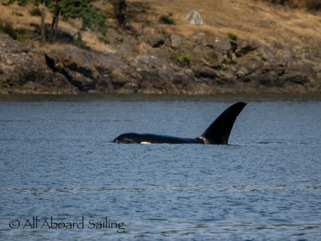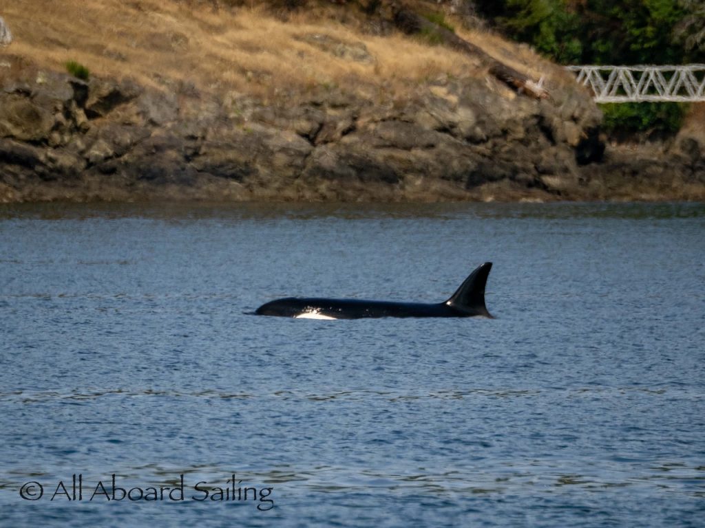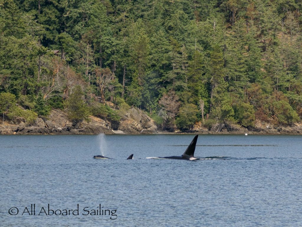 August 19, 2025 – We sailed out of Friday Harbor and Turn Island pass seeing harbor seals hauled out in the morning sun. With news of Biggs/Transient orcas, the T19’s, northbound at the bottom of Rosario Strait we took a northerly course to meet them. We came inside of Canoe Island and over to Upright Head seeing a bald eagle in a Madrona tree. Over to Peavine Pass where we heard the orcas had taken Thatcher pass so we circled Spindle Rock with its harbor seals and a great blue heron and came back inter-island to Flower Island. We met the orcas after they had just come through the narrow pass between Spencer Spit and Frost Island. Sailed parallel as they traveled north into Cayou Channel leaving them at West Sound. Returned by way of the Wasp Islands.