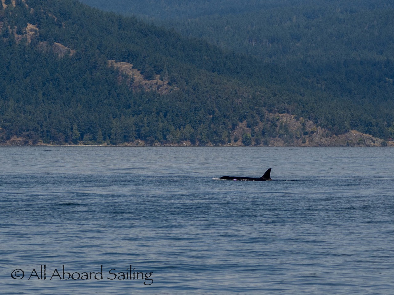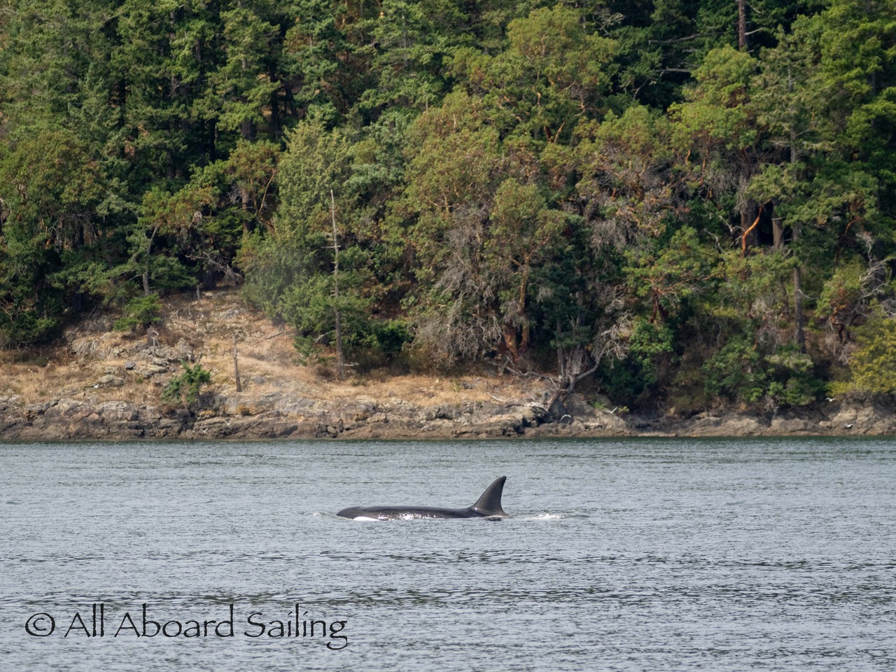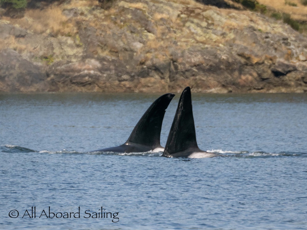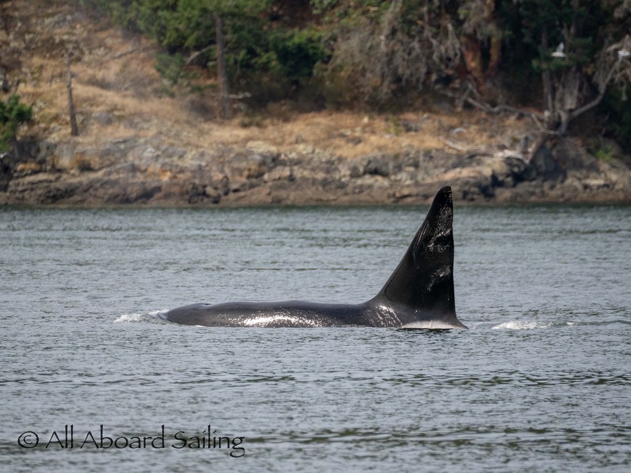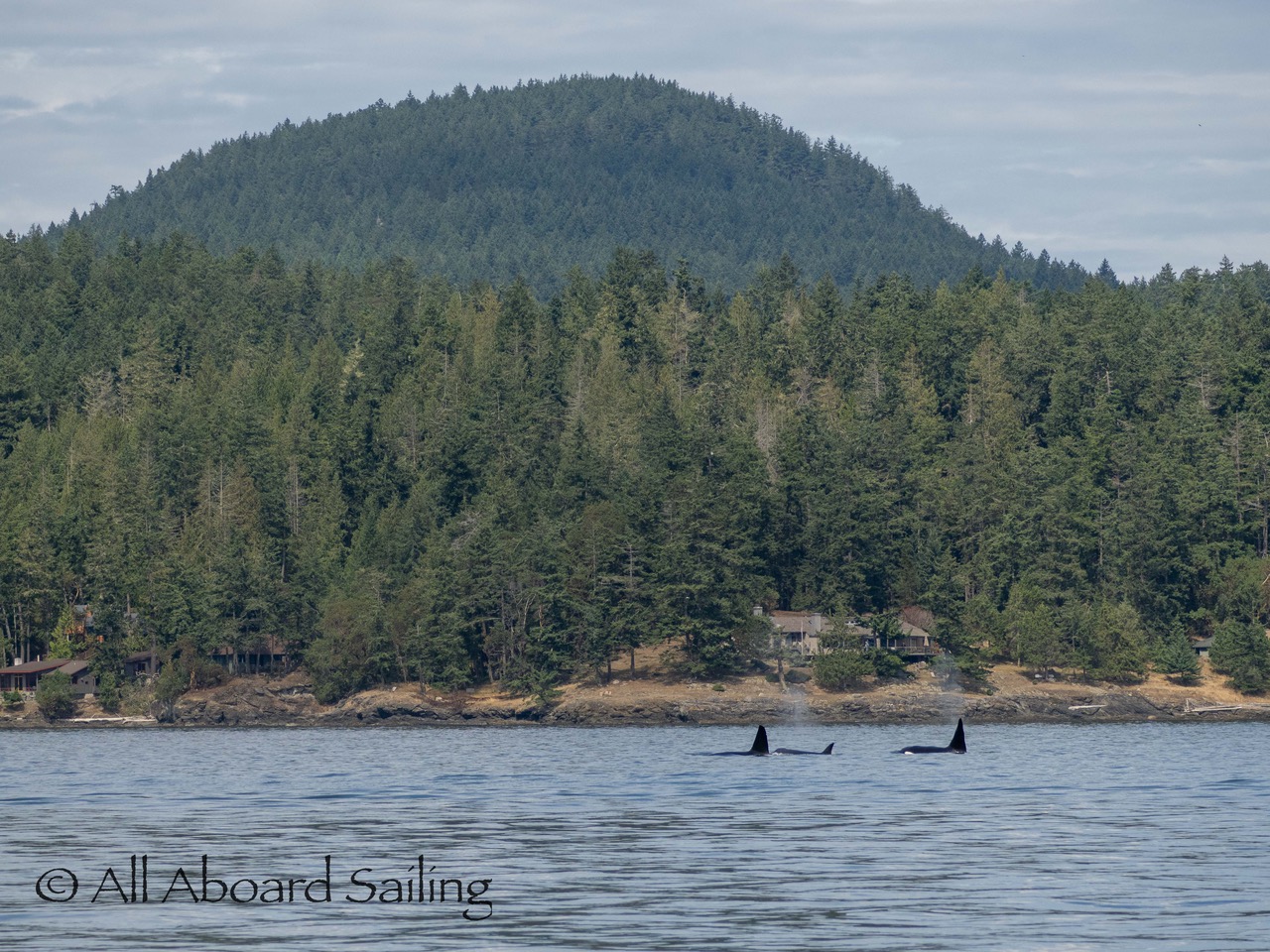 August 19, 2025 – We sailed out of Friday Harbor and Turn Island pass seeing harbor seals hauled out in the morning sun. With news of Biggs/Transient orcas, the T19’s, northbound at the bottom of Rosario Strait we took a northerly course to meet them. We came inside of Canoe Island and over to Upright Head seeing a bald eagle in a Madrona tree. Over to Peavine Pass where we heard the orcas had taken Thatcher pass so we circled Spindle Rock with its harbor seals and a great blue heron and came back inter-island to Flower Island. We met the orcas after they had just come through the narrow pass between Spencer Spit and Frost Island. Sailed parallel as they traveled north into Cayou Channel leaving them at West Sound. Returned by way of the Wasp Islands.