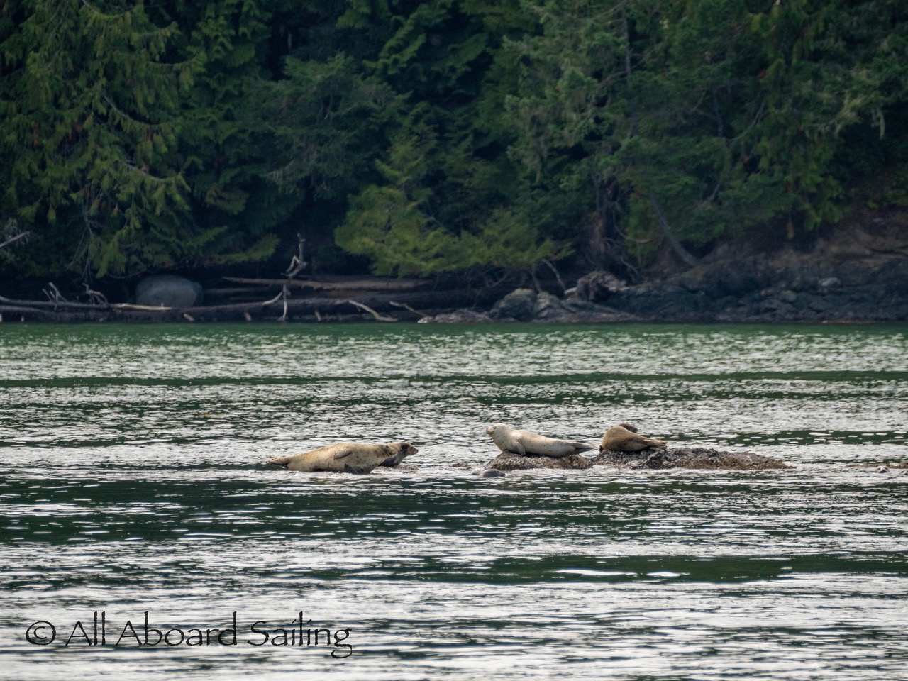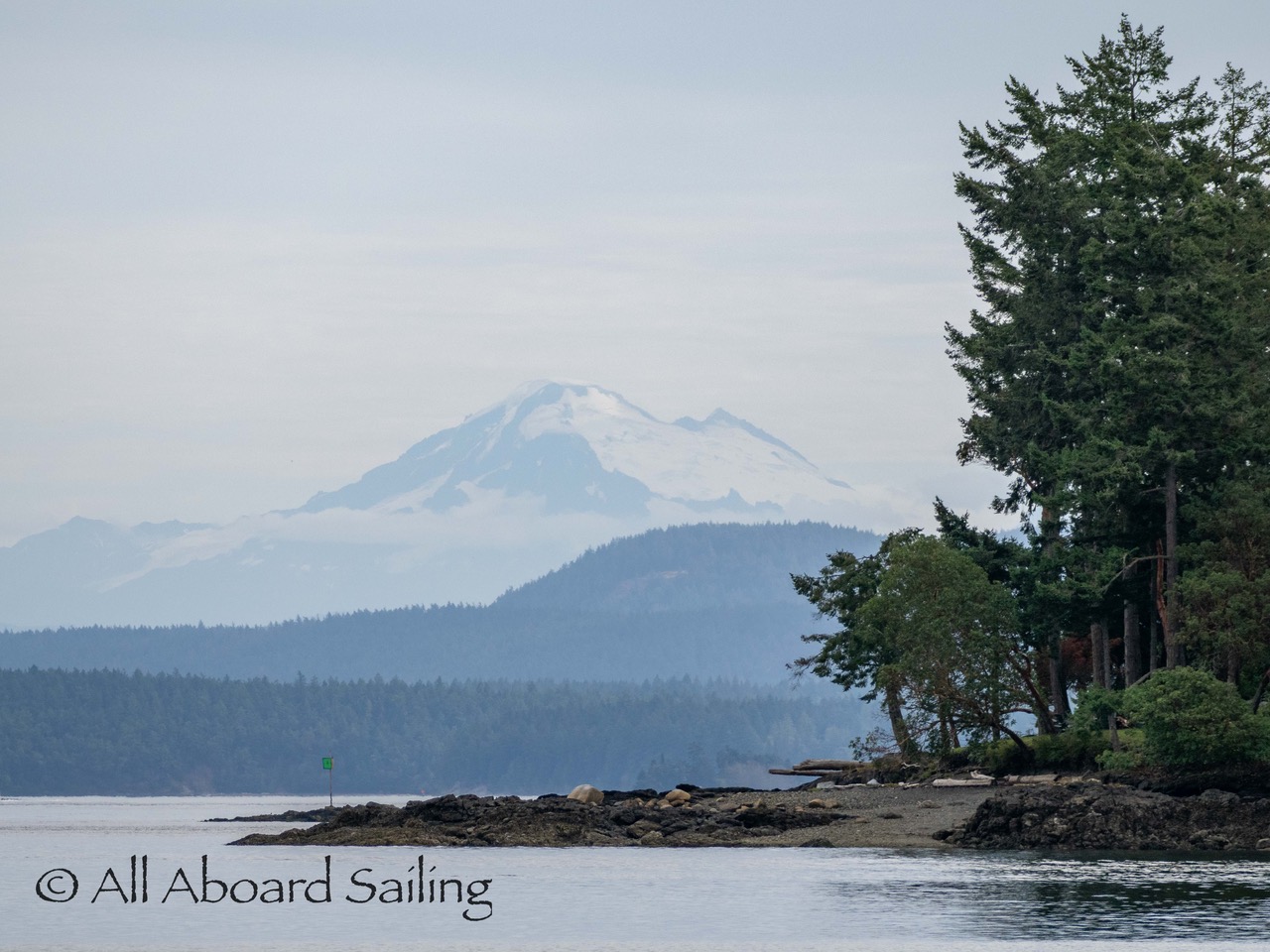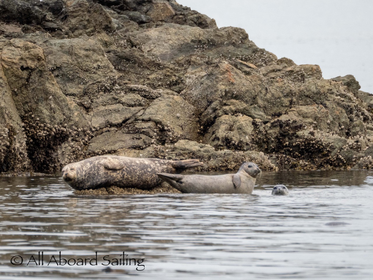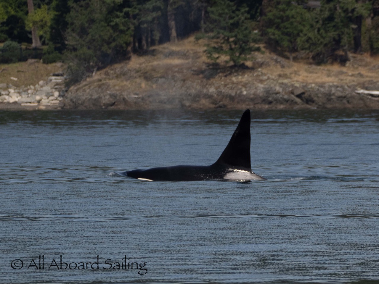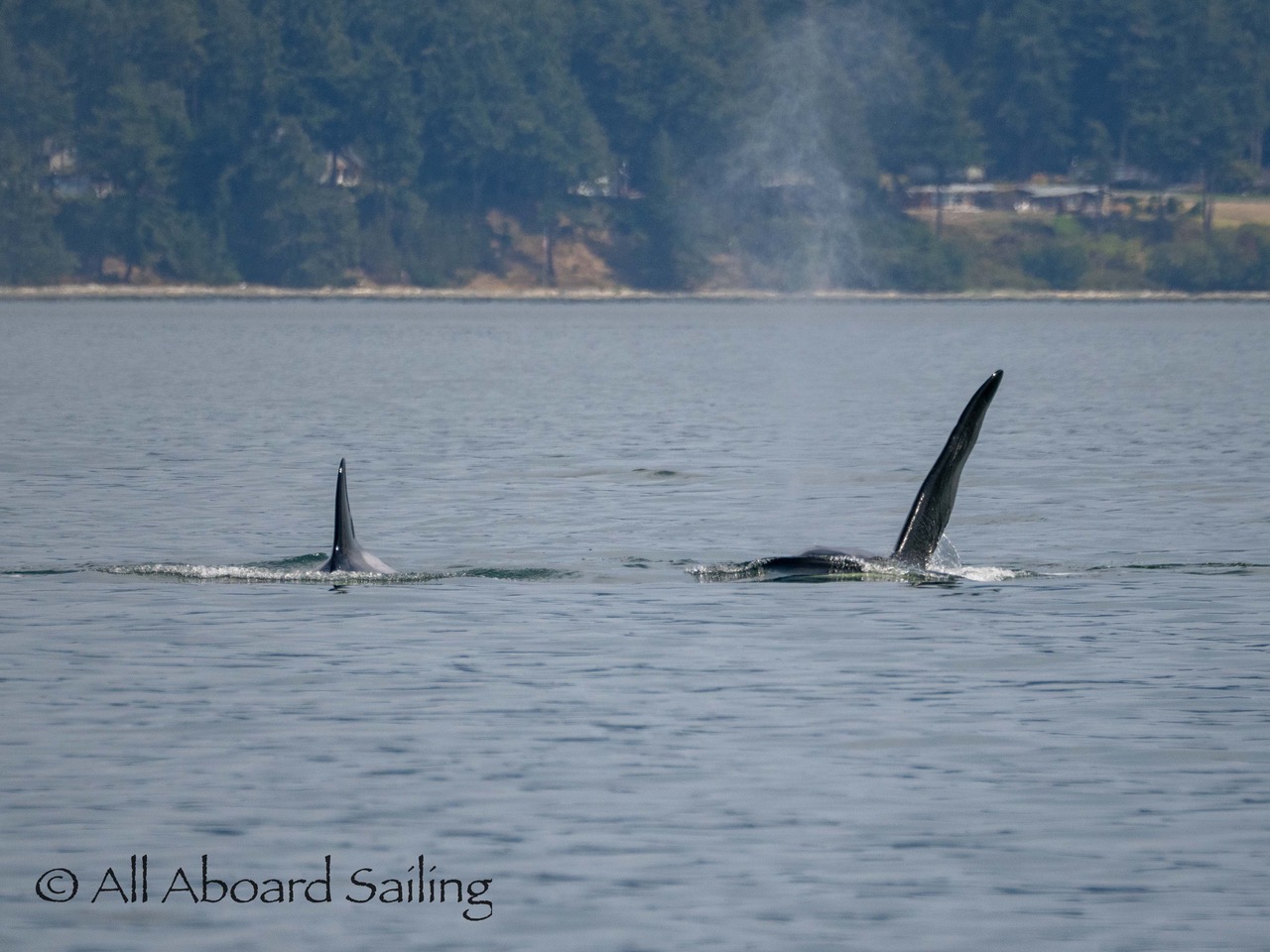 August 19, 2025 – We sailed out of Friday Harbor and Turn Island pass seeing harbor seals hauled out in the morning sun. With news of Biggs/Transient orcas, the T19’s, northbound at the bottom of Rosario Strait we took a northerly course to meet them. We came inside of Canoe Island and over to Upright Head seeing a bald eagle in a Madrona tree. Over to Peavine Pass where we heard the orcas had taken Thatcher pass so we circled Spindle Rock with its harbor seals and a great blue heron and came back inter-island to Flower Island. We met the orcas after they had just come through the narrow pass between Spencer Spit and Frost Island. Sailed parallel as they traveled north into Cayou Channel leaving them at West Sound. Returned by way of the Wasp Islands.