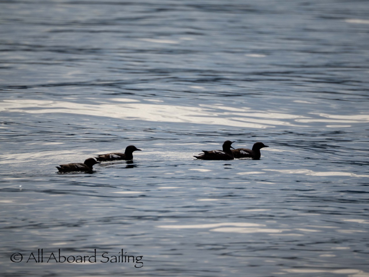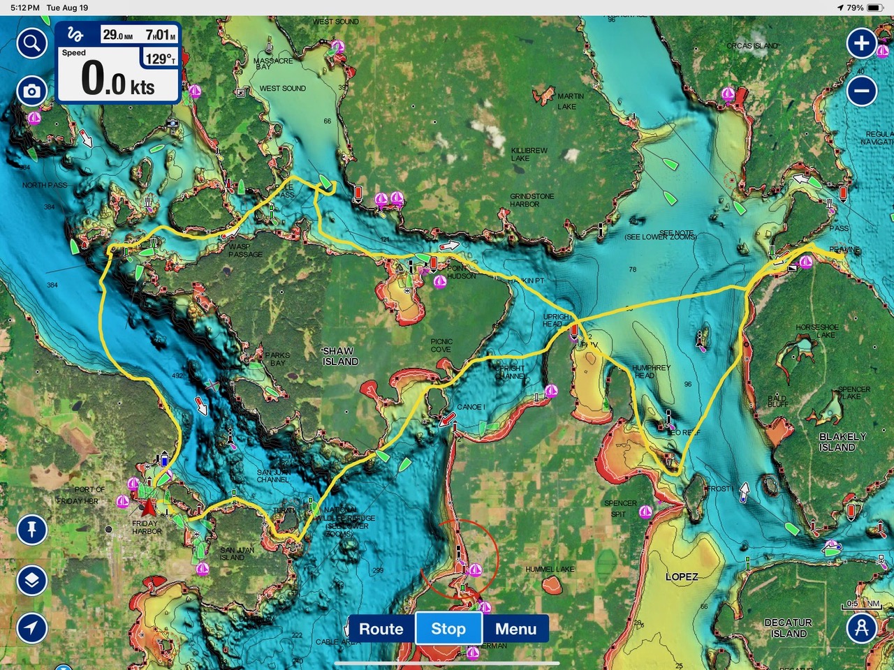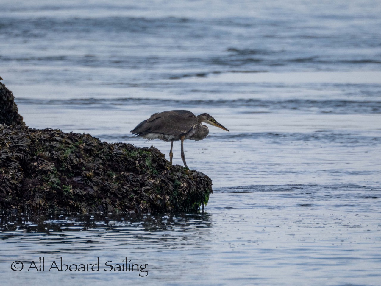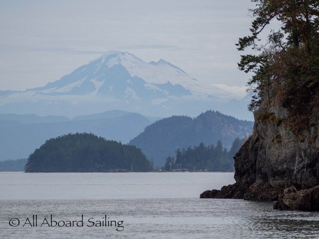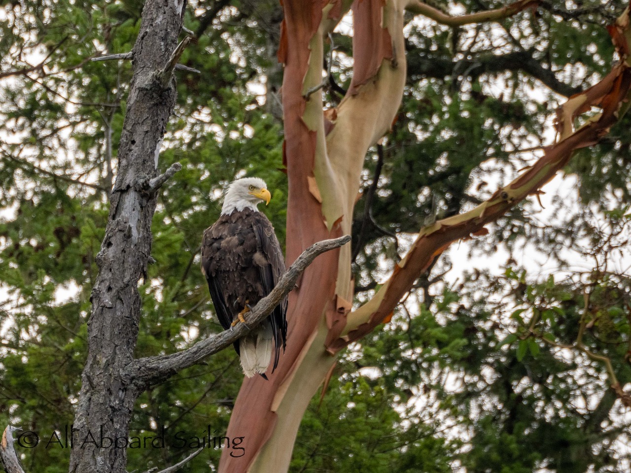 August 19, 2025 – We sailed out of Friday Harbor and Turn Island pass seeing harbor seals hauled out in the morning sun. With news of Biggs/Transient orcas, the T19’s, northbound at the bottom of Rosario Strait we took a northerly course to meet them. We came inside of Canoe Island and over to Upright Head seeing a bald eagle in a Madrona tree. Over to Peavine Pass where we heard the orcas had taken Thatcher pass so we circled Spindle Rock with its harbor seals and a great blue heron and came back inter-island to Flower Island. We met the orcas after they had just come through the narrow pass between Spencer Spit and Frost Island. Sailed parallel as they traveled north into Cayou Channel leaving them at West Sound. Returned by way of the Wasp Islands.