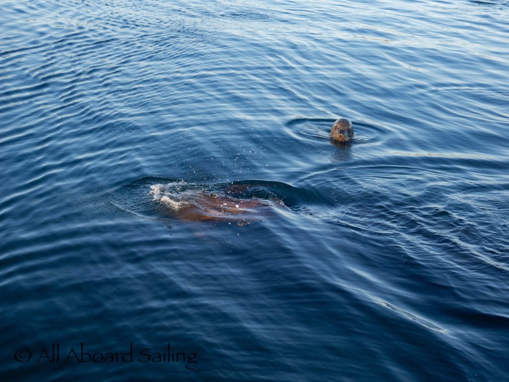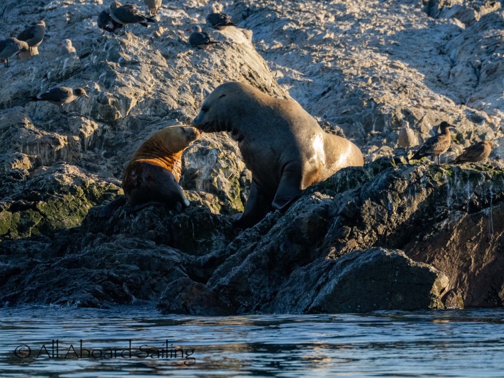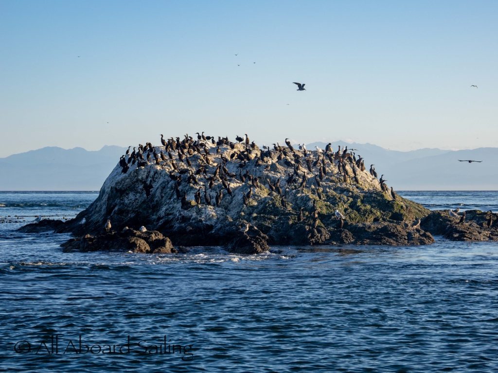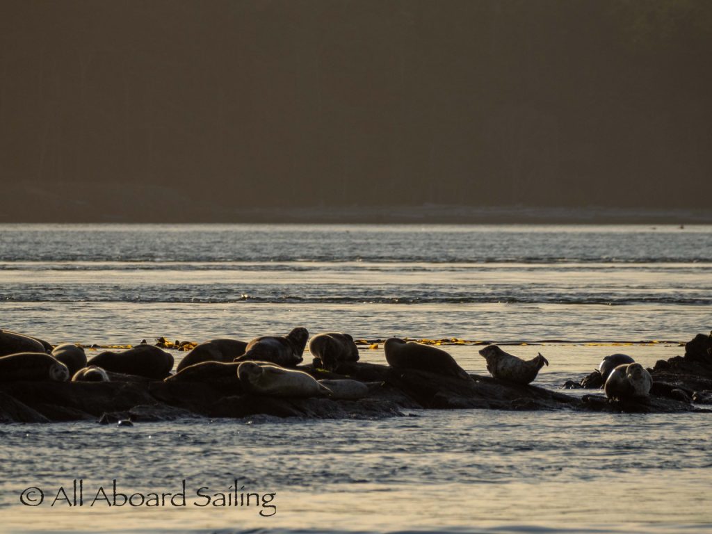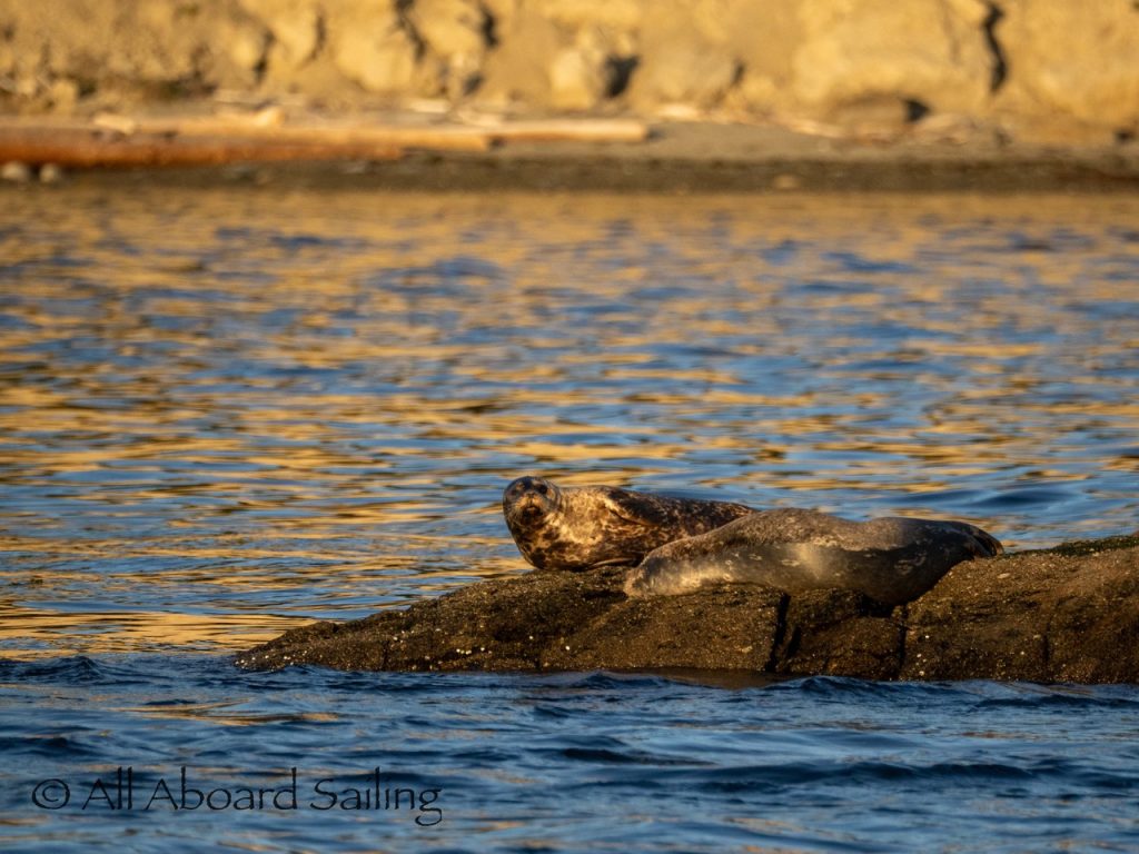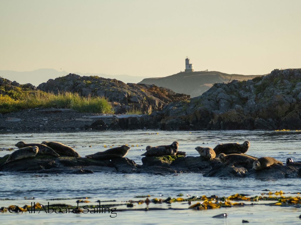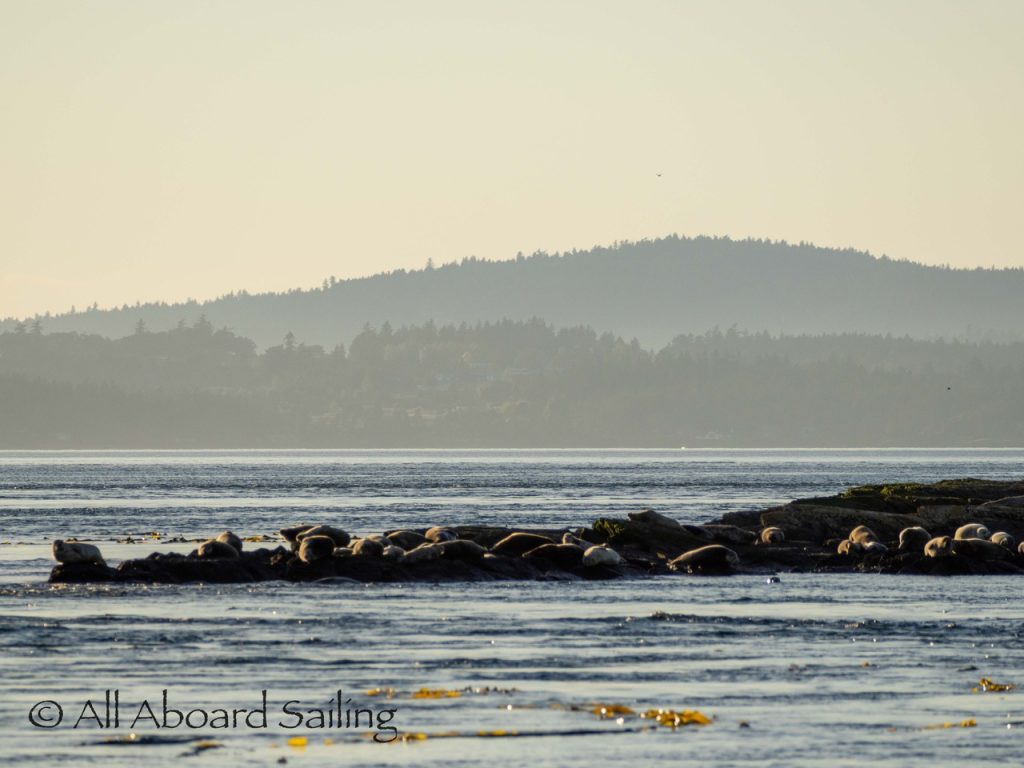 August 20, 2025 – Half day sail south to MacArthur Bank.We cast off from Friday Harbor and came inside of Turn Island spotting harbor seals hauled out and a bald eagle. Continued down San Juan Channel to Cattle Pass. On MacArthur Bank we had an encounter with humpback whale BCZ0345 “Victory – a humpback who has been hanging out in this area for at least a week now. Returned by way of Iceberg Point, Hall Island, Long Island and over to Whale Rocks to see the Steller sea lions and the roosting cormorants. Sailed near Deadman Island passing more harbor seals and up the channel to Turn Rock where we spotted a cute little sea otter. He/she has taken up residency in the Salish Sea and is often found by Bird Rocks on the east side of Lopez Island. Every now and again it hangs out by Turn Rock to our delight. We sailed back to Friday Harbor under the setting sun.