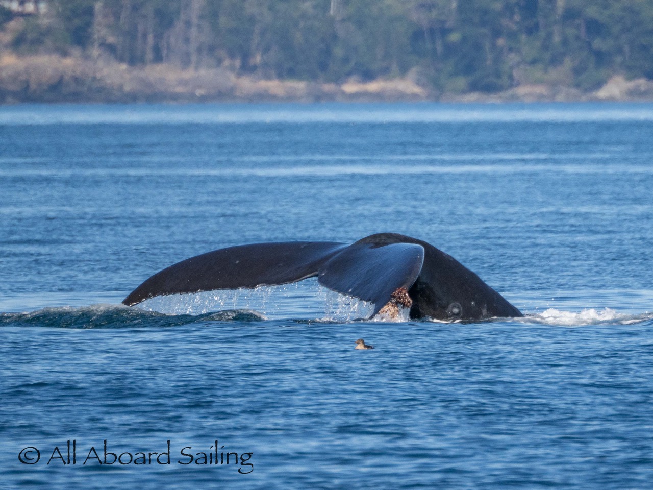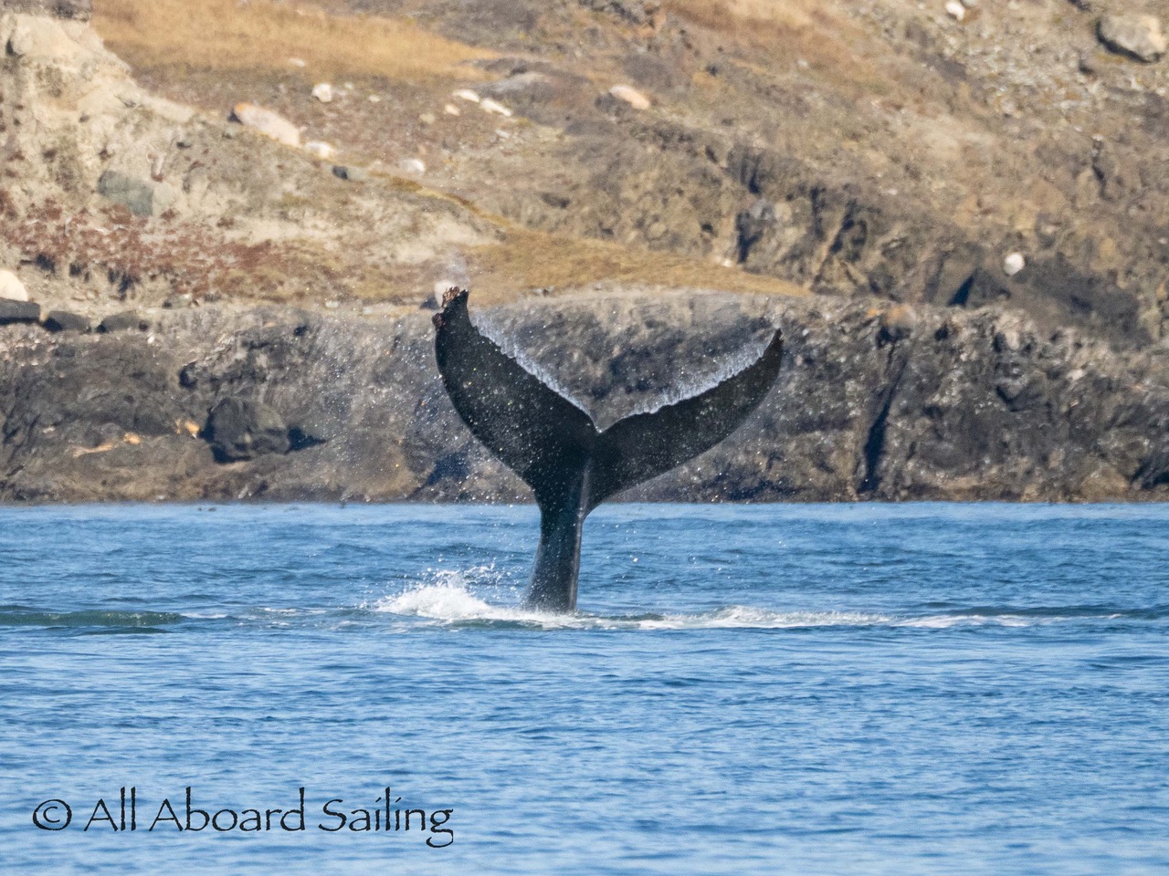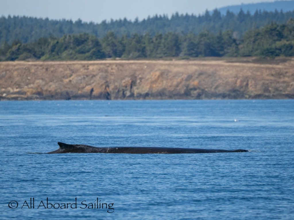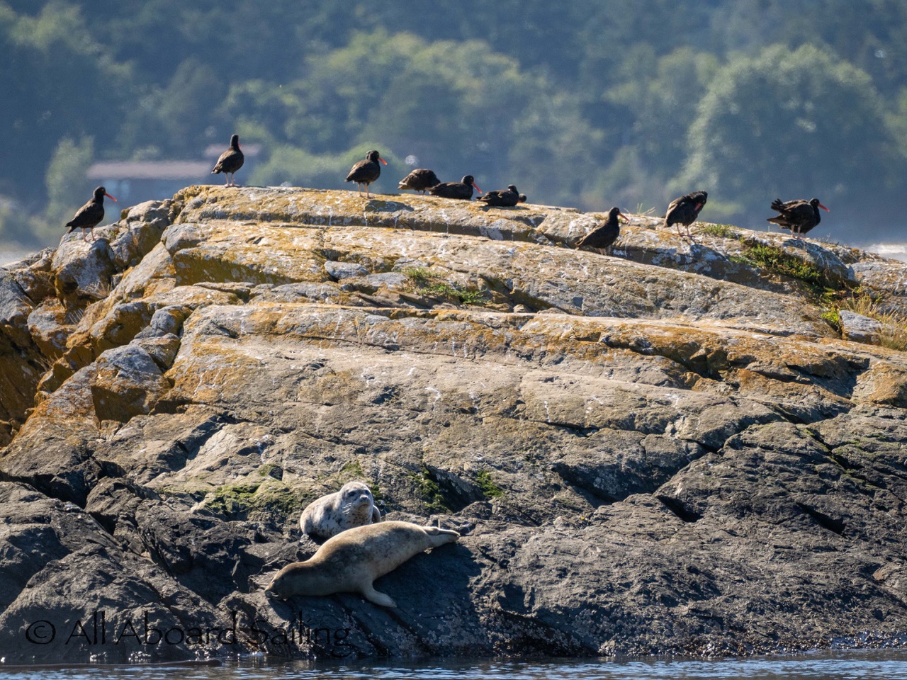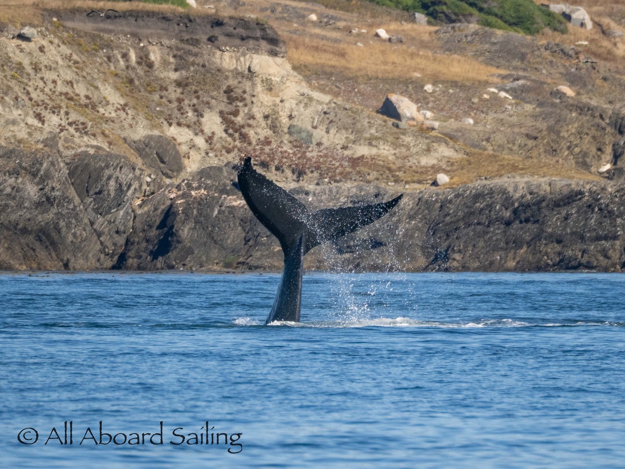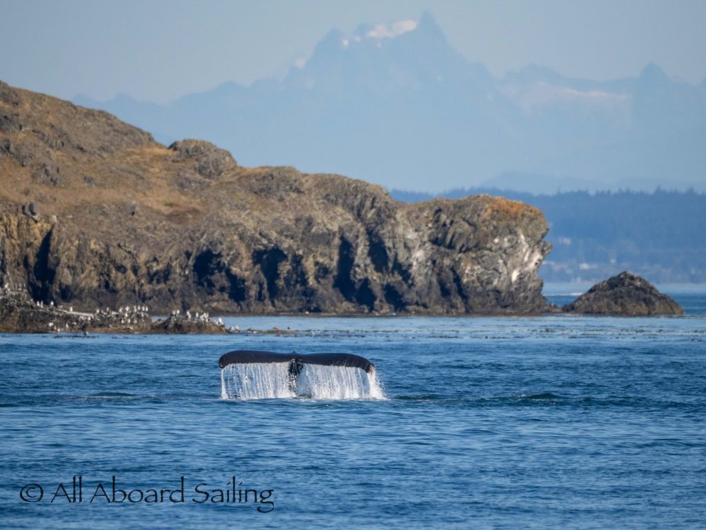August 22, 2025 – Sailed out from Friday Harbor across the channel to Shaw Island debating on which direction to travel today. We tacked to come inside of Turn Island but running out of wind and the flood tide beginning we were pushed back to circle the island. We checked out Turn Rock for the sea otter which was not there today. Pushed south to Pear Pt evading the flood current to Harbor Rock, Goose Island and Cattle Pass. We came out to Salmon Bank and met Biggs/Transient orcas, the T37A’s. Some lovely views as they meandered their way changing directions before choosing south. We tacked and sailed back to meet humpback whale BCZ0345 “Victory”. She has been in the area for some time over a week. As we were nearing Iceberg Point we watched as she did a cartwheel followed by multiple tail lobs and inverted tail lobs showing off the white underside of her tail flukes. Returning south of Long Island where a bald eagle was watching everything to Whale Rocks where the Steller sea lions seemed to be increasing in numbers of large males. Passing Deadman Island a large number of black oystercatchers gathered and harbor seals rested as we caught the flood tide north. At Turn Island we resumed a fast close-hauled sail tacking at Shaw Island to return to Friday Harbor. Beautiful summer day sailing.