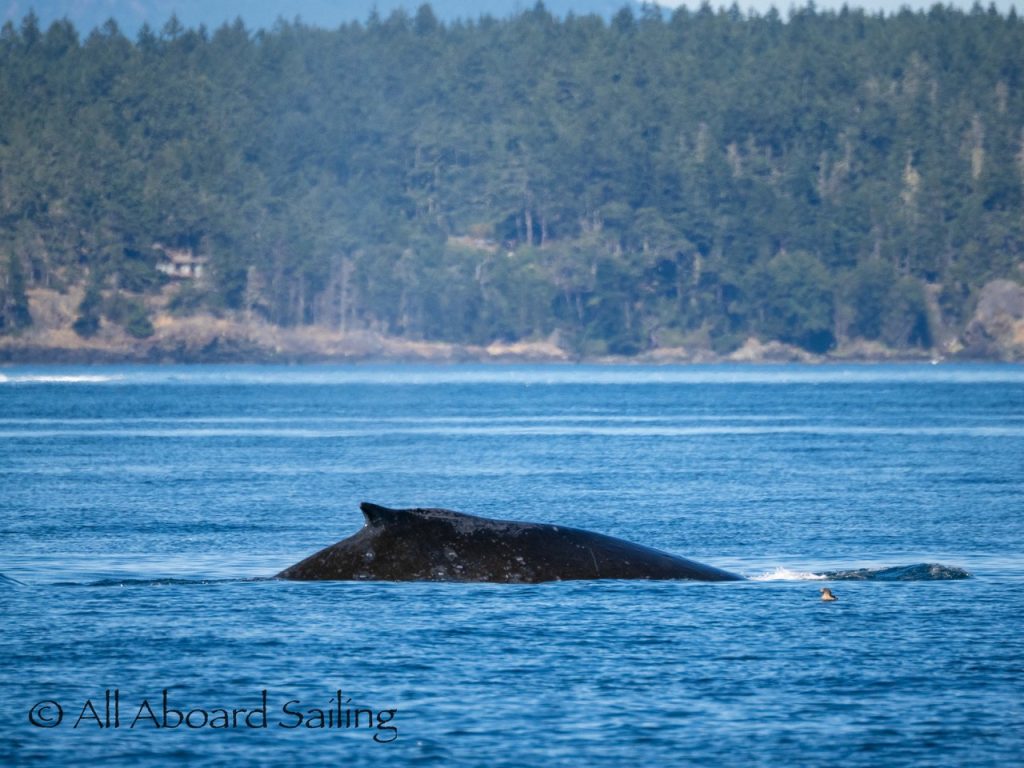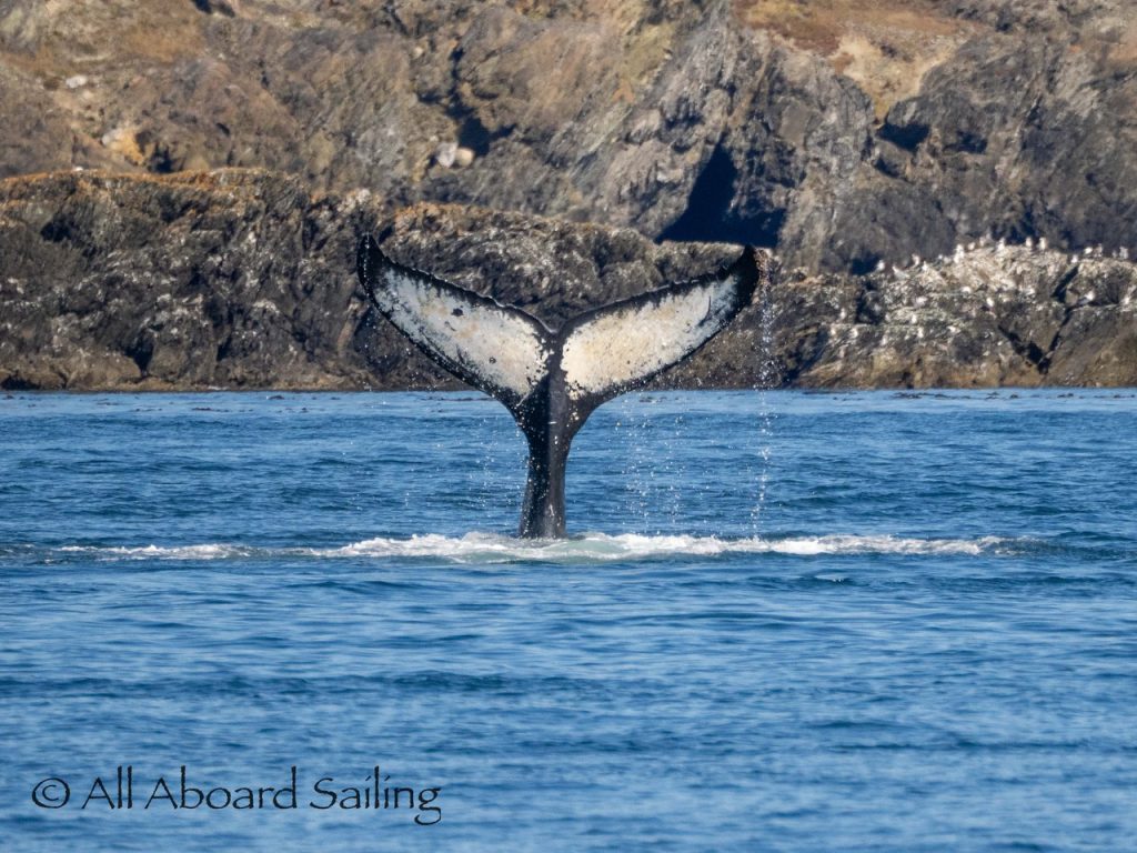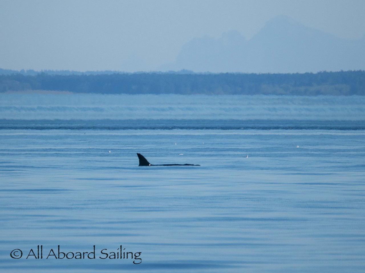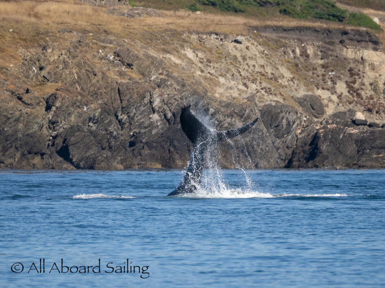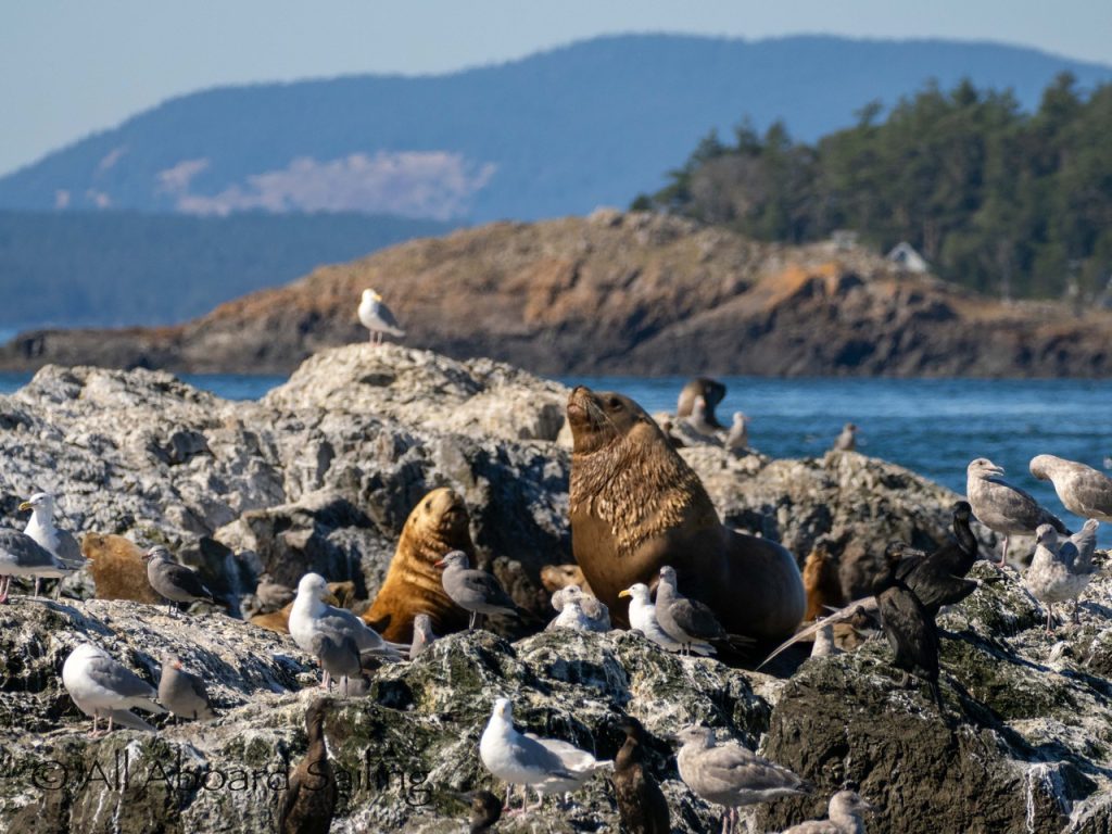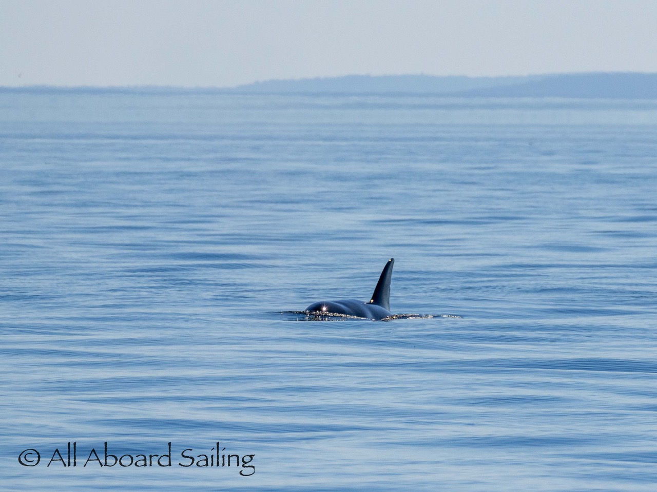 August 22, 2025 – Sailed out from Friday Harbor across the channel to Shaw Island debating on which direction to travel today. We tacked to come inside of Turn Island but running out of wind and the flood tide beginning we were pushed back to circle the island. We checked out Turn Rock for the sea otter which was not there today. Pushed south to Pear Pt evading the flood current to Harbor Rock, Goose Island and Cattle Pass. We came out to Salmon Bank and met Biggs/Transient orcas, the T37A’s. Some lovely views as they meandered their way changing directions before choosing south. We tacked and sailed back to meet humpback whale BCZ0345 “Victory”. She has been in the area for some time over a week. As we were nearing Iceberg Point we watched as she did a cartwheel followed by multiple tail lobs and inverted tail lobs showing off the white underside of her tail flukes. Returning south of Long Island where a bald eagle was watching everything to Whale Rocks where the Steller sea lions seemed to be increasing in numbers of large males. Passing Deadman Island a large number of black oystercatchers gathered and harbor seals rested as we caught the flood tide north. At Turn Island we resumed a fast close-hauled sail tacking at Shaw Island to return to Friday Harbor. Beautiful summer day sailing.