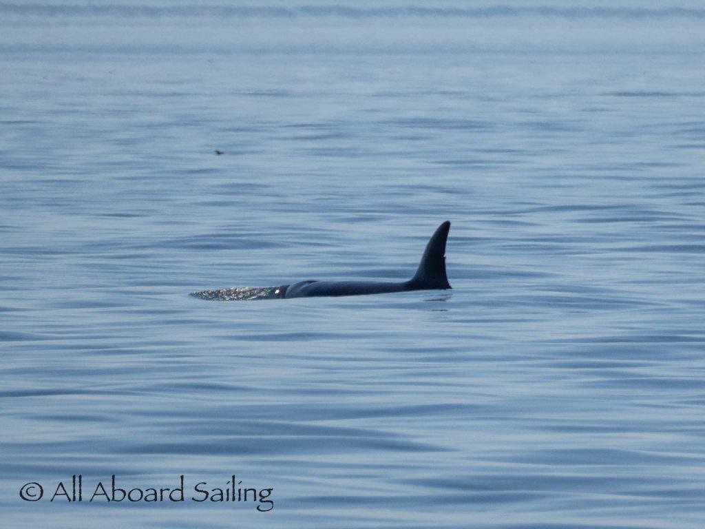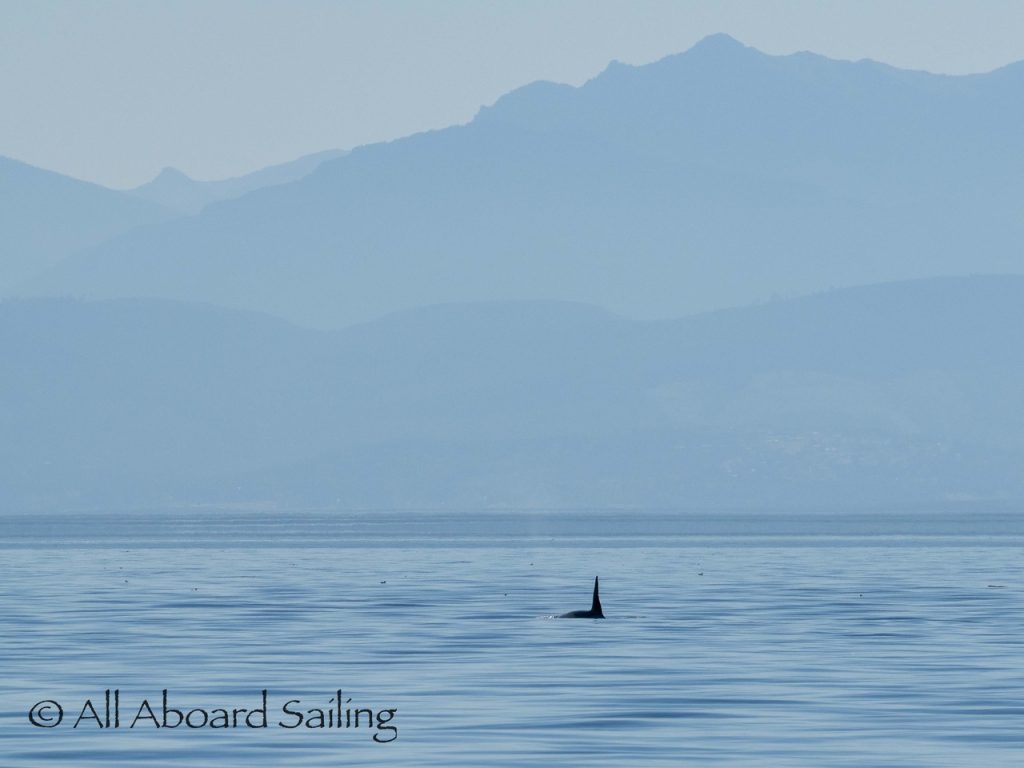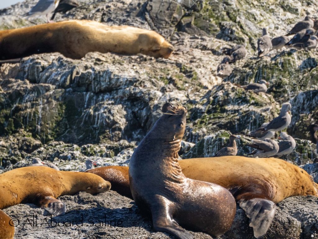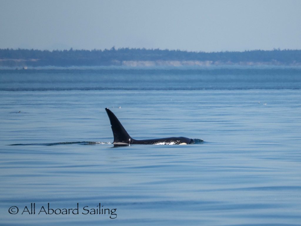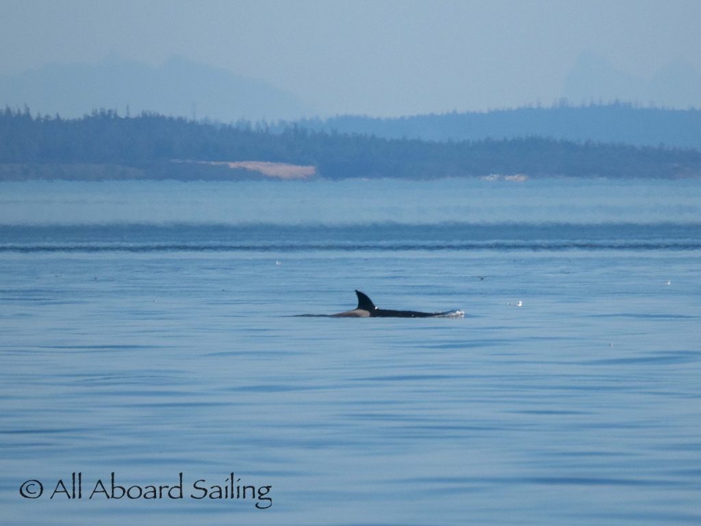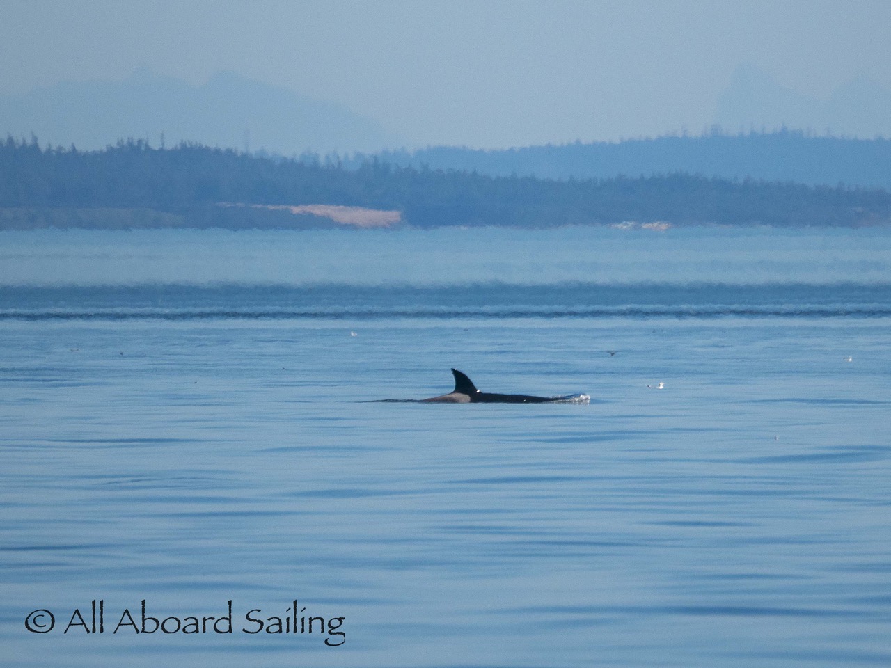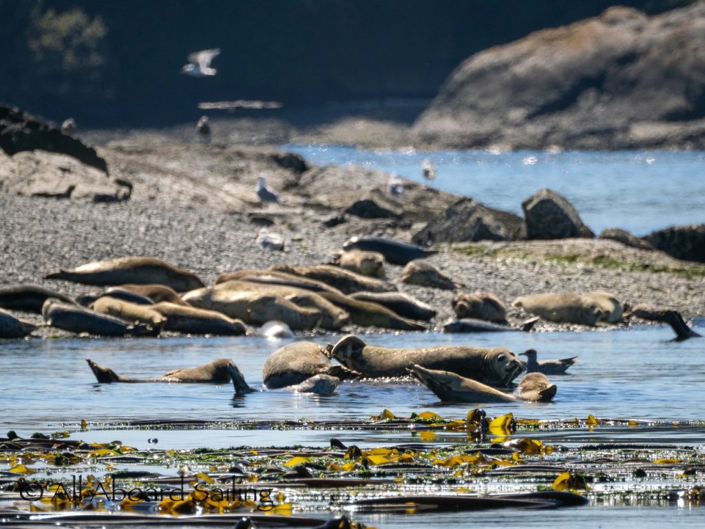 August 22, 2025 – Sailed out from Friday Harbor across the channel to Shaw Island debating on which direction to travel today. We tacked to come inside of Turn Island but running out of wind and the flood tide beginning we were pushed back to circle the island. We checked out Turn Rock for the sea otter which was not there today. Pushed south to Pear Pt evading the flood current to Harbor Rock, Goose Island and Cattle Pass. We came out to Salmon Bank and met Biggs/Transient orcas, the T37A’s. Some lovely views as they meandered their way changing directions before choosing south. We tacked and sailed back to meet humpback whale BCZ0345 “Victory”. She has been in the area for some time over a week. As we were nearing Iceberg Point we watched as she did a cartwheel followed by multiple tail lobs and inverted tail lobs showing off the white underside of her tail flukes. Returning south of Long Island where a bald eagle was watching everything to Whale Rocks where the Steller sea lions seemed to be increasing in numbers of large males. Passing Deadman Island a large number of black oystercatchers gathered and harbor seals rested as we caught the flood tide north. At Turn Island we resumed a fast close-hauled sail tacking at Shaw Island to return to Friday Harbor. Beautiful summer day sailing.