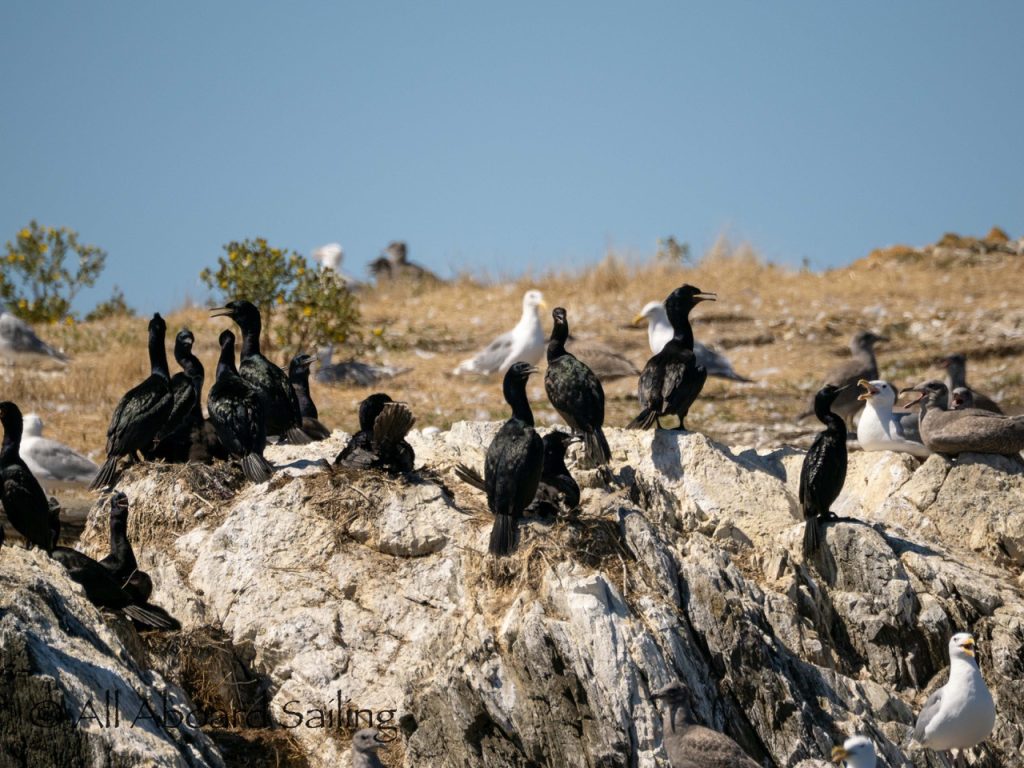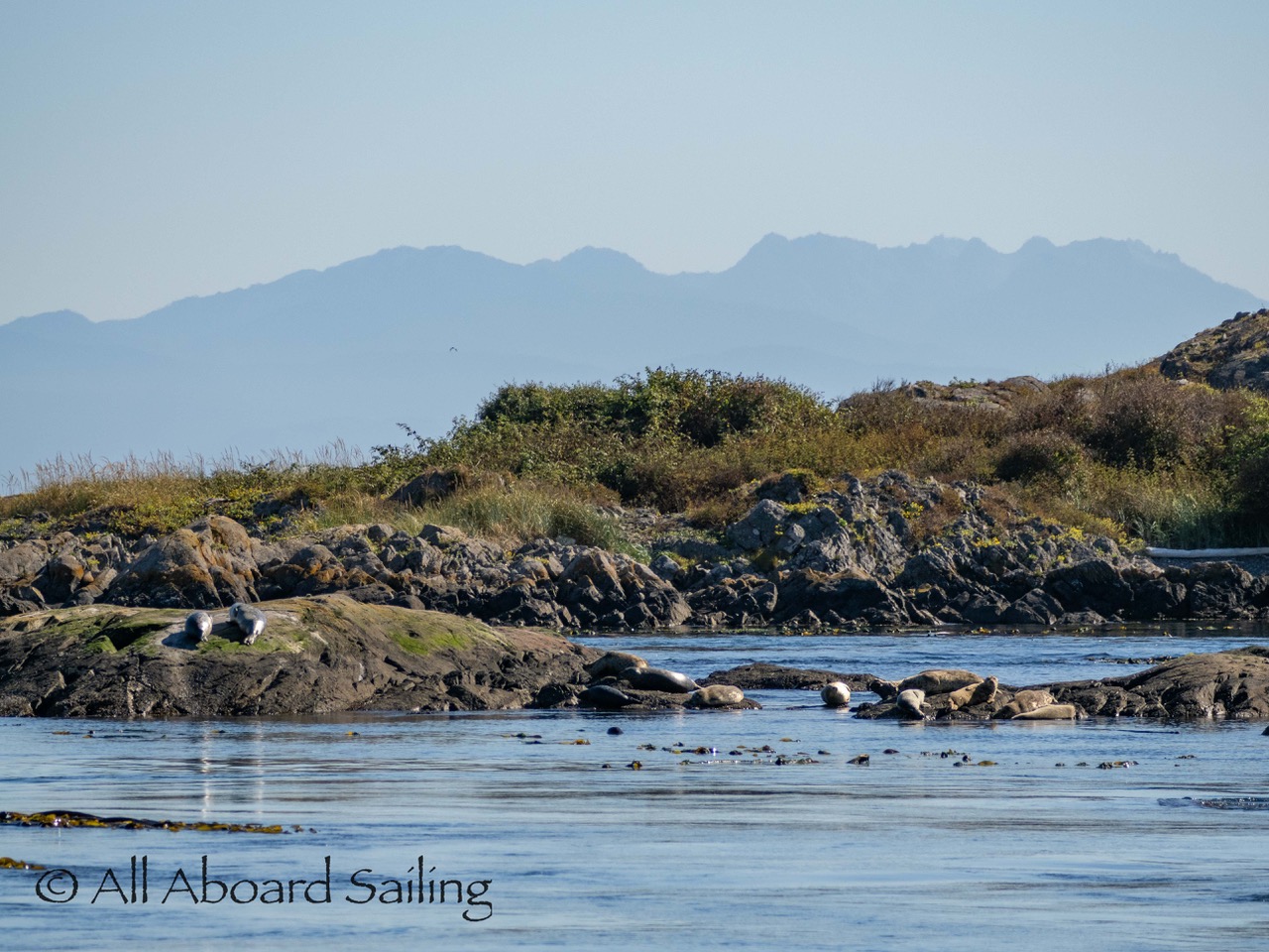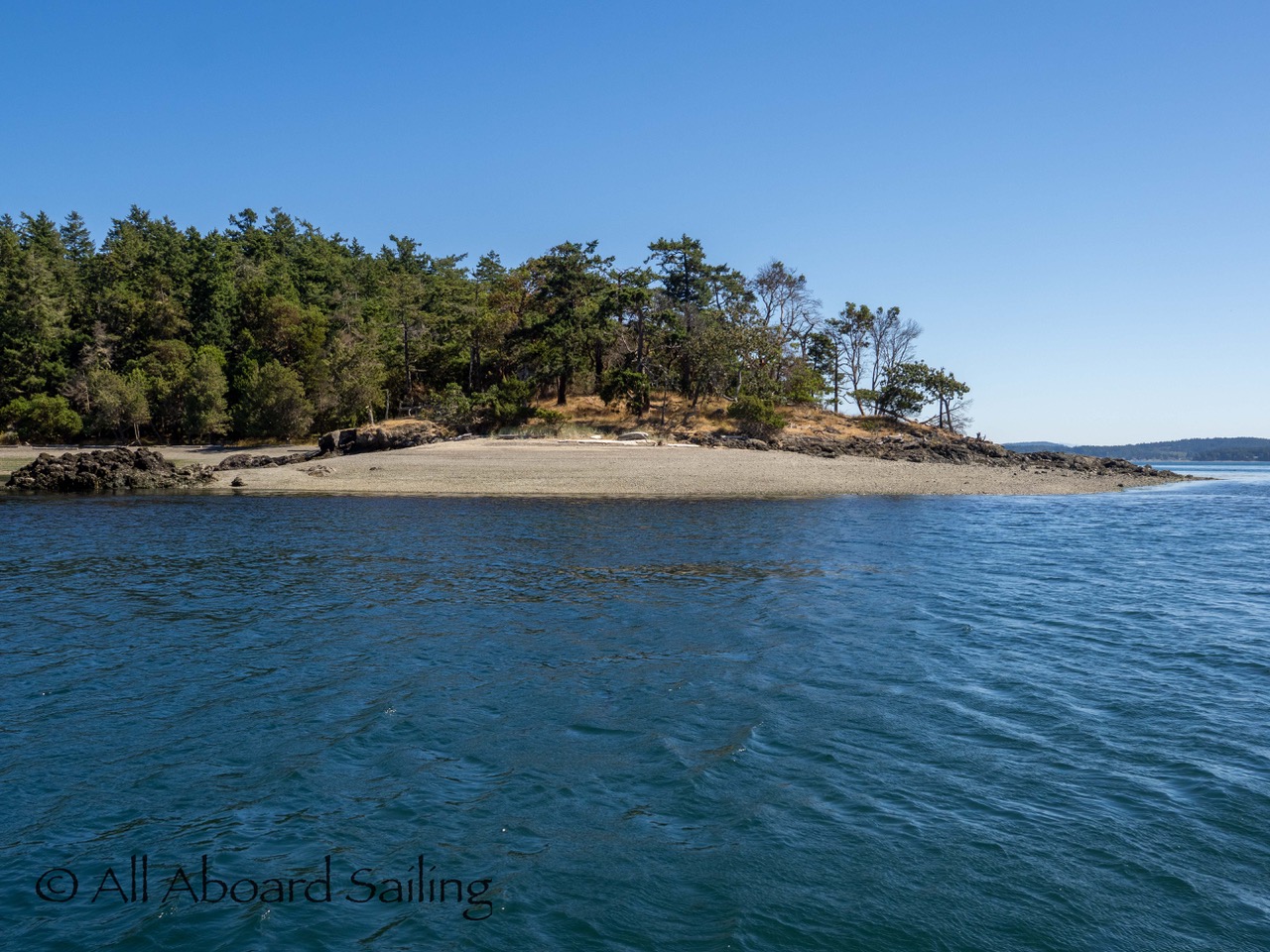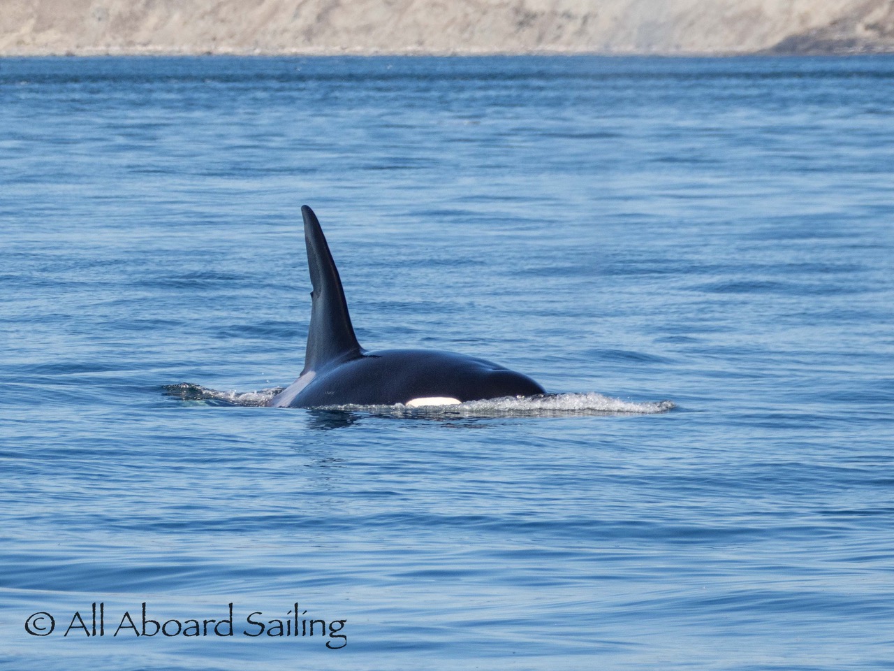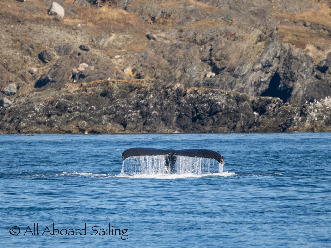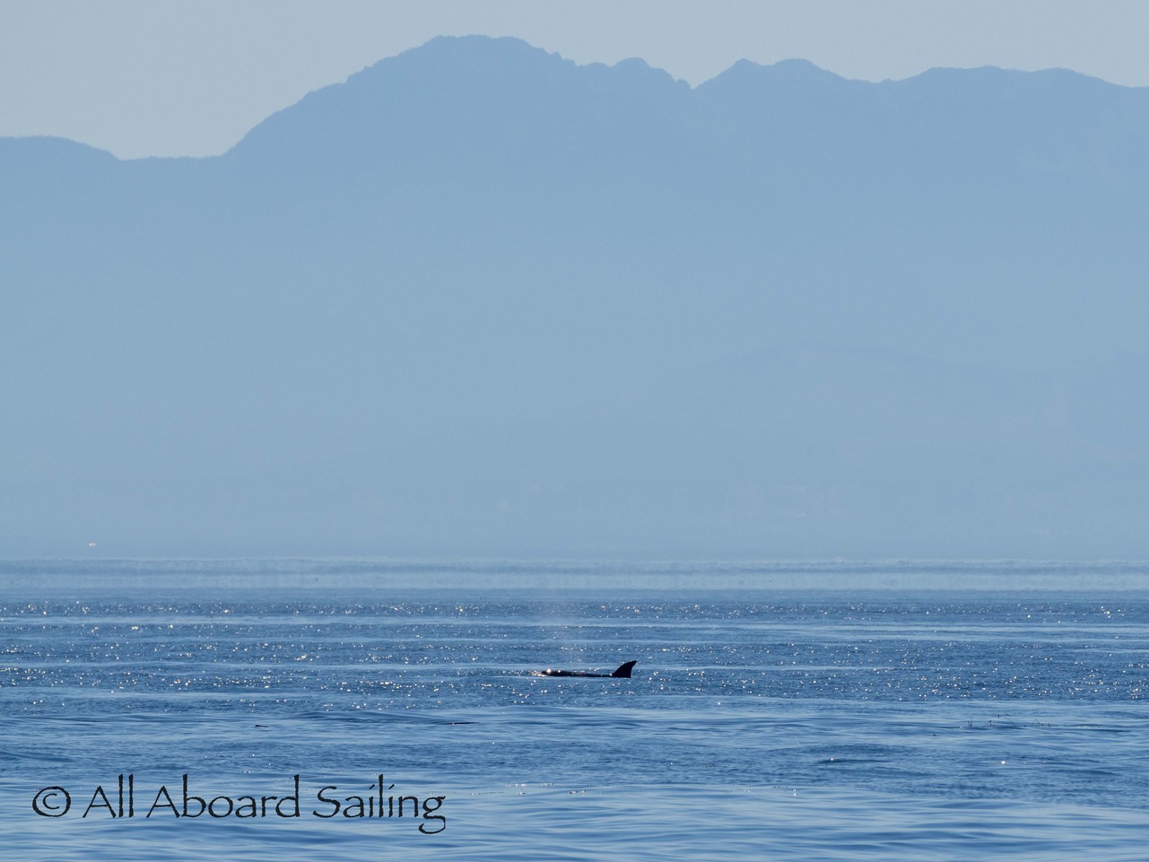 August 22, 2025 – Sailed out from Friday Harbor across the channel to Shaw Island debating on which direction to travel today. We tacked to come inside of Turn Island but running out of wind and the flood tide beginning we were pushed back to circle the island. We checked out Turn Rock for the sea otter which was not there today. Pushed south to Pear Pt evading the flood current to Harbor Rock, Goose Island and Cattle Pass. We came out to Salmon Bank and met Biggs/Transient orcas, the T37A’s. Some lovely views as they meandered their way changing directions before choosing south. We tacked and sailed back to meet humpback whale BCZ0345 “Victory”. She has been in the area for some time over a week. As we were nearing Iceberg Point we watched as she did a cartwheel followed by multiple tail lobs and inverted tail lobs showing off the white underside of her tail flukes. Returning south of Long Island where a bald eagle was watching everything to Whale Rocks where the Steller sea lions seemed to be increasing in numbers of large males. Passing Deadman Island a large number of black oystercatchers gathered and harbor seals rested as we caught the flood tide north. At Turn Island we resumed a fast close-hauled sail tacking at Shaw Island to return to Friday Harbor. Beautiful summer day sailing.