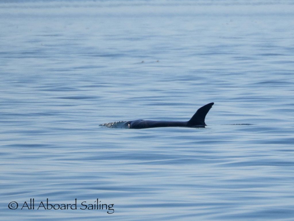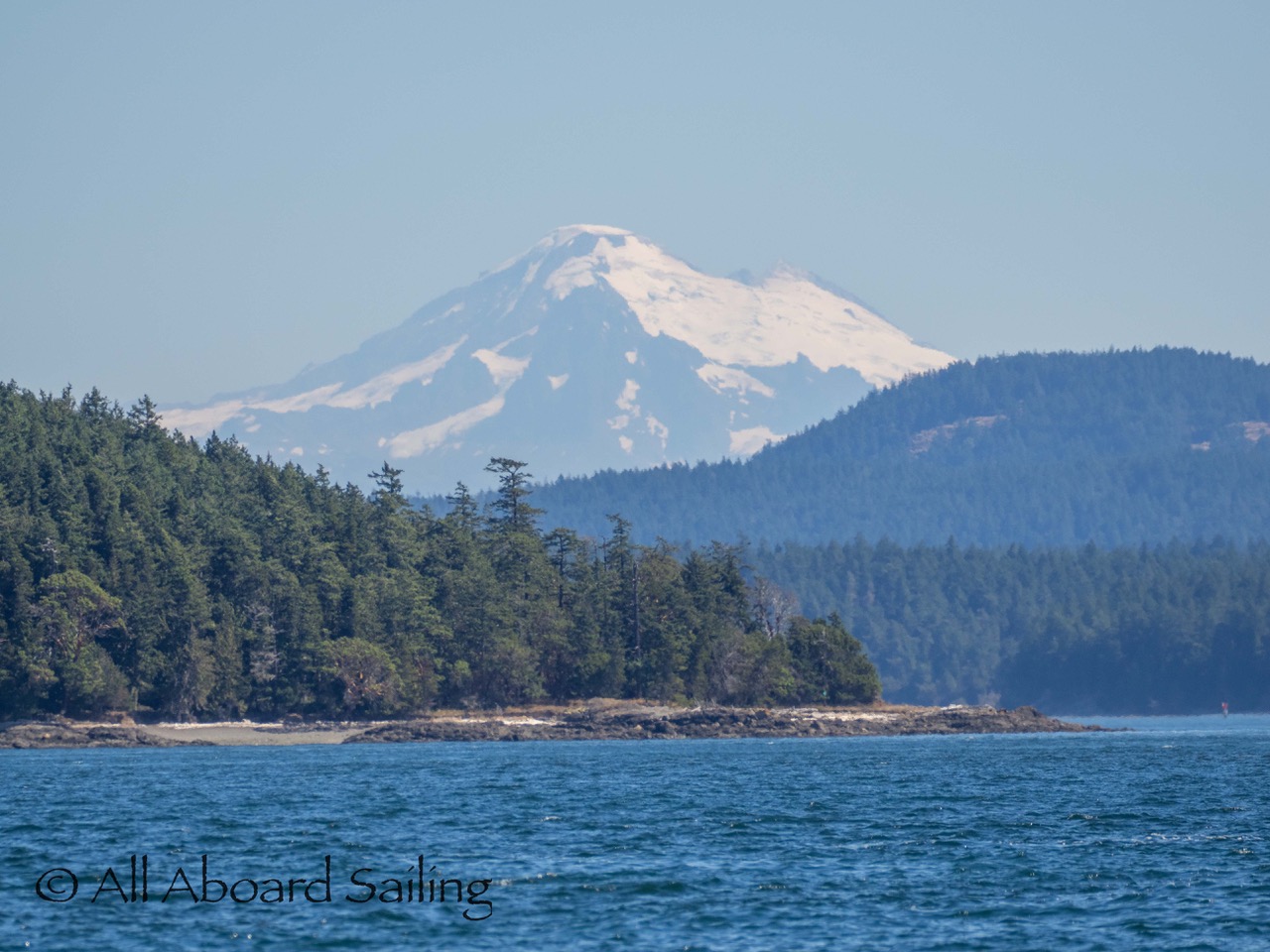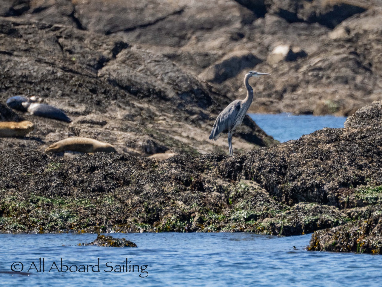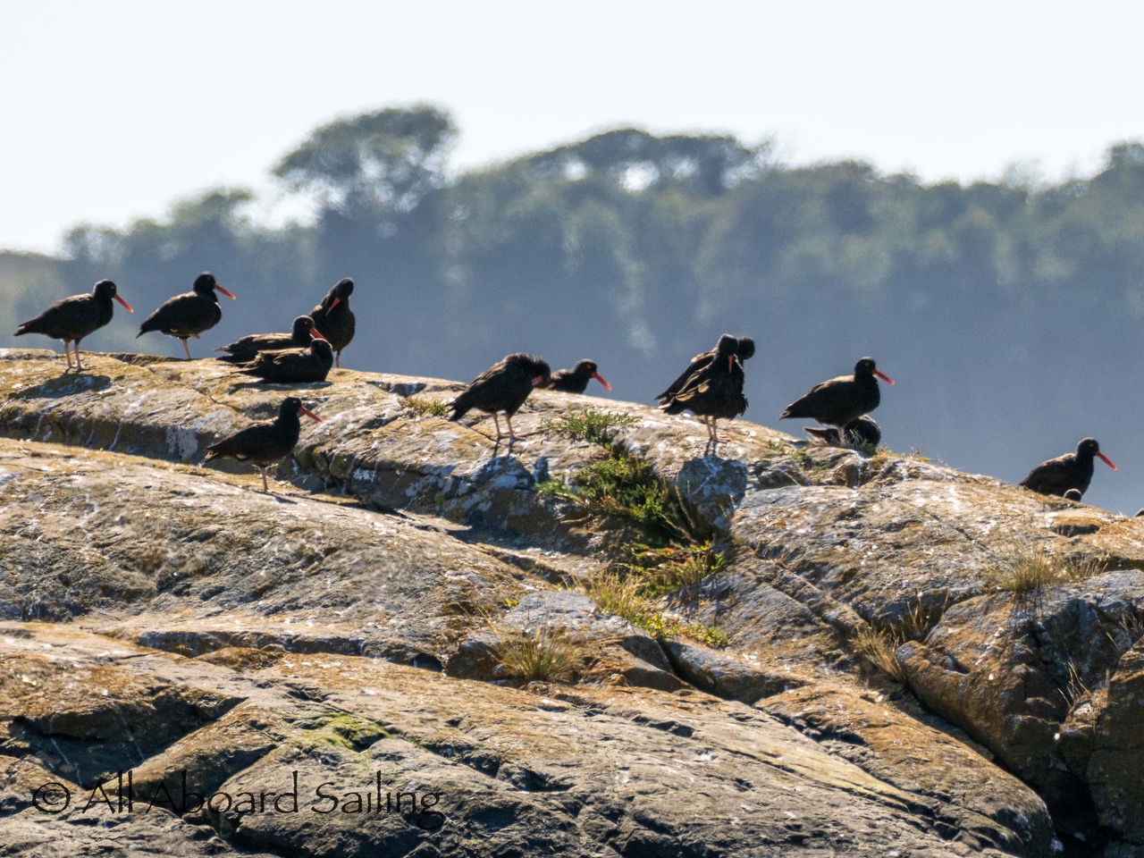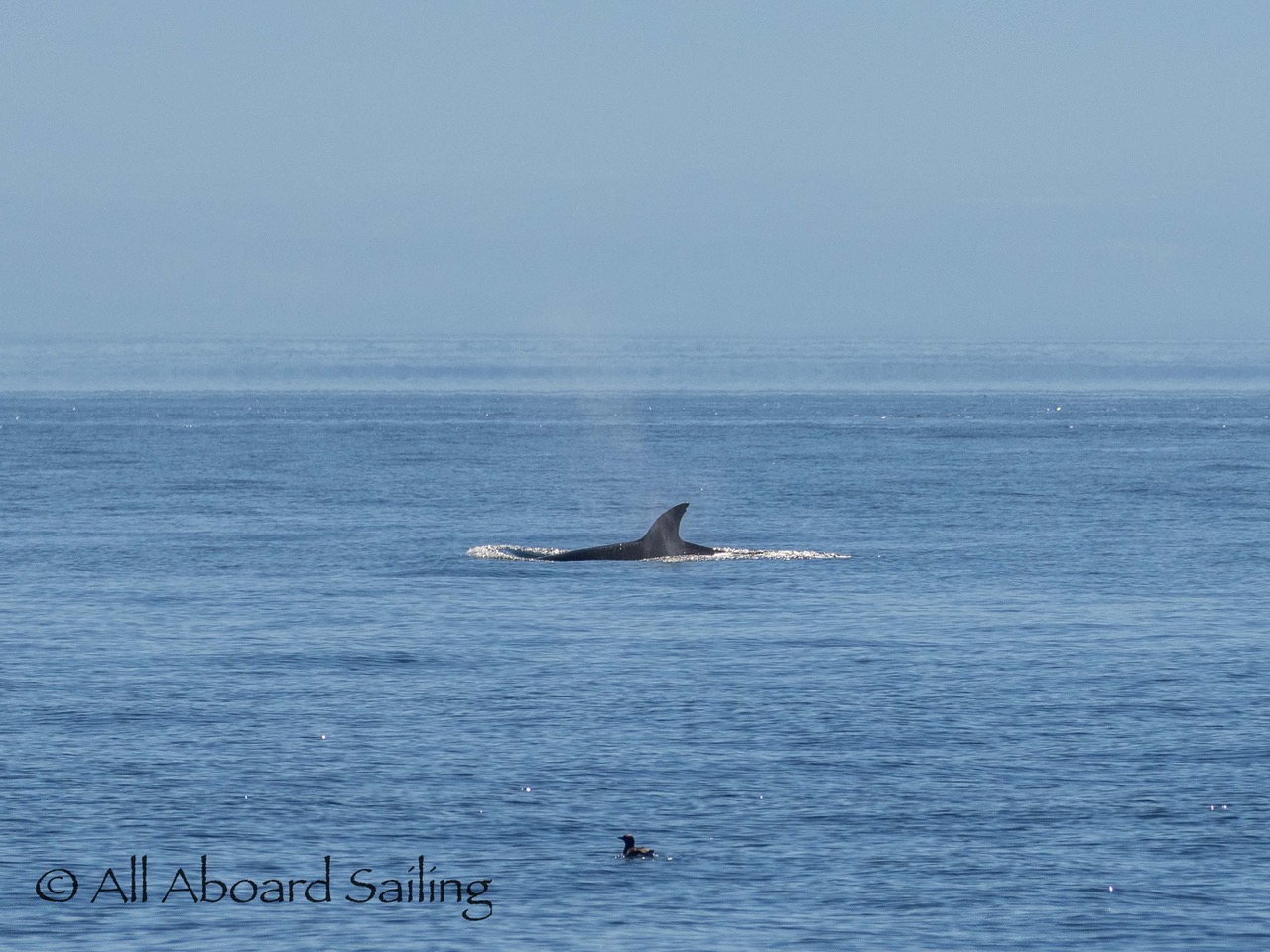 August 22, 2025 – Sailed out from Friday Harbor across the channel to Shaw Island debating on which direction to travel today. We tacked to come inside of Turn Island but running out of wind and the flood tide beginning we were pushed back to circle the island. We checked out Turn Rock for the sea otter which was not there today. Pushed south to Pear Pt evading the flood current to Harbor Rock, Goose Island and Cattle Pass. We came out to Salmon Bank and met Biggs/Transient orcas, the T37A’s. Some lovely views as they meandered their way changing directions before choosing south. We tacked and sailed back to meet humpback whale BCZ0345 “Victory”. She has been in the area for some time over a week. As we were nearing Iceberg Point we watched as she did a cartwheel followed by multiple tail lobs and inverted tail lobs showing off the white underside of her tail flukes. Returning south of Long Island where a bald eagle was watching everything to Whale Rocks where the Steller sea lions seemed to be increasing in numbers of large males. Passing Deadman Island a large number of black oystercatchers gathered and harbor seals rested as we caught the flood tide north. At Turn Island we resumed a fast close-hauled sail tacking at Shaw Island to return to Friday Harbor. Beautiful summer day sailing.
