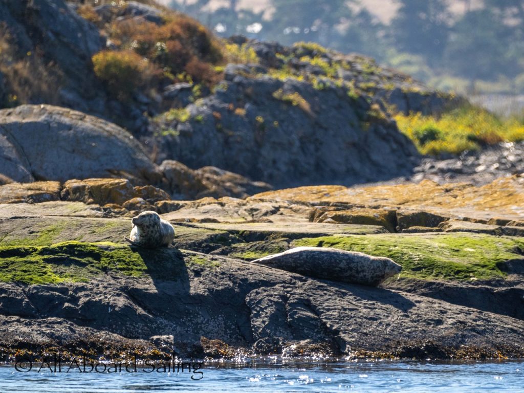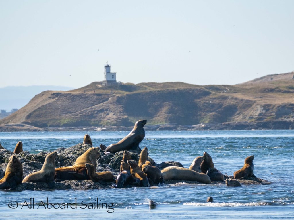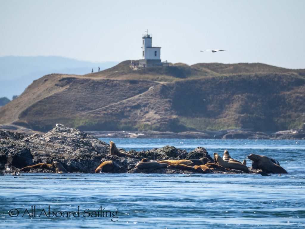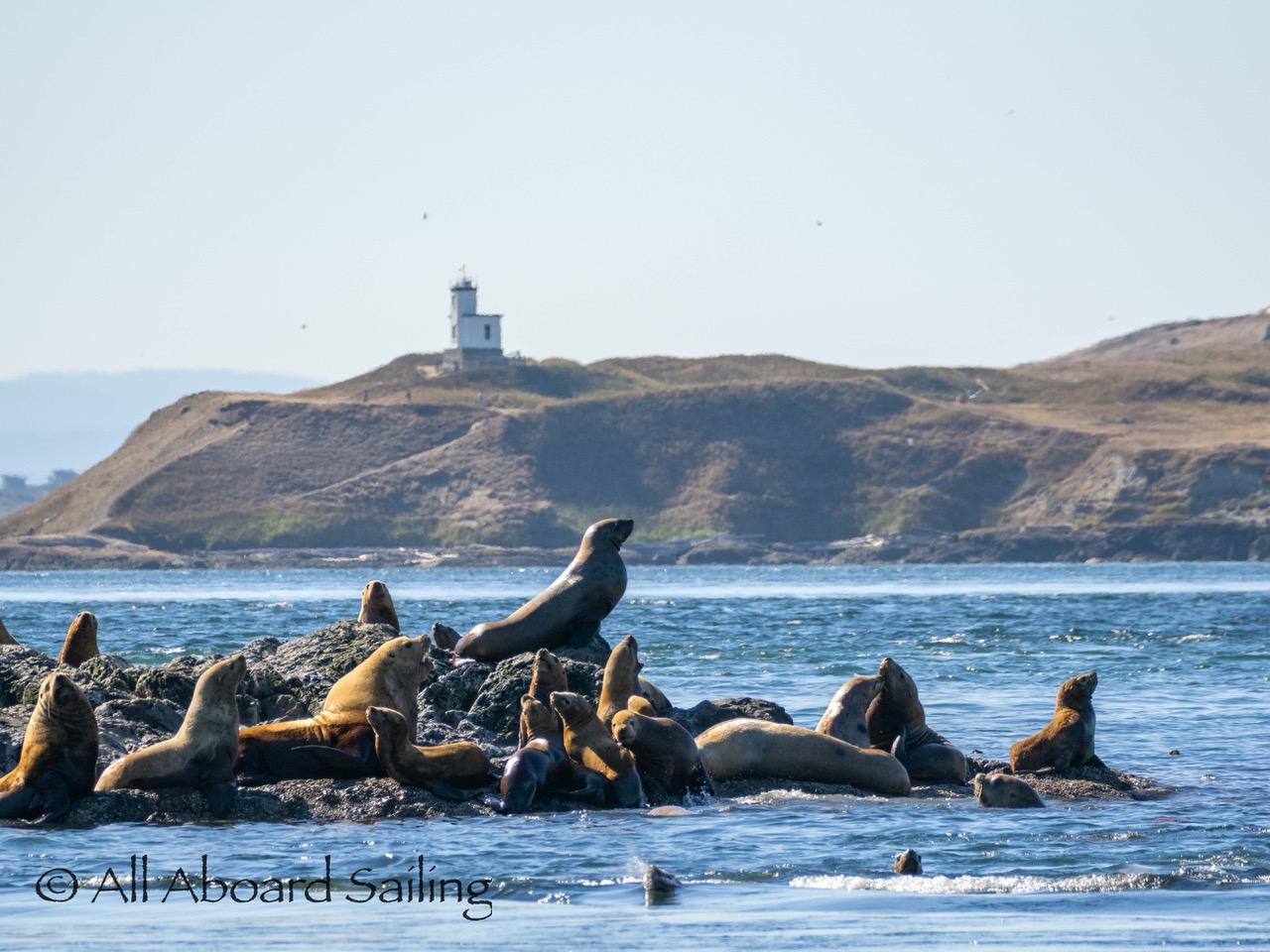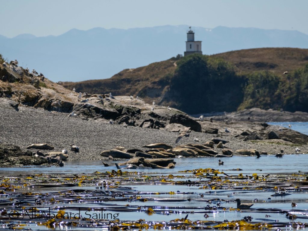 Harbor seals on Goose Island with Cattle Pt Lighthouse
