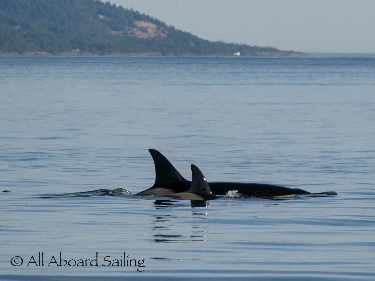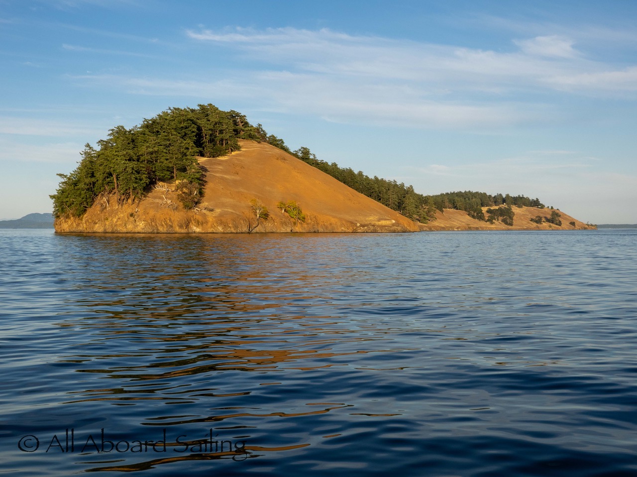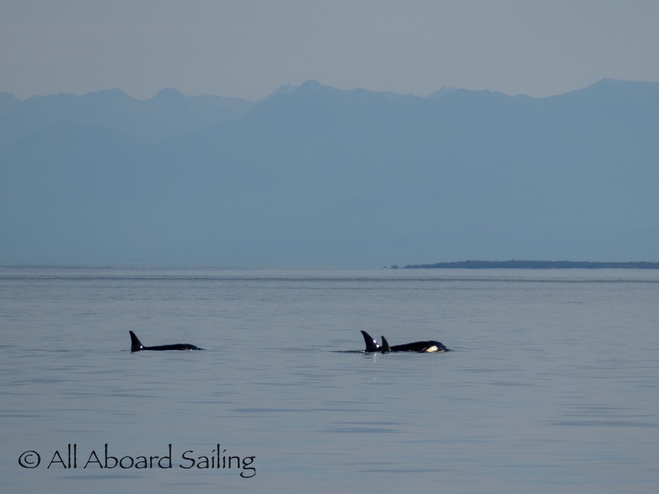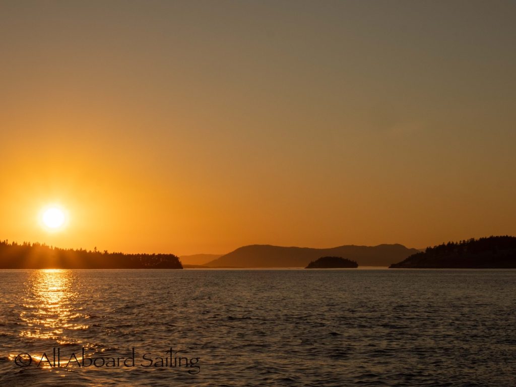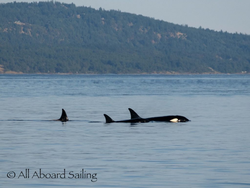 August 23, 2025 – With a report of Biggs/Transient orcas known as the T60’s northbound in Haro Strait near the westside of San Juan Island we sailed north. Keeping close to the San Juan Island shoreline through Spieden Channel to evade the flood current and cut through the pass by Battleship Island. We came down the Henry Island shoreline as the orcas came towards us after hunting in Open Bay, however they cut across the Strait towards Sidney Island and we met them after a fast sail. We sailed alongside listening to their blows in mirror calm water. Leaving them at Sidney Island to sail back to the north side of Spieden Island and take New Channel to Jones Island and the Wasp Islands. Gorgeous sunset as we headed back to Friday Harbor.