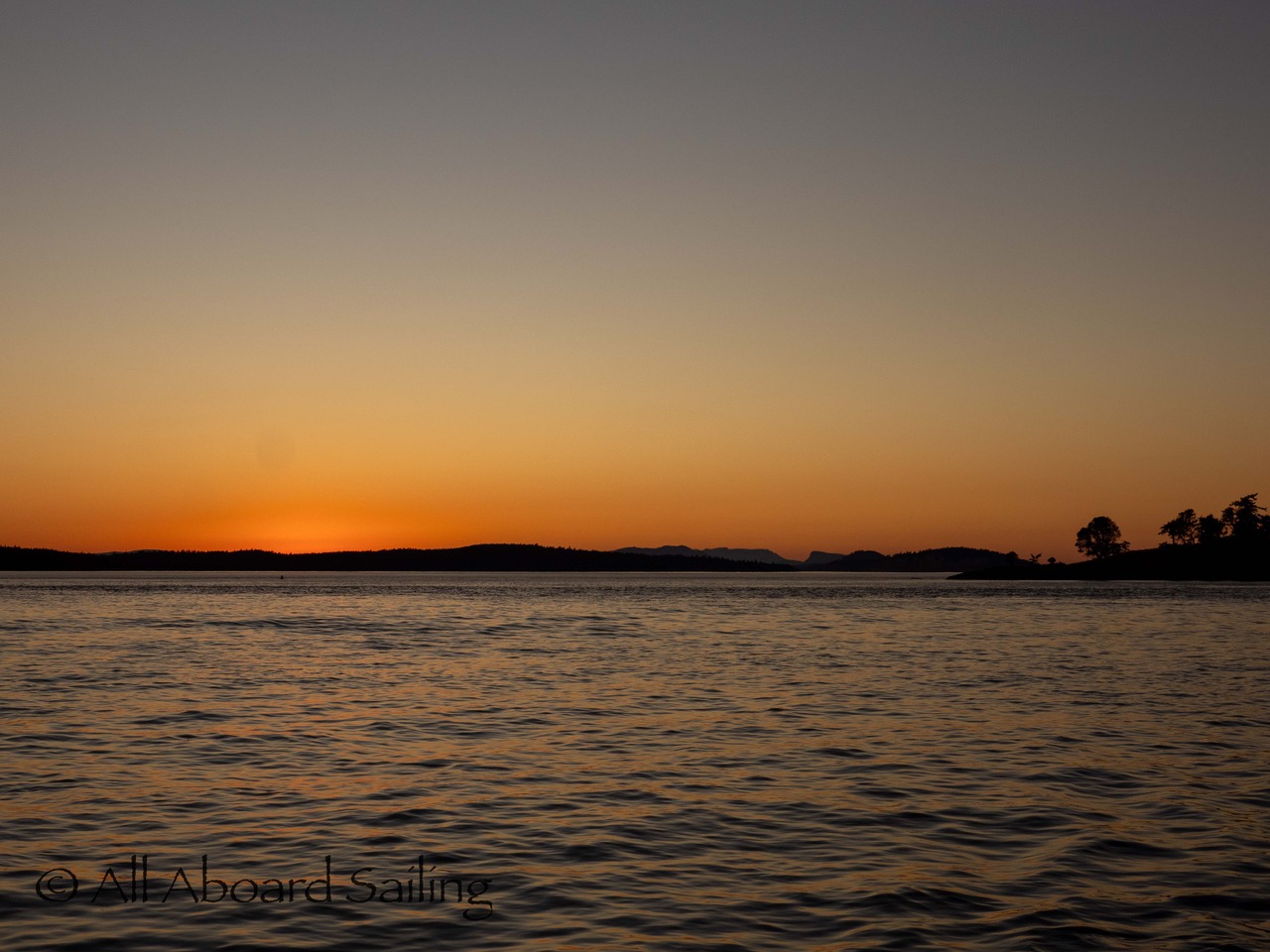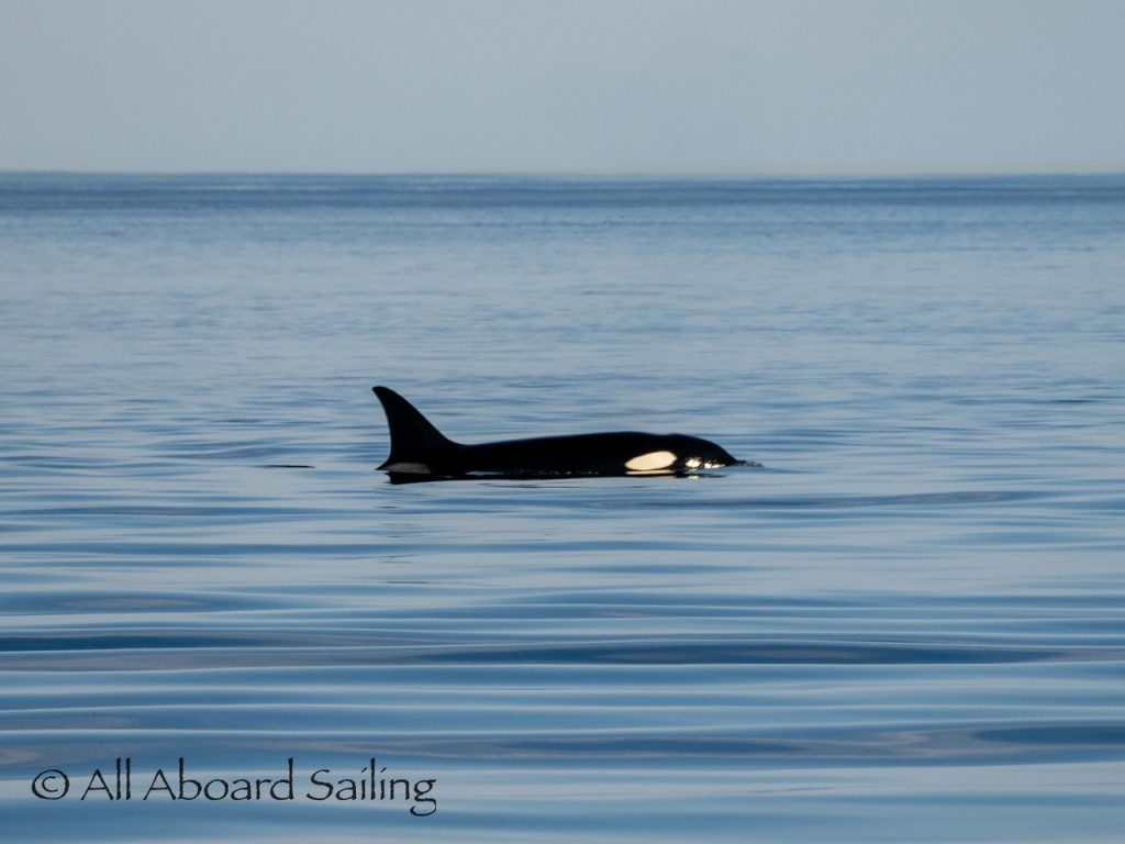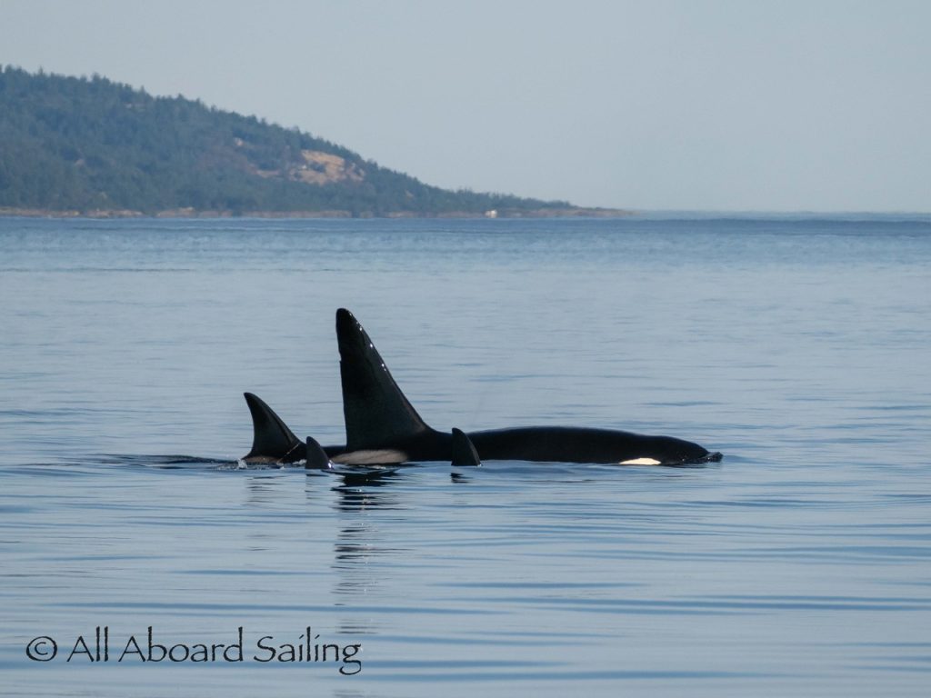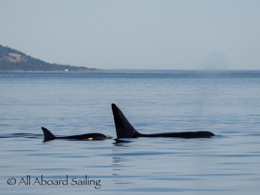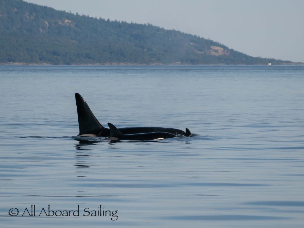 August 23, 2025 – With a report of Biggs/Transient orcas known as the T60’s northbound in Haro Strait near the westside of San Juan Island we sailed north. Keeping close to the San Juan Island shoreline through Spieden Channel to evade the flood current and cut through the pass by Battleship Island. We came down the Henry Island shoreline as the orcas came towards us after hunting in Open Bay, however they cut across the Strait towards Sidney Island and we met them after a fast sail. We sailed alongside listening to their blows in mirror calm water. Leaving them at Sidney Island to sail back to the north side of Spieden Island and take New Channel to Jones Island and the Wasp Islands. Gorgeous sunset as we headed back to Friday Harbor.