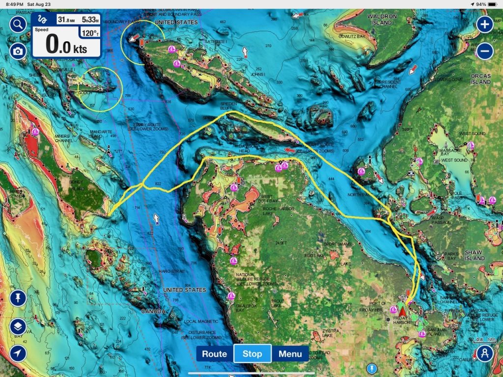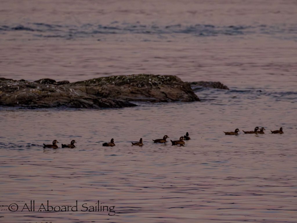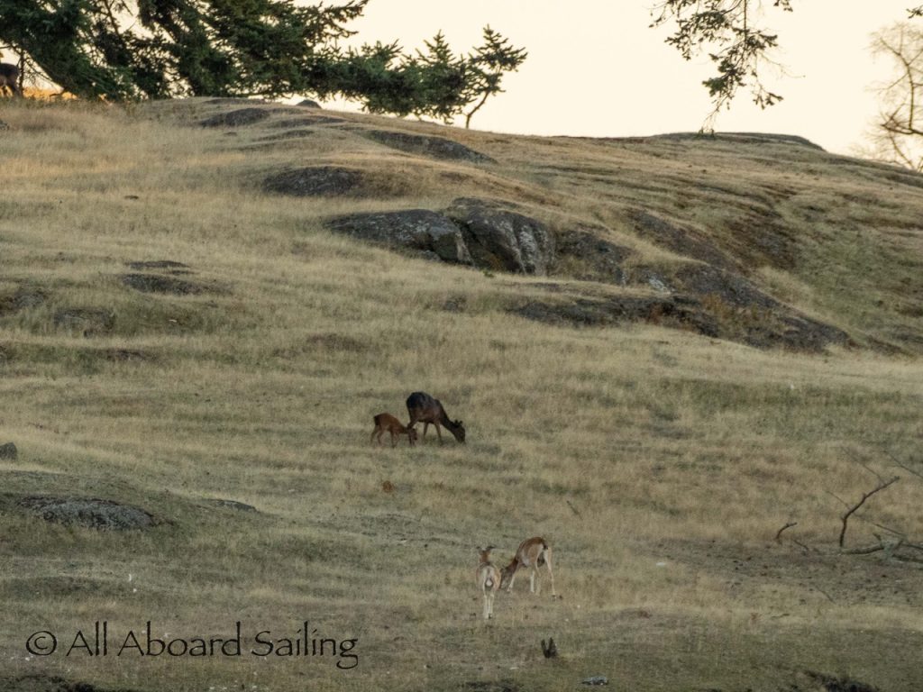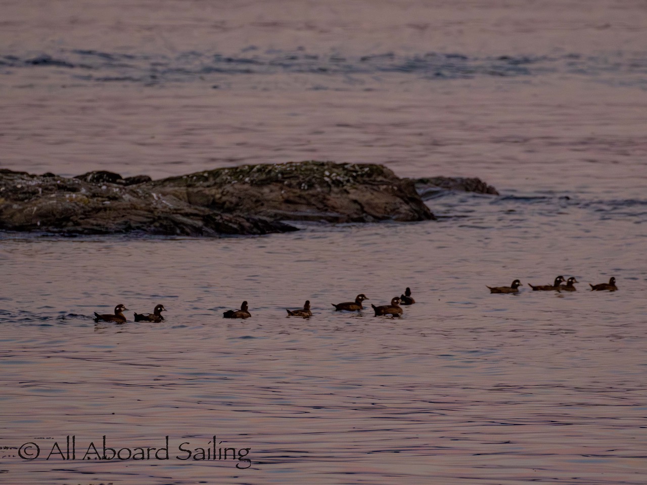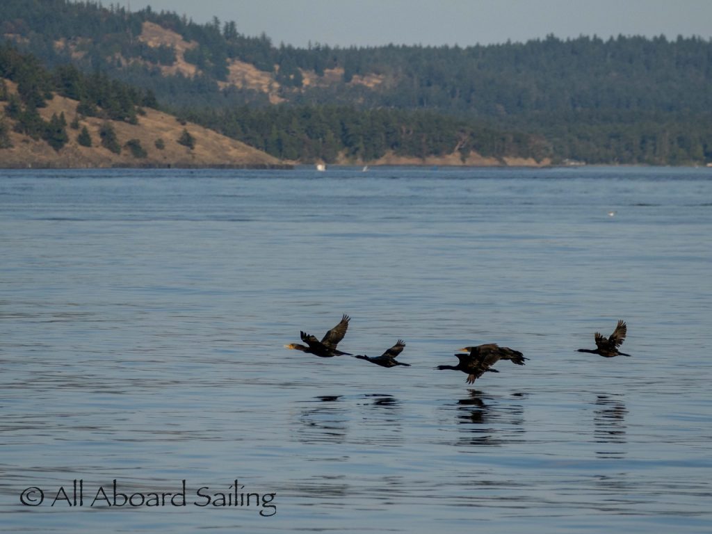 August 23, 2025 – With a report of Biggs/Transient orcas known as the T60’s northbound in Haro Strait near the westside of San Juan Island we sailed north. Keeping close to the San Juan Island shoreline through Spieden Channel to evade the flood current and cut through the pass by Battleship Island. We came down the Henry Island shoreline as the orcas came towards us after hunting in Open Bay, however they cut across the Strait towards Sidney Island and we met them after a fast sail. We sailed alongside listening to their blows in mirror calm water. Leaving them at Sidney Island to sail back to the north side of Spieden Island and take New Channel to Jones Island and the Wasp Islands. Gorgeous sunset as we headed back to Friday Harbor.