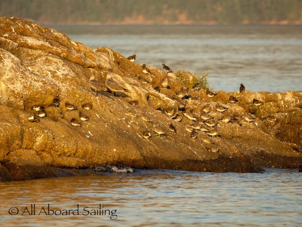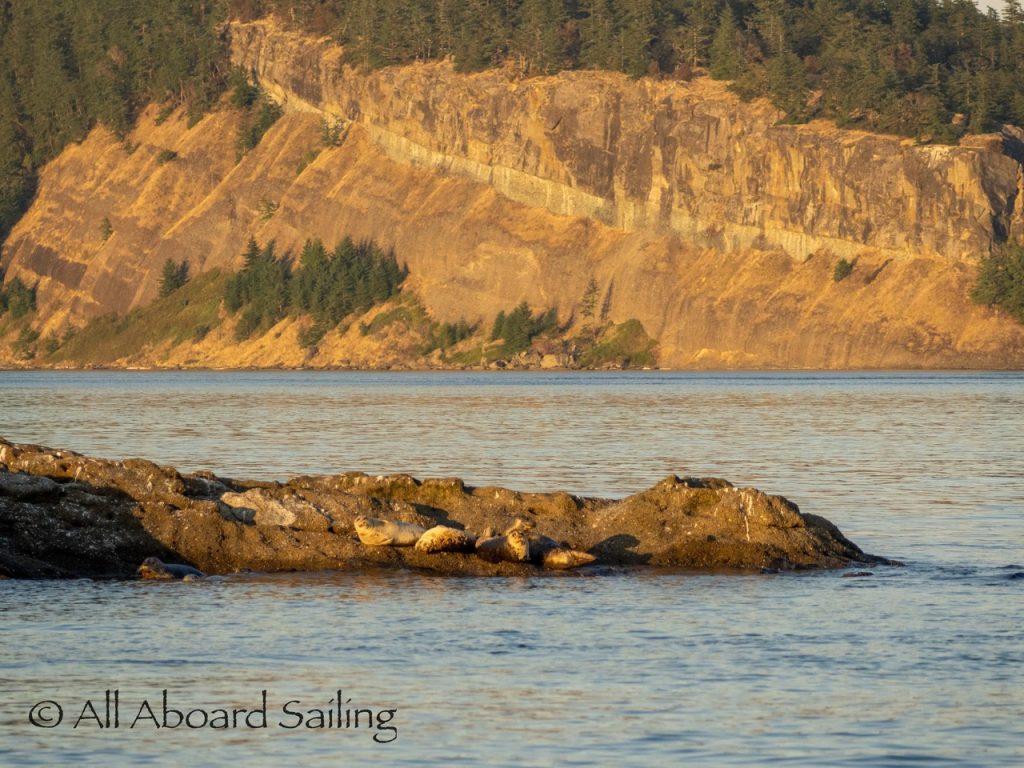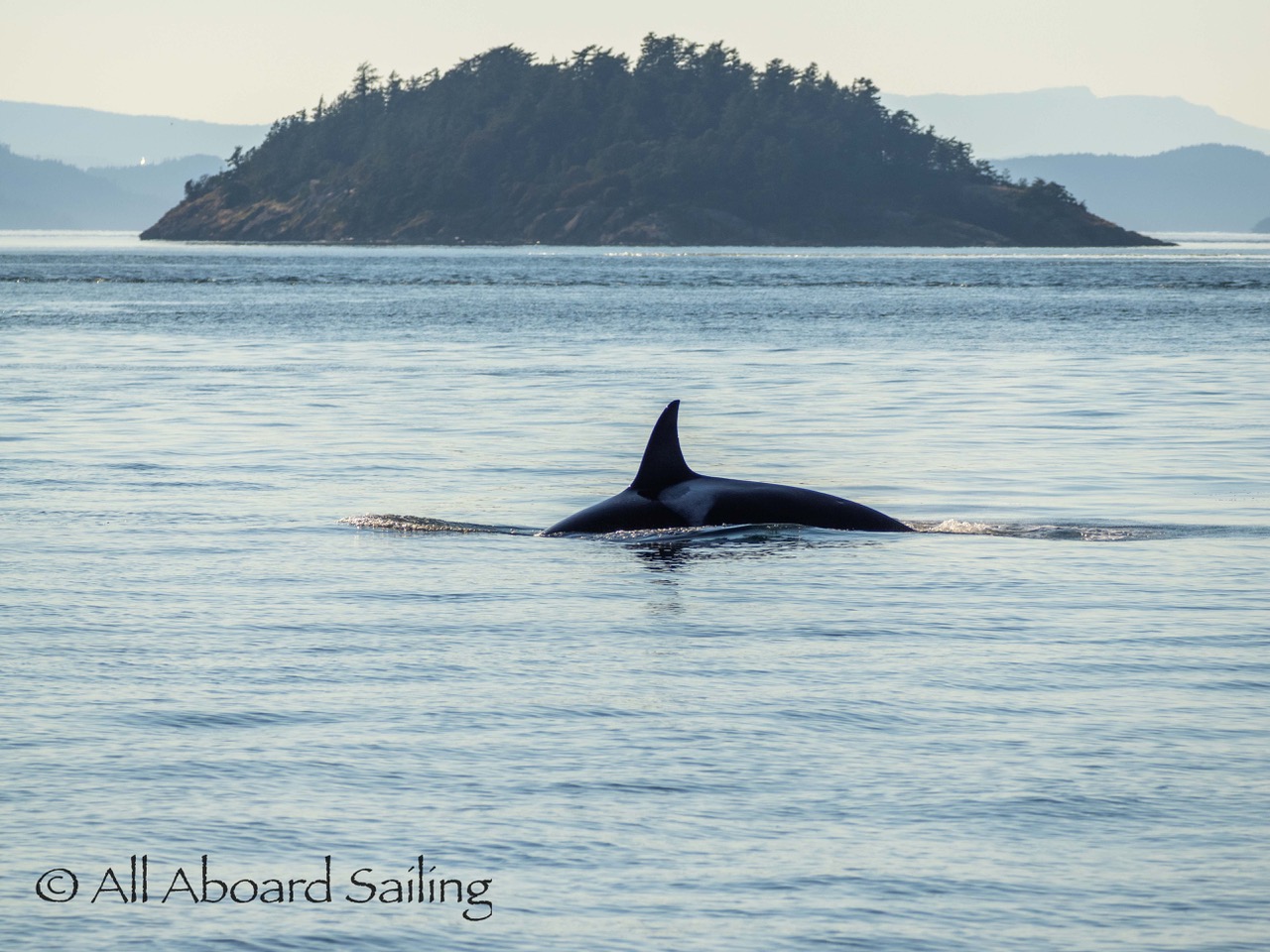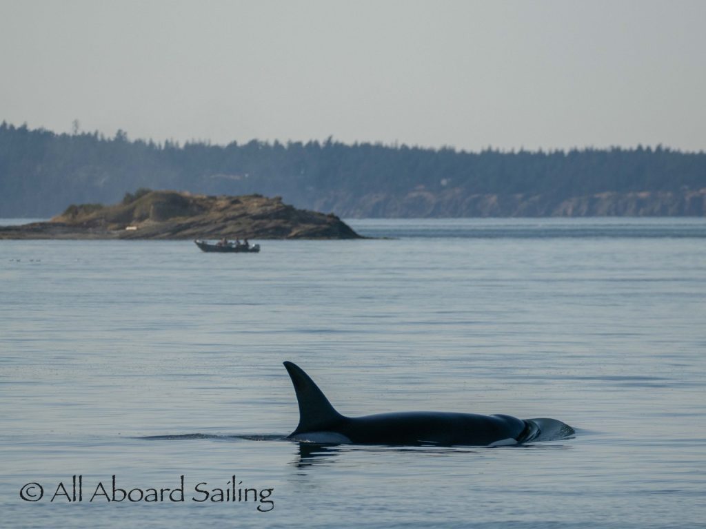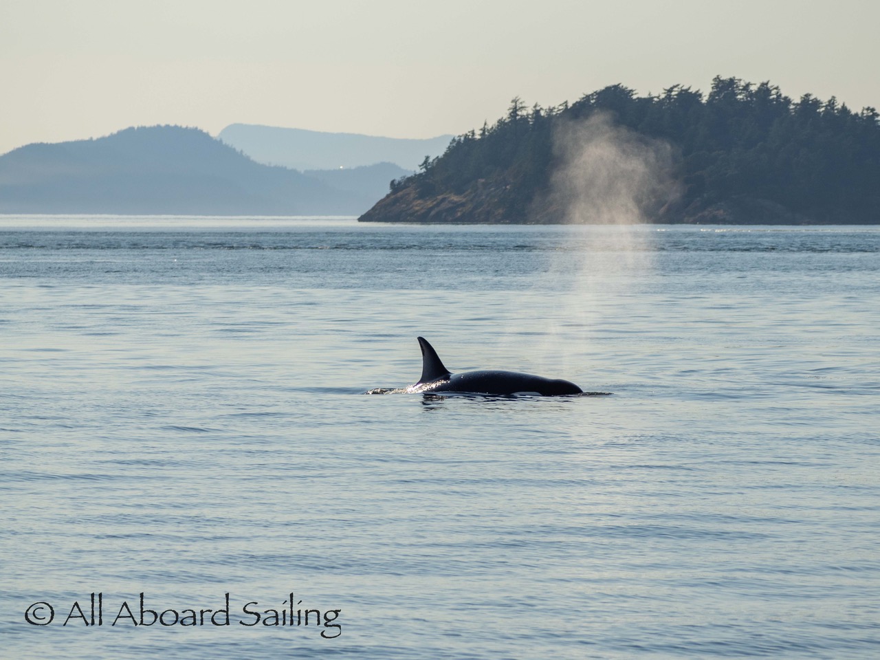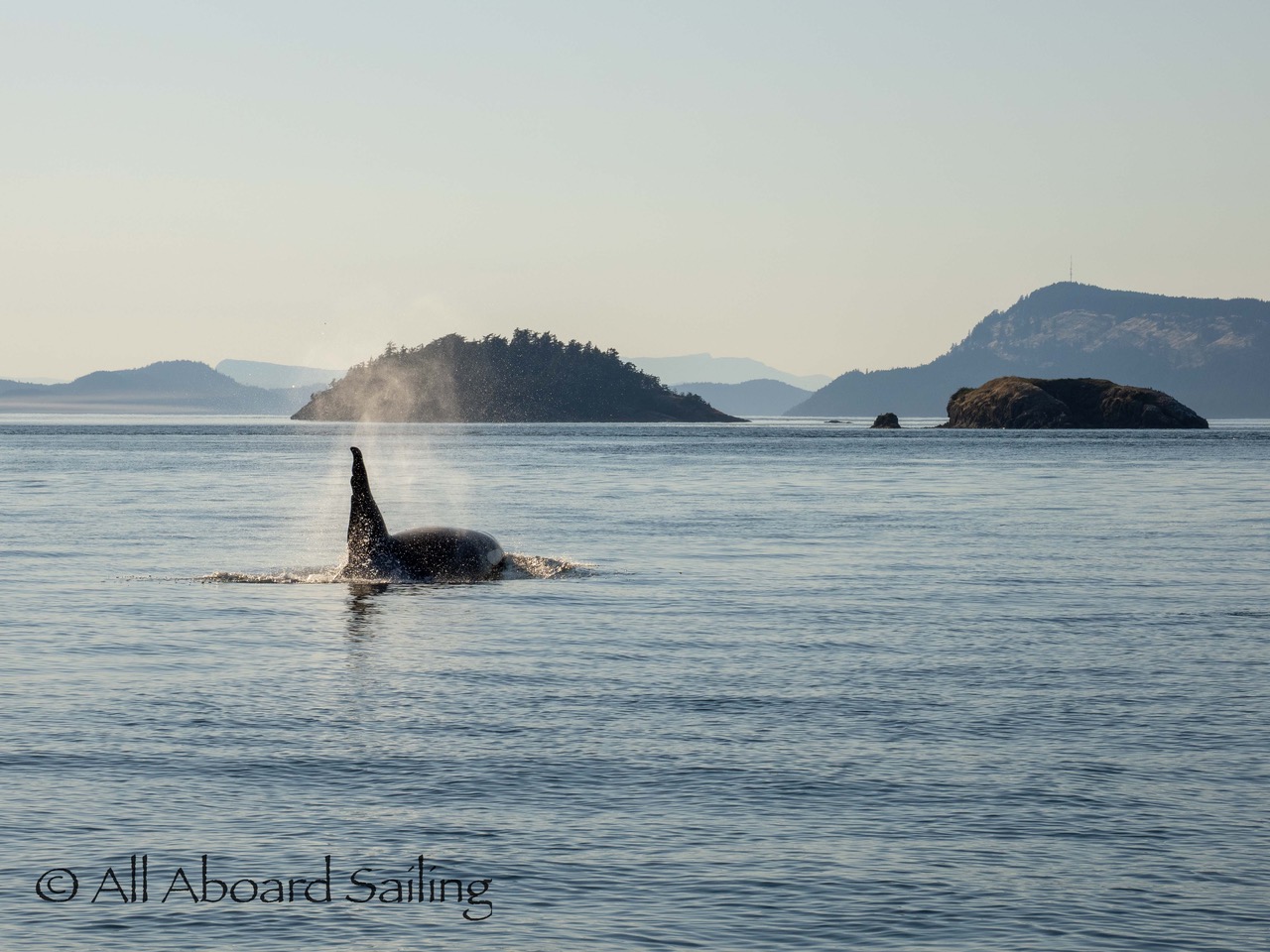 August 24, 2025 – With news of Biggs/Transient orcas T63 “Chainsaw” and mom T65 coming down President Channel we sailed north. We came through the Wasp Islands and Spring Pass and close to shore of Orcas Island up President Channel. The orcas had been hunting in Lovers Cove but when we were a mile out they took off to the north at speed. We met them as they approached Pt Hammond on Waldron Island and after two sets of surfacings they began hunting a harbor seal. Long dives with Chainsaw down for an extended time before lunges at the surface. Backwards swimming indicated success. We continued to Bare Island and Skipjack Island as the orcas continued west. The harbor seals on Skipjack were clearly aware of their presence. We returned by way of White Rock and the west side of Jones Island through sunset.