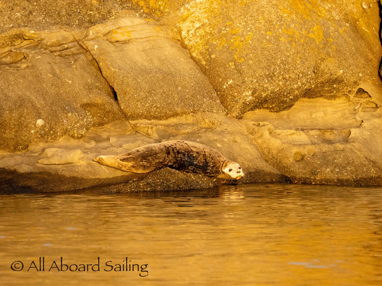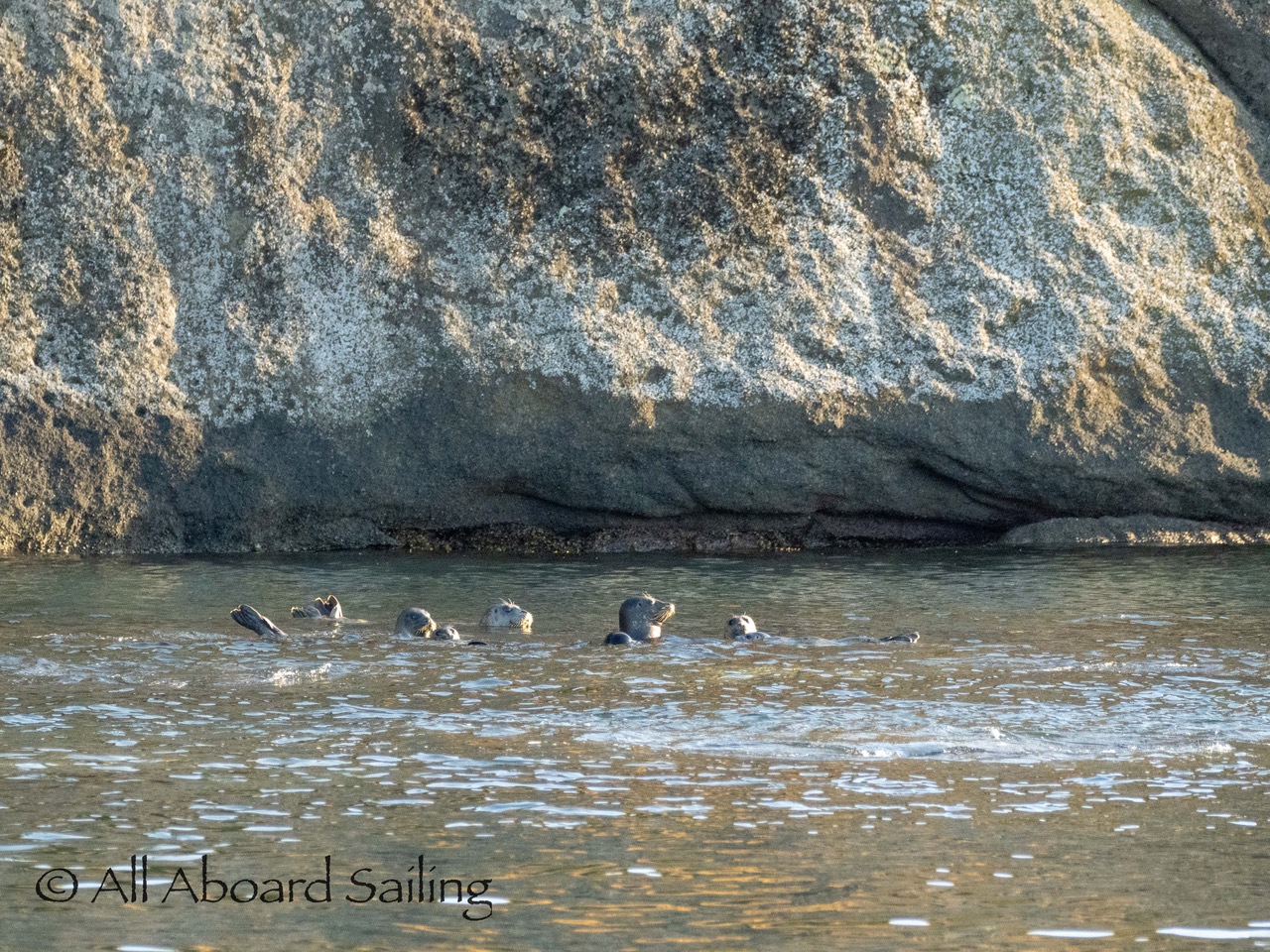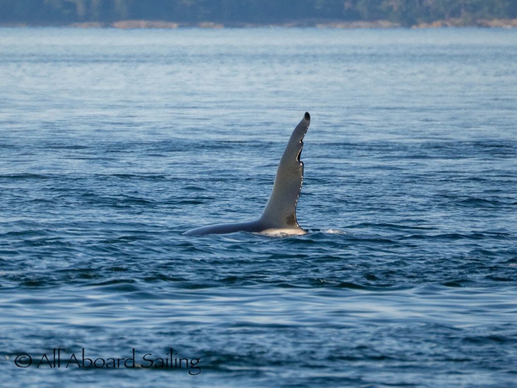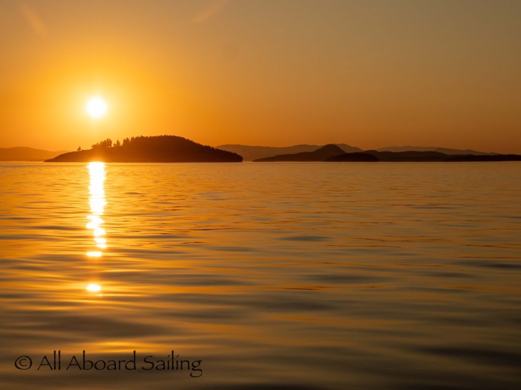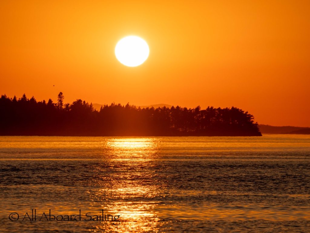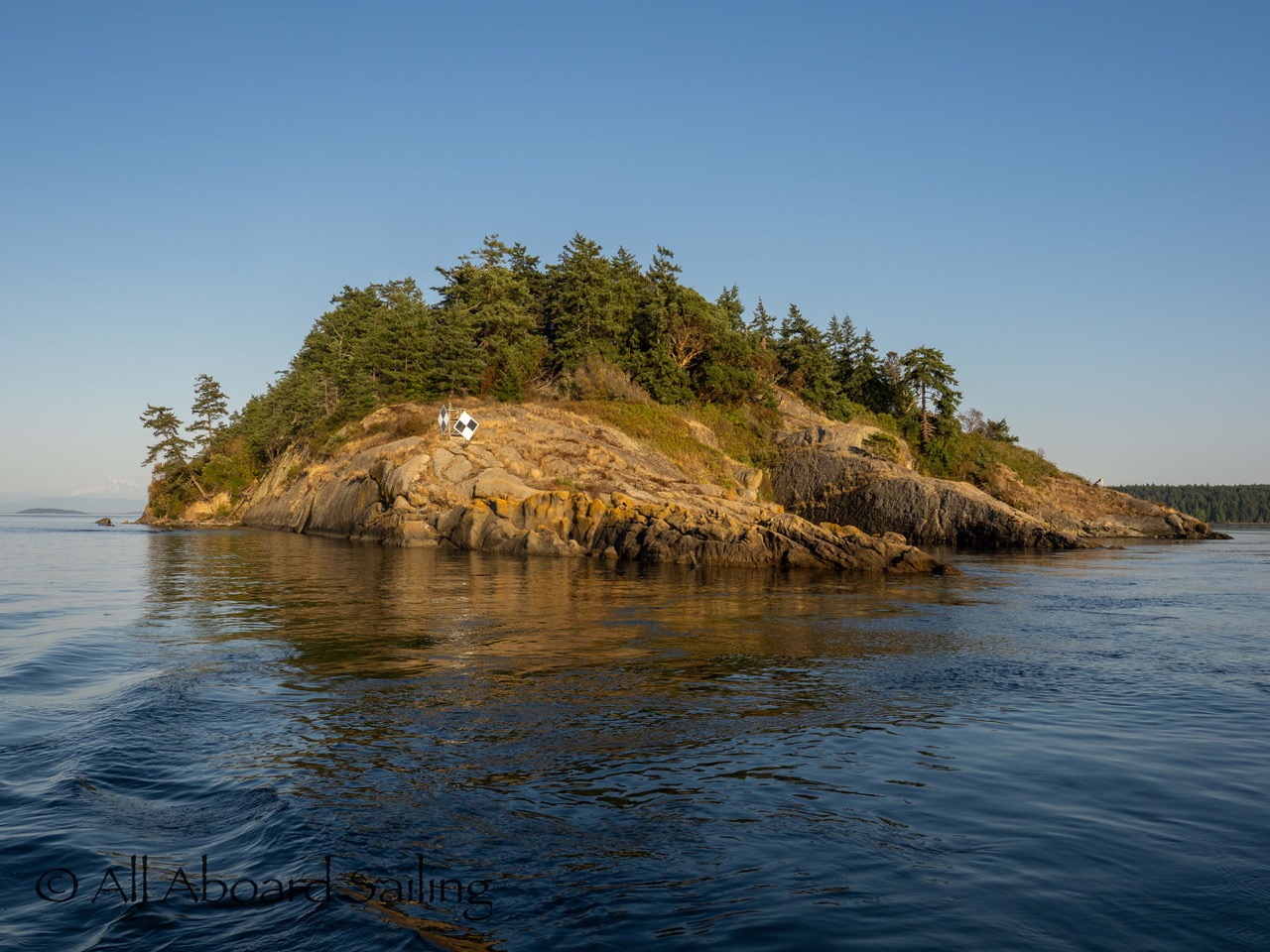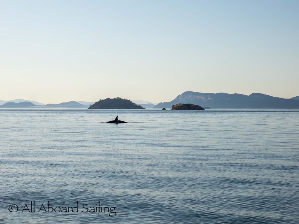 August 24, 2025 – With news of Biggs/Transient orcas T63 “Chainsaw” and mom T65 coming down President Channel we sailed north. We came through the Wasp Islands and Spring Pass and close to shore of Orcas Island up President Channel. The orcas had been hunting in Lovers Cove but when we were a mile out they took off to the north at speed. We met them as they approached Pt Hammond on Waldron Island and after two sets of surfacings they began hunting a harbor seal. Long dives with Chainsaw down for an extended time before lunges at the surface. Backwards swimming indicated success. We continued to Bare Island and Skipjack Island as the orcas continued west. The harbor seals on Skipjack were clearly aware of their presence. We returned by way of White Rock and the west side of Jones Island through sunset.