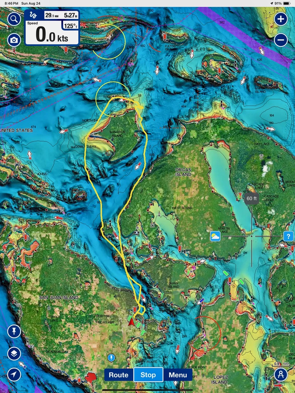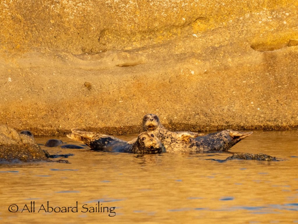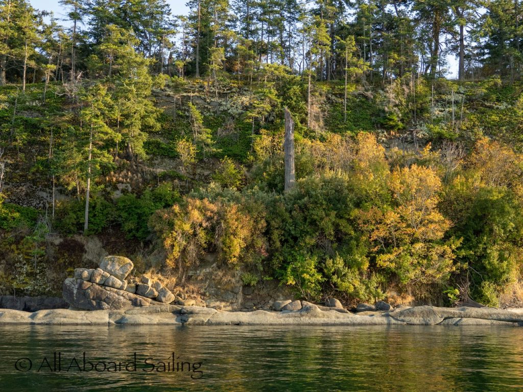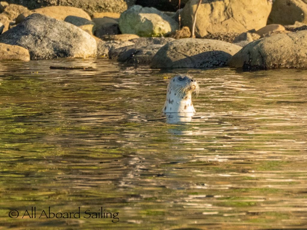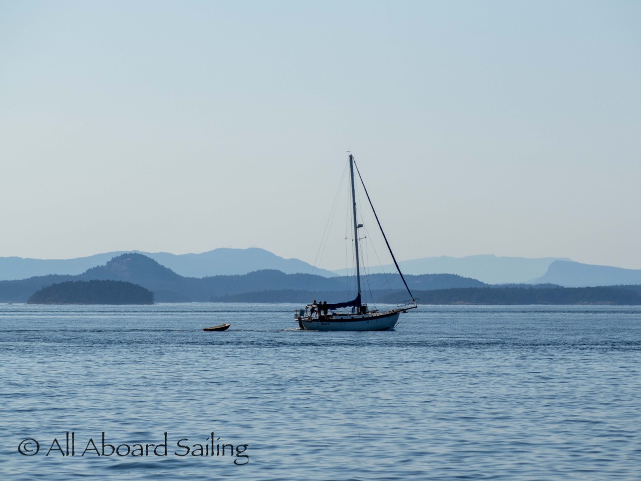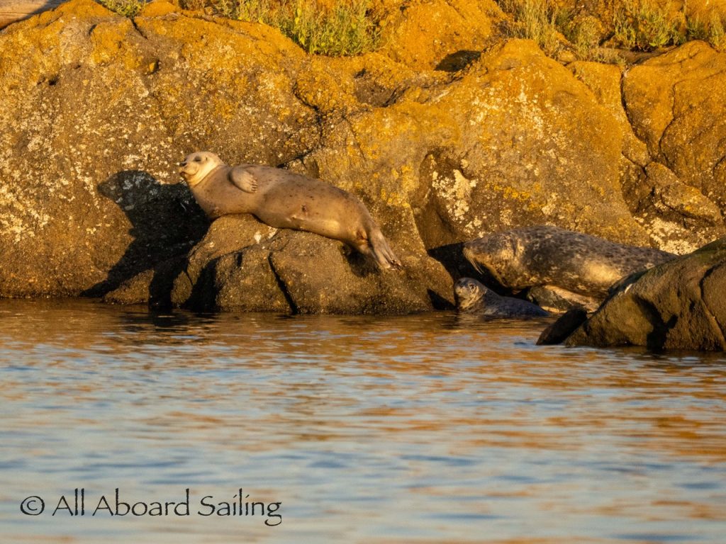 August 24, 2025 – With news of Biggs/Transient orcas T63 “Chainsaw” and mom T65 coming down President Channel we sailed north. We came through the Wasp Islands and Spring Pass and close to shore of Orcas Island up President Channel. The orcas had been hunting in Lovers Cove but when we were a mile out they took off to the north at speed. We met them as they approached Pt Hammond on Waldron Island and after two sets of surfacings they began hunting a harbor seal. Long dives with Chainsaw down for an extended time before lunges at the surface. Backwards swimming indicated success. We continued to Bare Island and Skipjack Island as the orcas continued west. The harbor seals on Skipjack were clearly aware of their presence. We returned by way of White Rock and the west side of Jones Island through sunset.