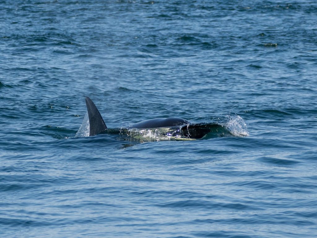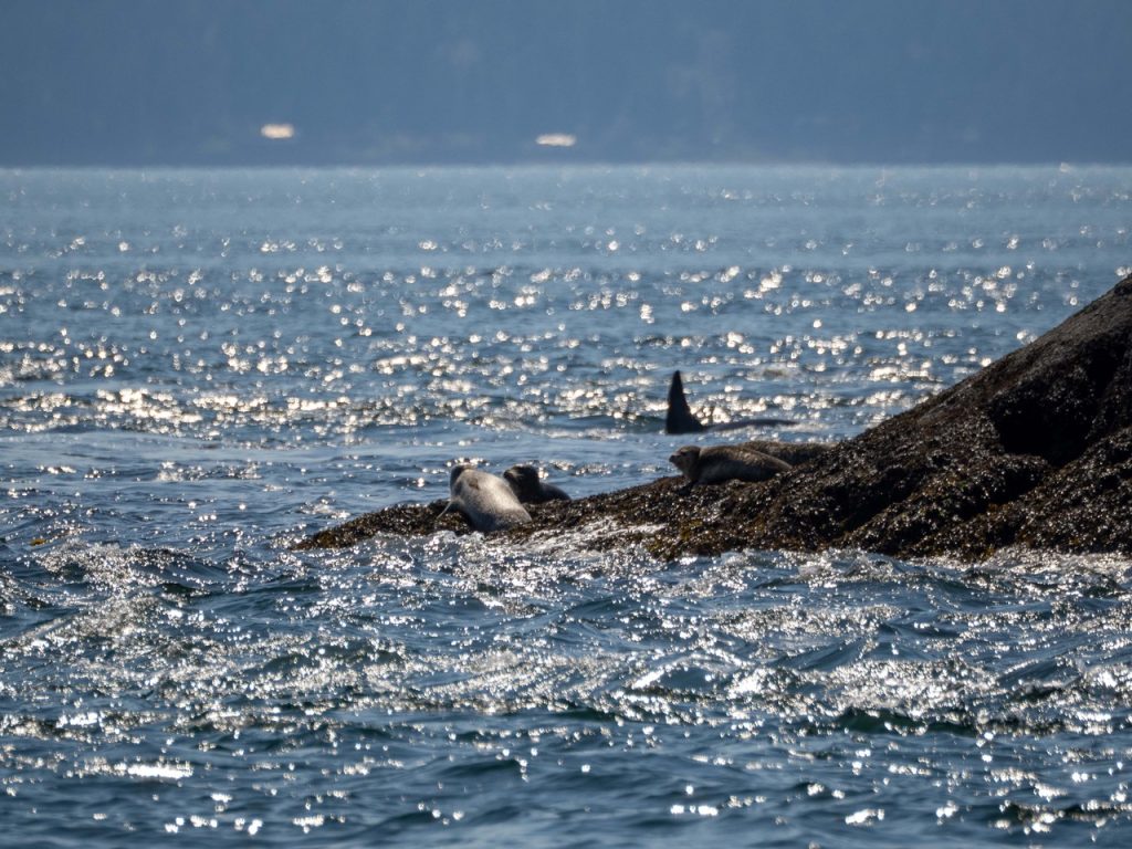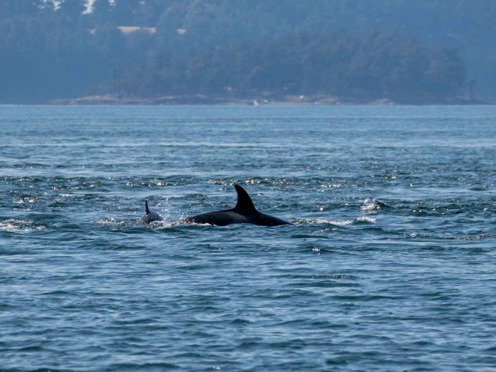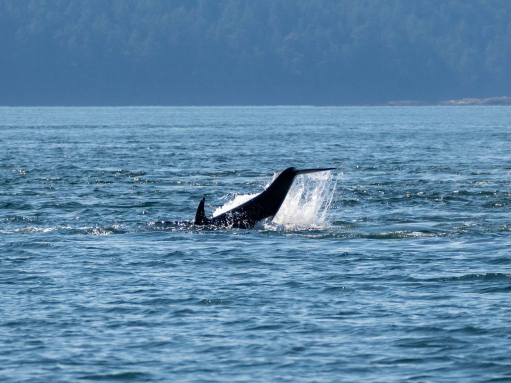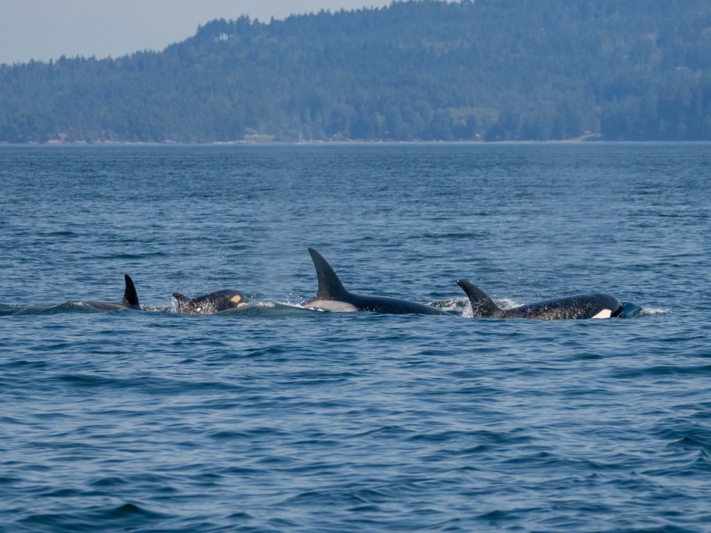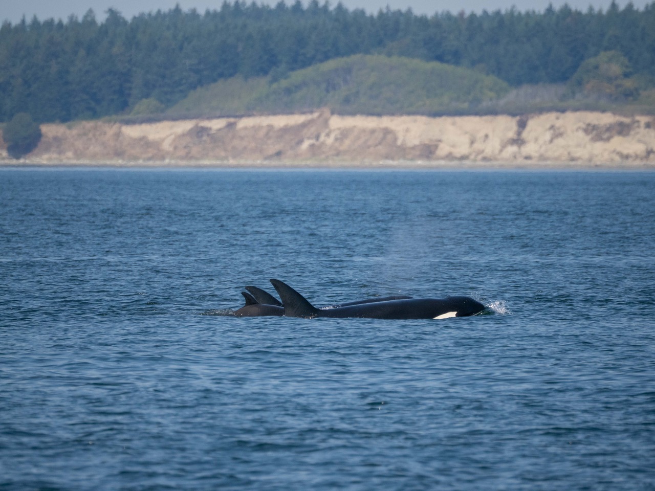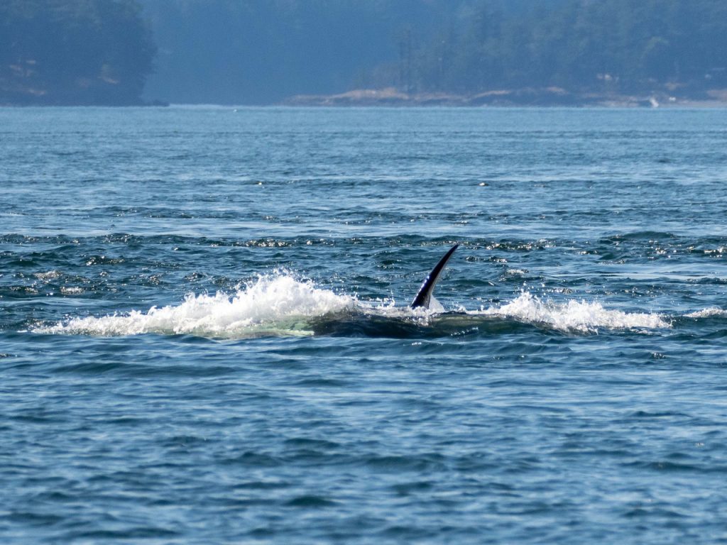 August 26, 2025 – With a report of Biggs/Transient orcas known as the T75B’s in Boundary Pass we headed north. We came through the Wasp Islands seeing harbor seals hauled out in the warm sun. Hugged the north side of Orcas Island up President Channel to Lovers Cove and rode the ebb tide across to Pt Disney. After stopping to hunt near Skipjack Island the orcas traveled southwest towards Sandy Pt where we met them. It was our first time seeing the newest family member in the T75B’s who is less than 2 months old now designated as T75B5. They stopped to hunt a harbor seal at White Rock with multiple tail slaps and a spy hop. After their hunt they rode the treadmill at the bottom of President Channel in resting mode. We sailed back to Flattop Island viewing many harbor seals on the honeycombed sandstone shoreline. Returning back to Friday Harbor we passed the orcas again which were now southbound in San Juan Channel still in resting mode. They ended up circling Jones and heading north in President Channel.
