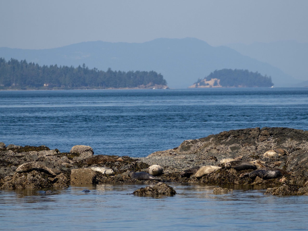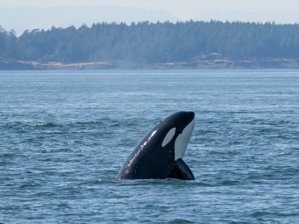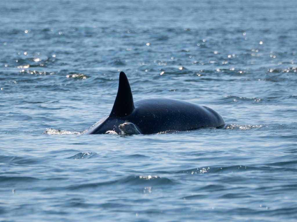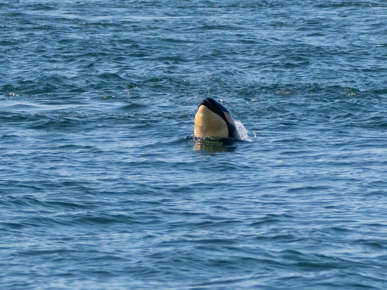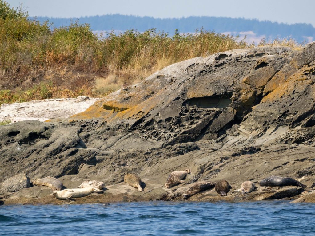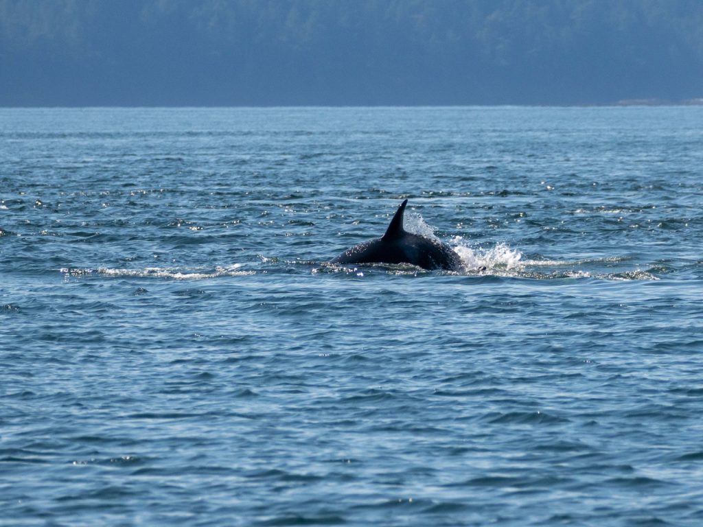 August 26, 2025 – With a report of Biggs/Transient orcas known as the T75B’s in Boundary Pass we headed north. We came through the Wasp Islands seeing harbor seals hauled out in the warm sun. Hugged the north side of Orcas Island up President Channel to Lovers Cove and rode the ebb tide across to Pt Disney. After stopping to hunt near Skipjack Island the orcas traveled southwest towards Sandy Pt where we met them. It was our first time seeing the newest family member in the T75B’s who is less than 2 months old now designated as T75B5. They stopped to hunt a harbor seal at White Rock with multiple tail slaps and a spy hop. After their hunt they rode the treadmill at the bottom of President Channel in resting mode. We sailed back to Flattop Island viewing many harbor seals on the honeycombed sandstone shoreline. Returning back to Friday Harbor we passed the orcas again which were now southbound in San Juan Channel still in resting mode. They ended up circling Jones and heading north in President Channel.