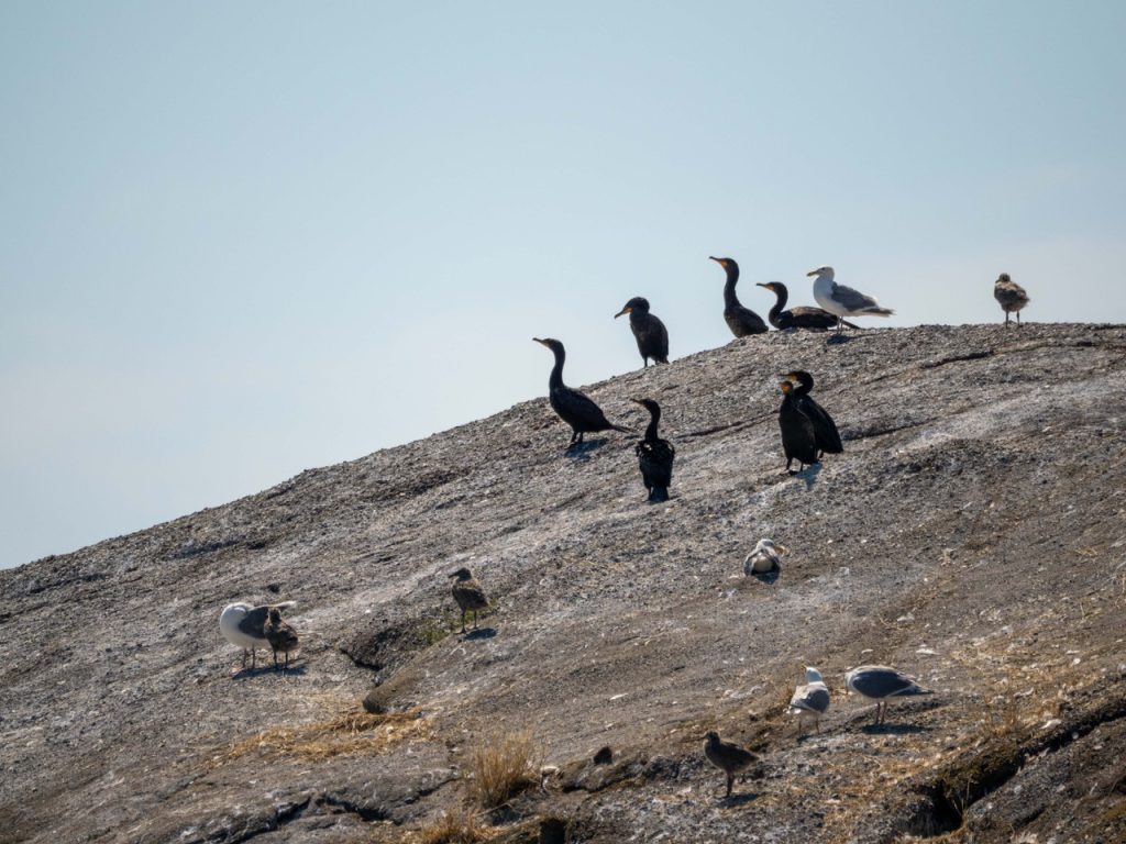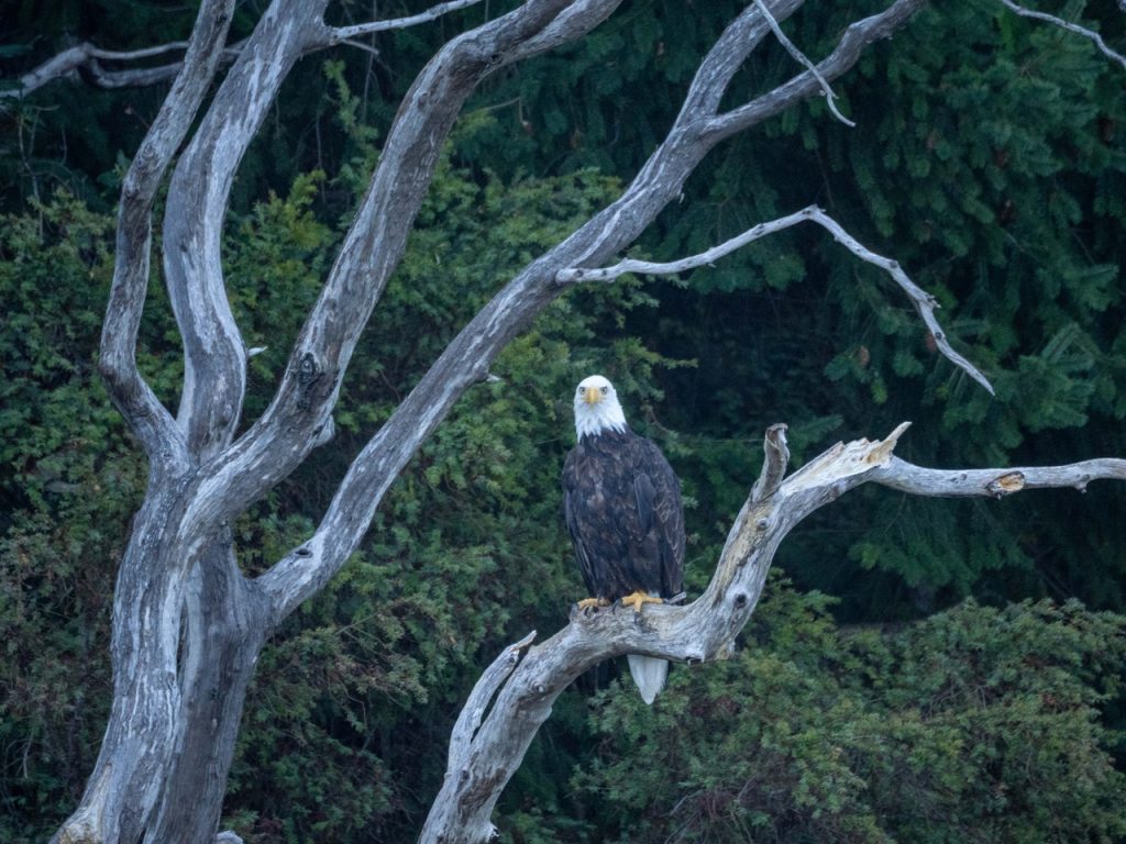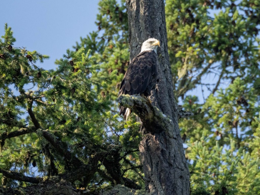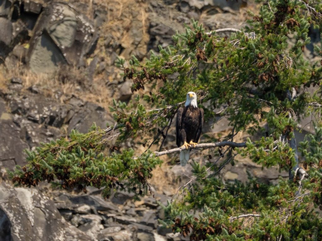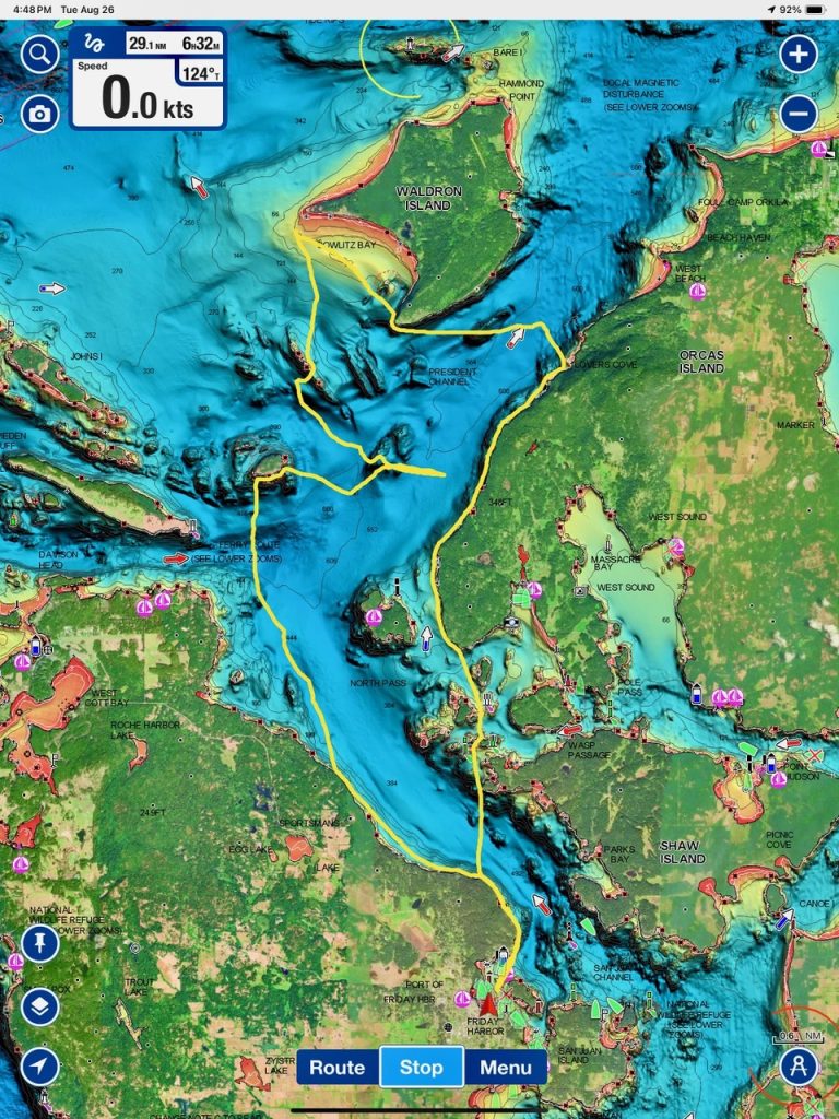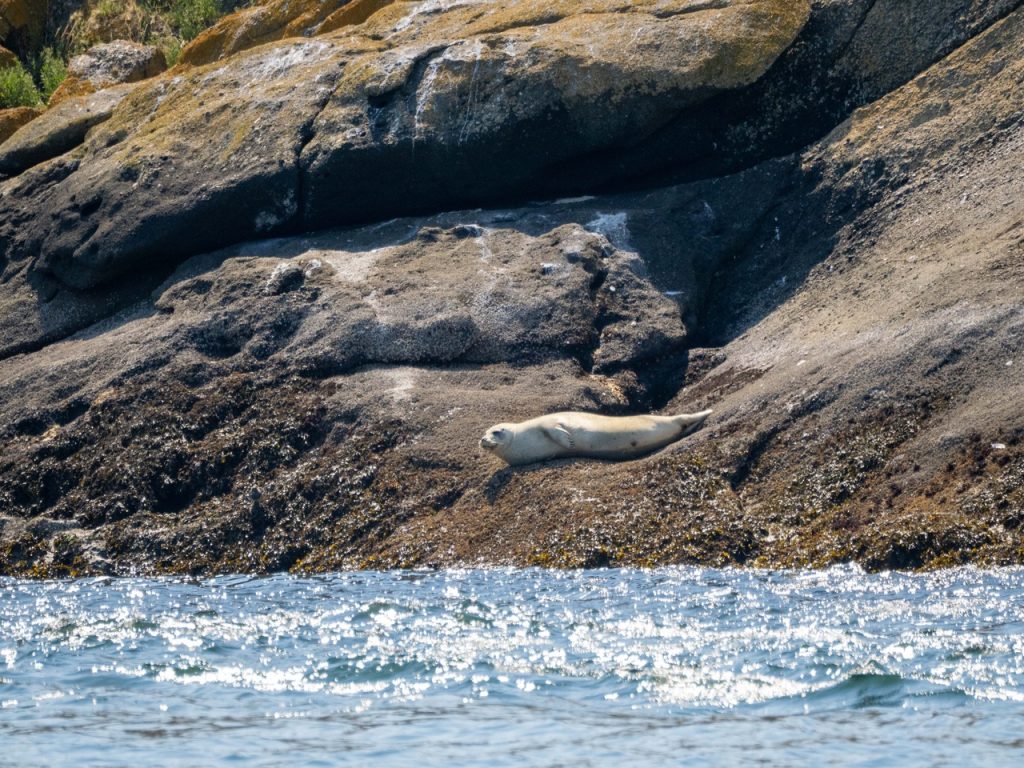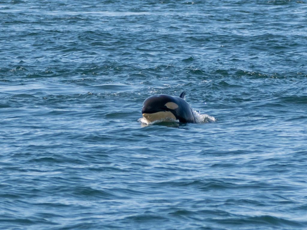 August 26, 2025 – With a report of Biggs/Transient orcas known as the T75B’s in Boundary Pass we headed north. We came through the Wasp Islands seeing harbor seals hauled out in the warm sun. Hugged the north side of Orcas Island up President Channel to Lovers Cove and rode the ebb tide across to Pt Disney. After stopping to hunt near Skipjack Island the orcas traveled southwest towards Sandy Pt where we met them. It was our first time seeing the newest family member in the T75B’s who is less than 2 months old now designated as T75B5. They stopped to hunt a harbor seal at White Rock with multiple tail slaps and a spy hop. After their hunt they rode the treadmill at the bottom of President Channel in resting mode. We sailed back to Flattop Island viewing many harbor seals on the honeycombed sandstone shoreline. Returning back to Friday Harbor we passed the orcas again which were now southbound in San Juan Channel still in resting mode. They ended up circling Jones and heading north in President Channel.